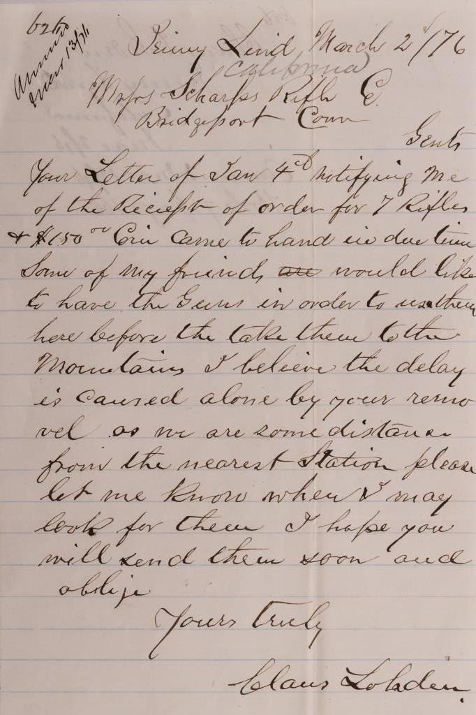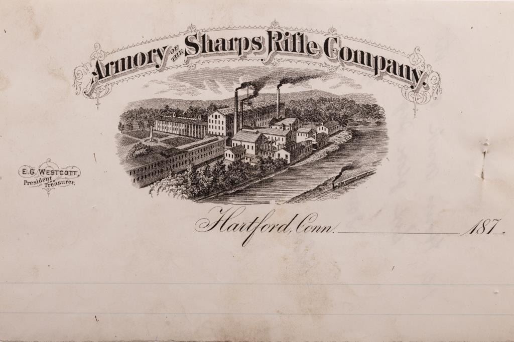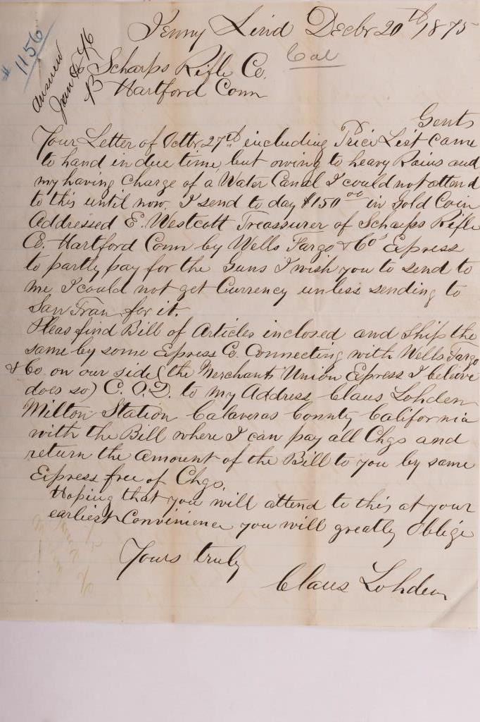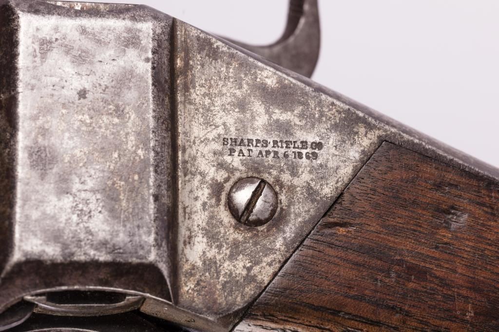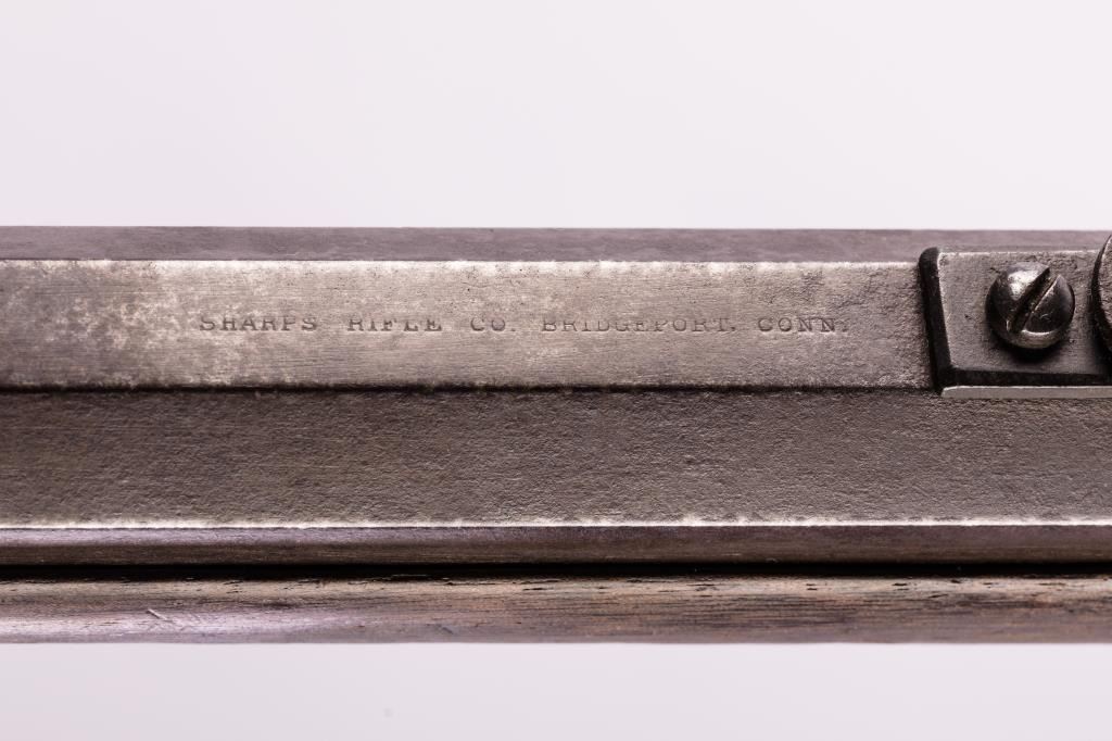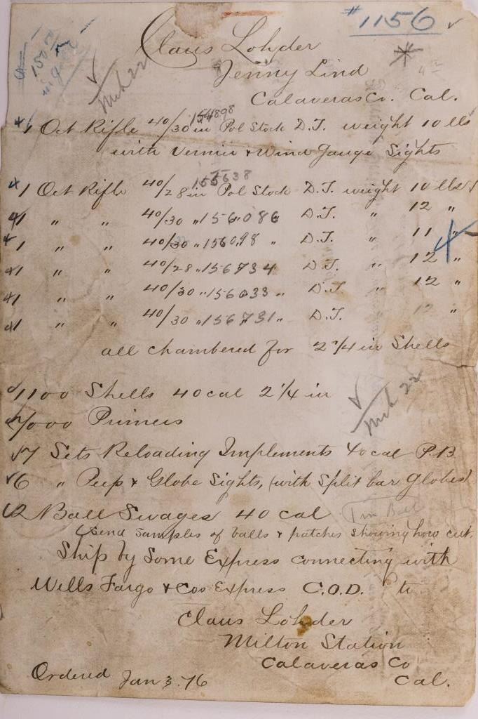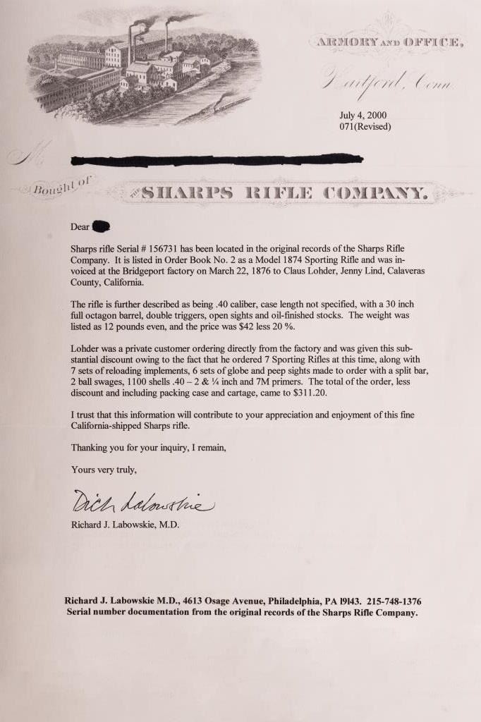 Sharps Model 1874 Sporting rifle, .40 caliber, 30” octagon barrel, 12 pounds in weight, double set triggers (working at time of description), wood stocks, S/N 156731; accompanied by factory letter dated July 4, 2000, confirming caliber, barrel length and weight; with invoicing at the Bridgeport factory on March 22, 1876 to Claus Lohder, Jenny Lind, Calaveras County, California. The letter further states “Lohder was a private customer ordering directly from the factory and was given this substantial discount ($42 less 20%) owing to the fact that he ordered 7 Sporting Rifles at this time, along with 7 sets of reloading implements, 6 sets of globe and peep sights made to order with a split bar, 2 ball swages, 1100 shells .40 – 2-1/4 inch and 7M primers. The total of the order, less discount and including packing case and cartage, came to $311.20”. Also included with this lot are 6 ORIGINAL very rare letters between Lohder and the Sharps Factory including the original order! The Sharps is in overall good condition with an even brown patina to metal surfaces, crisp action, good markings, good bore with some areas of light pitting and overall good wood showing some scattered mars and scratches with expected wear from handling and carry. Amazing period documentation! (Antique). Est.: $5,000-$10,000.