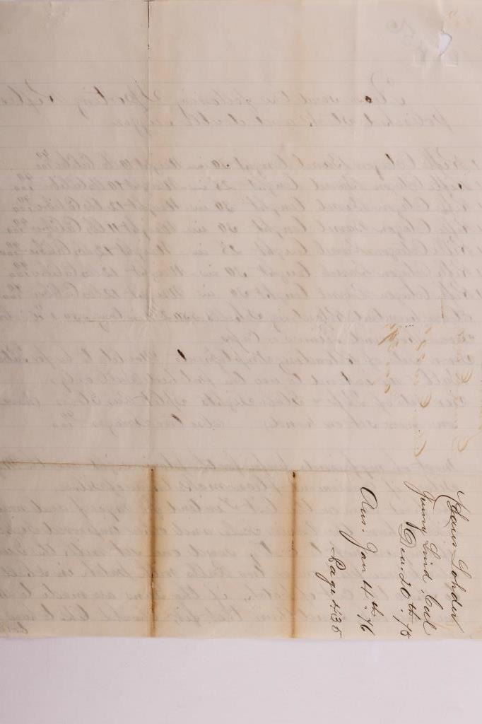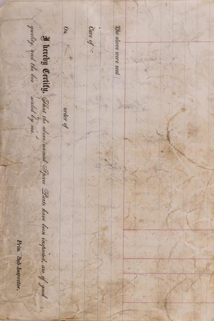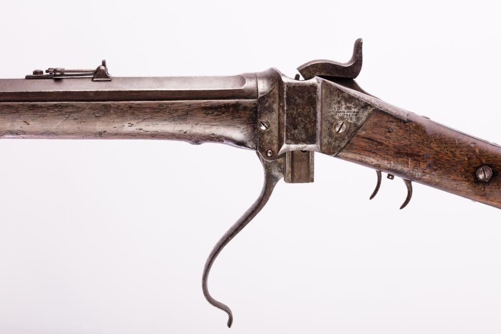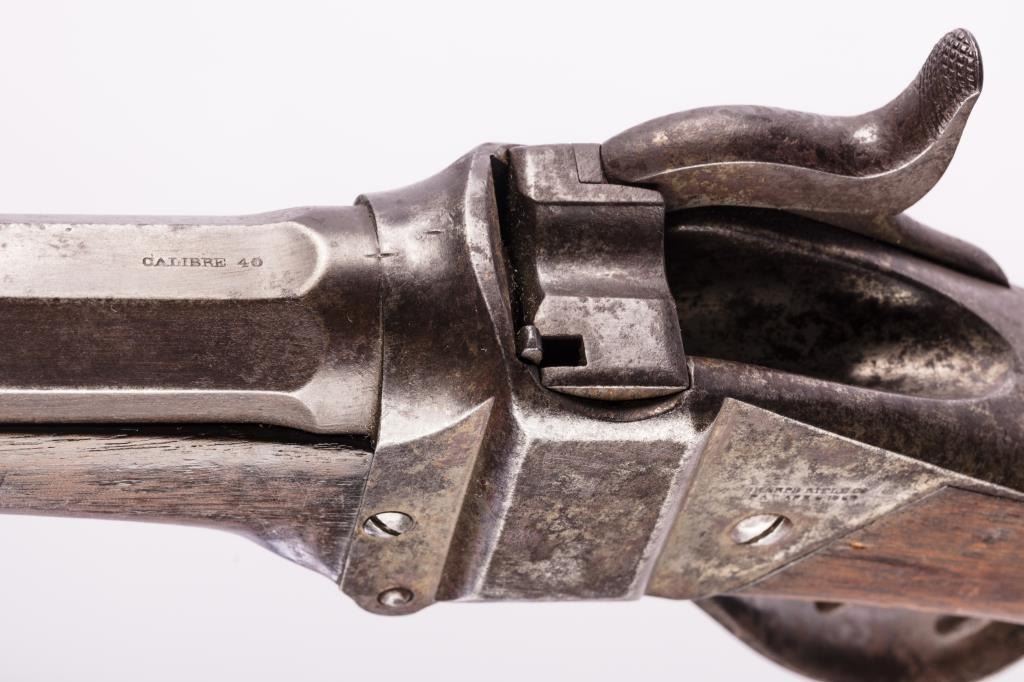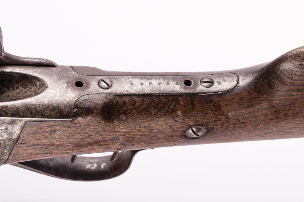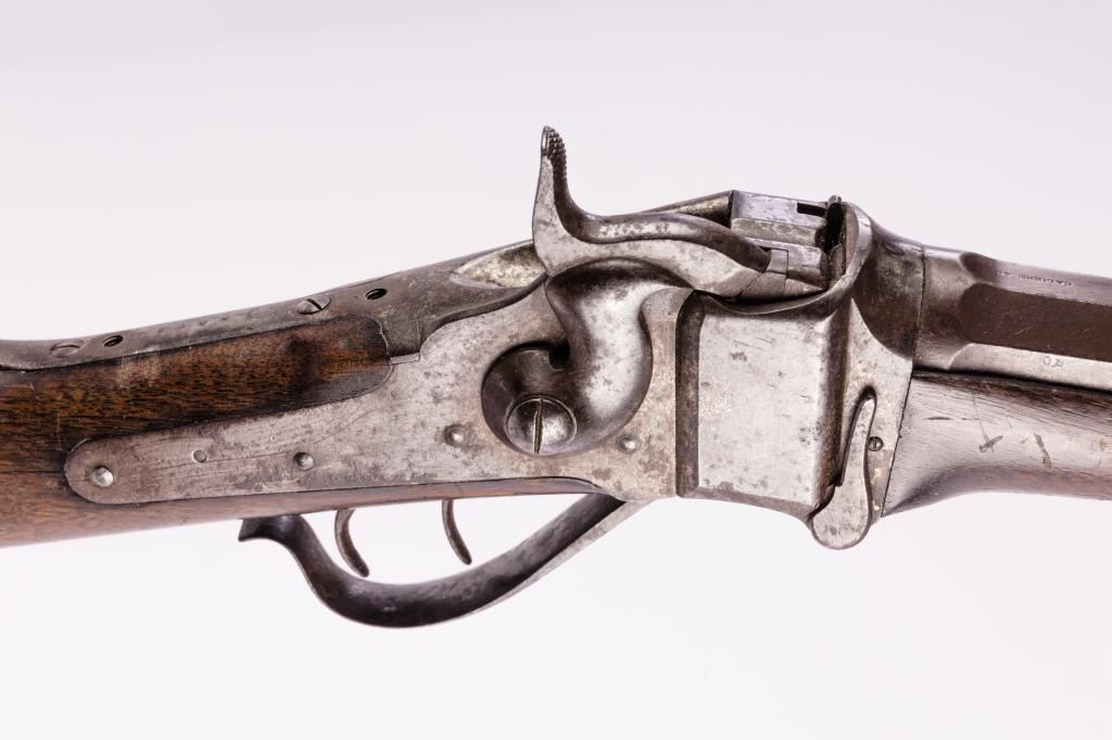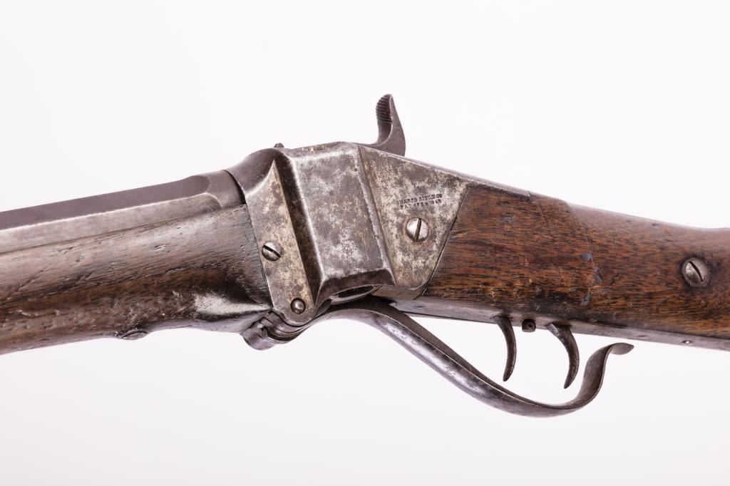 Sharps Model 1874 Sporting rifle, .40 caliber, 30” octagon barrel, 12 pounds in weight, double set triggers (working at time of description), wood stocks, S/N 156731; accompanied by factory letter dated July 4, 2000, confirming caliber, barrel length and weight; with invoicing at the Bridgeport factory on March 22, 1876 to Claus Lohder, Jenny Lind, Calaveras County, California. The letter further states “Lohder was a private customer ordering directly from the factory and was given this substantial discount ($42 less 20%) owing to the fact that he ordered 7 Sporting Rifles at this time, along with 7 sets of reloading implements, 6 sets of globe and peep sights made to order with a split bar, 2 ball swages, 1100 shells .40 – 2-1/4 inch and 7M primers. The total of the order, less discount and including packing case and cartage, came to $311.20”. Also included with this lot are 6 ORIGINAL very rare letters between Lohder and the Sharps Factory including the original order! The Sharps is in overall good condition with an even brown patina to metal surfaces, crisp action, good markings, good bore with some areas of light pitting and overall good wood showing some scattered mars and scratches with expected wear from handling and carry. Amazing period documentation! (Antique). Est.: $5,000-$10,000.