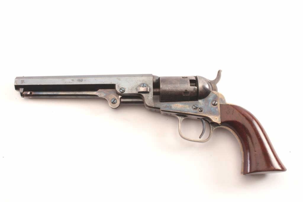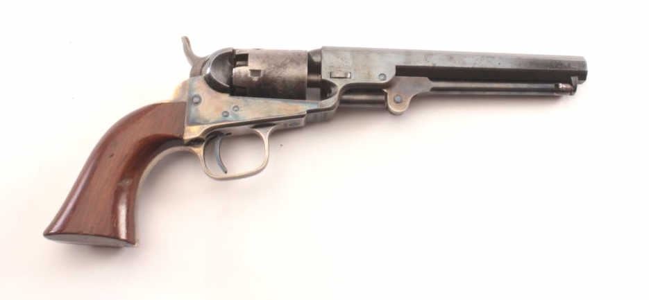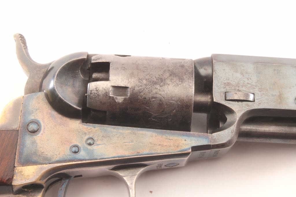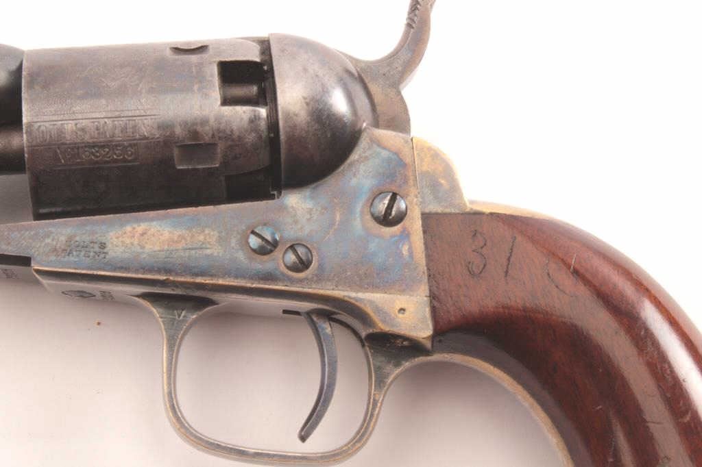 Colt Model 1849 Pocket Model in .31 caliber percussion with 6” barrel remaining in excellent original condition, S/N 163258 and made 1860. Two line address with 5 shot cylinder. This Colt shows 80%-90% bright and“Inky” blue finish with some minor drifting, light scratches and beginning age. The cylinder shows 60%-70% original bright blue with virtually all its scene. The frame and rammer show 90%-95% bright and fiery original vivid case colors. 30%-50% silver (Darkened) on straps. The grips show 90% plus original varnish with only minor imperfections and 1 notable scratch on right side. All matching visible numbers and sharp overall. The action is tight and the pistol shows very little use or aging. Suitable for casing. A strong 9+ on a 1-10 scale. (Antique) Est.: $3000-$6000