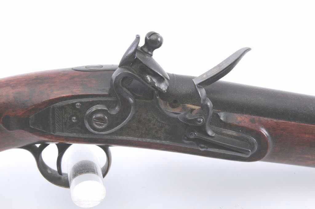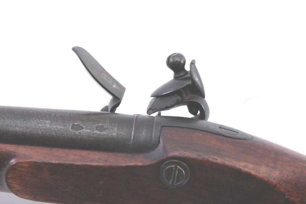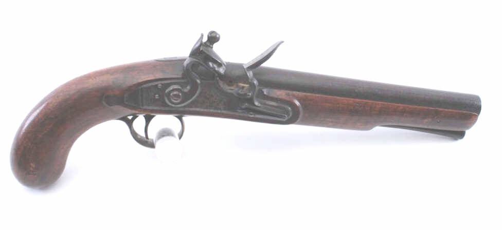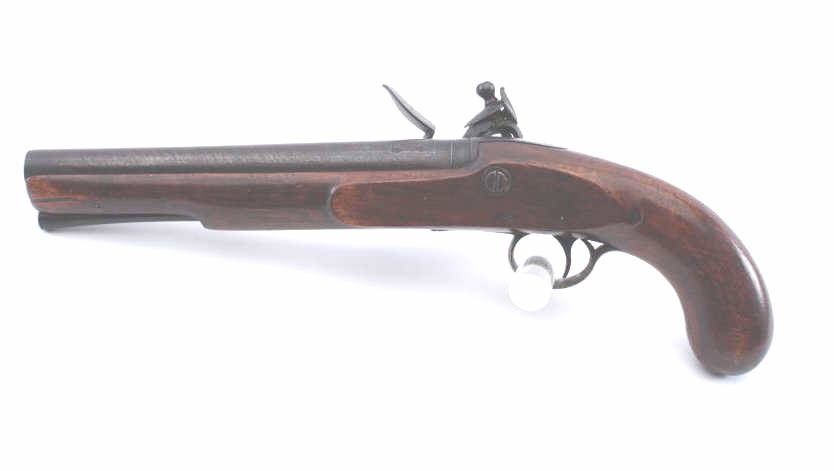 American flintlock pistol of military style with “Kentucky” wood showing striped walnut. No side plate or fore end cap. Simple engraved brass guard with odd America finial at top. Circa 1790 to early 1800s. Measures15” overall with a 9” barrel in approximately .69 caliber. Est.: $1500-$3000