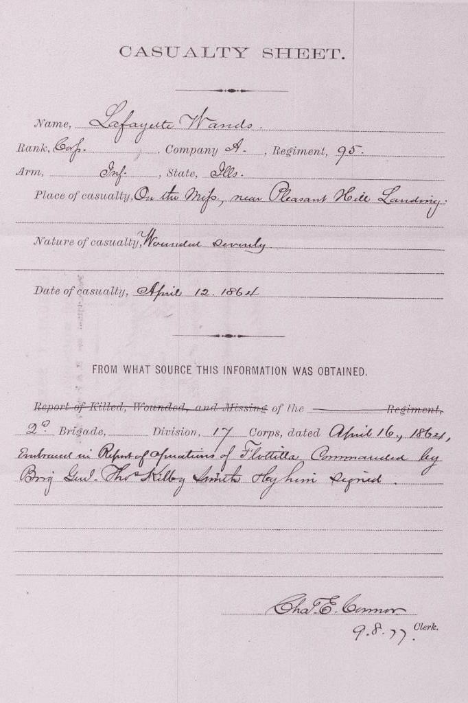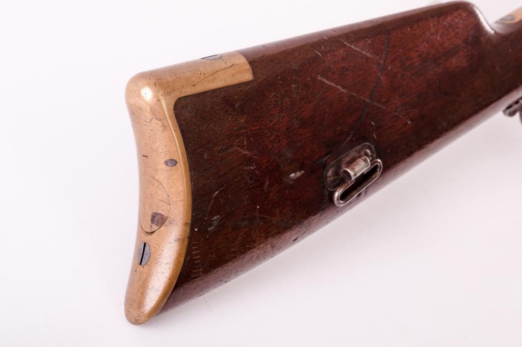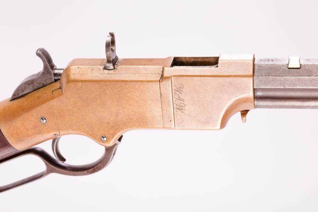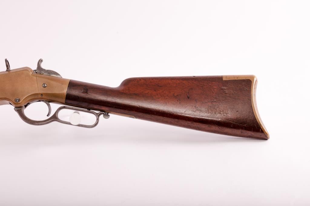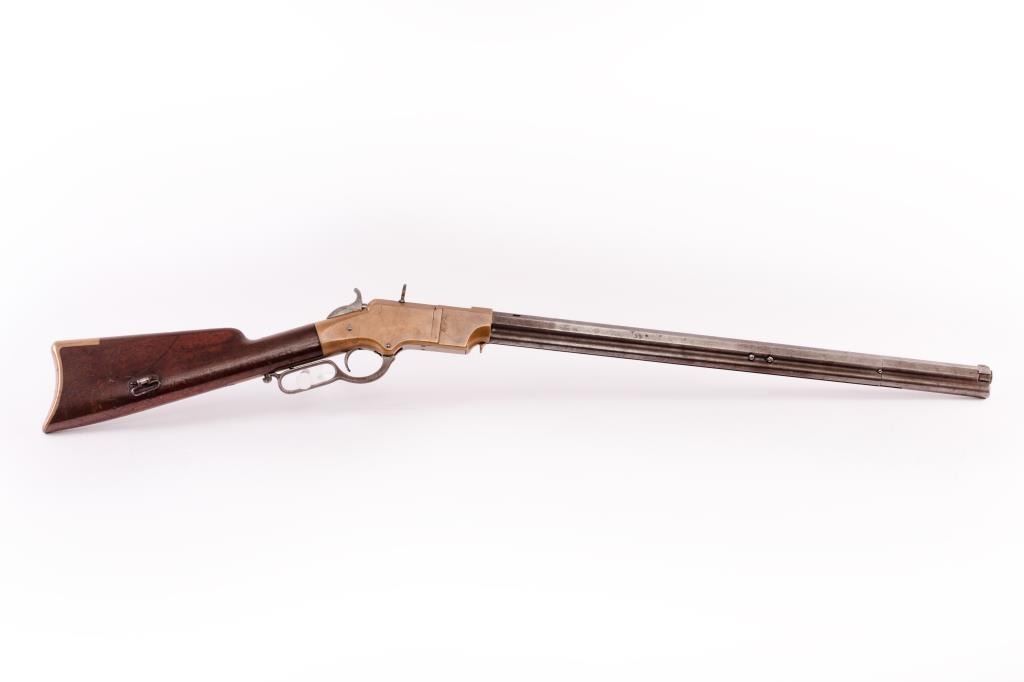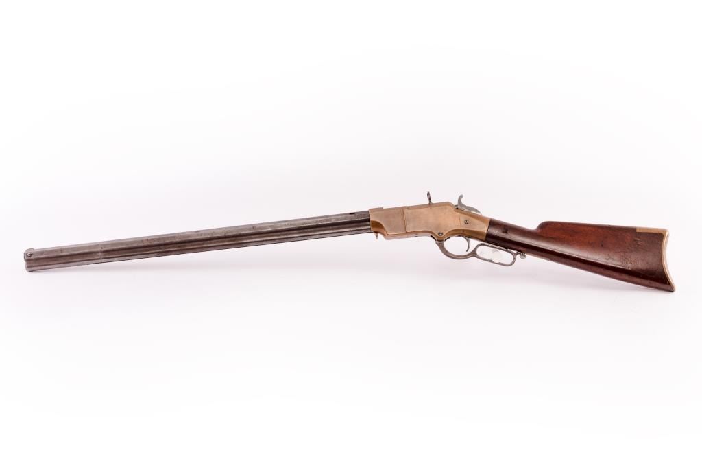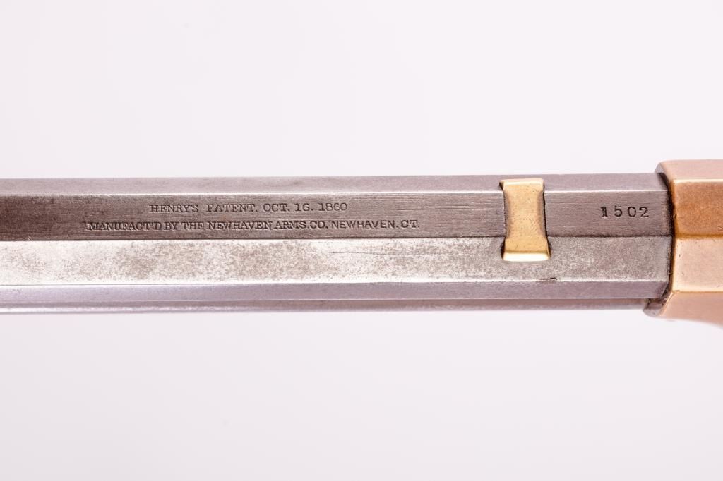 Early Henry lever action rifle, S/N 1502, .44RF caliber, 24” barrel, brass frame, wood stocks; directly from the family of Civil War Union soldier Lafayette Wands (1824-1890), 95th Illinois Infantry, to our consignor through Little John’s May, 2012 auction. Accompanying this Henry is a three ring binder including the lineage of the gun’s movement through the Wands family, additional copies of information on the history of several Wands family members as well as copies of U.S. National Archives military and pension records. Lafayette Wands enlisted as a Private on Aug. 6, 1862, was mustered into Co. “A” of the 95th on Sept. 4, 1862, and was mustered out on Aug. 17, 1865. The 95th Illinois Infantry served primarily in the Southern theater of the Civil War having been involved with Grant’s operations against the Confederacy including the Vicksburg campaign, battles in Louisiana, Mississippi and Alabama including participation in the battles of Kennesaw Mountain, Chattahoochee River, Atlanta, Ezra Church, Jonesboro and Lovejoy’s Station. On April 12, 1864, at Red River, Louisiana, Lafayette Wands was wounded in action with a gunshot to the left knee but later returned to his unit. The condition of this Henry rifle is overall good to very good condition displaying approximately 20% original blue mixed with a browning patina, some scattered light to moderate erosion, pinprick pitting; good sharp barrel address, crisp edges with beautiful frame showing a honey color patina with sharp edges and tight sideplates. The rear sight dovetail has been filled with a handmade brass blank. An antique and genuine to-the-period oversized buckhorn sight has been placed in the rear sight dovetail and shows three peen marks to hold the sight tight. The stock is good to very good with 30-50% varnish, some scratches, mars, one or two significant gouges or marks and great wood-to-metal fit. The butt stock and butt plate match; the hammer and lever show mottled case hardening. The front swivel has been removed and the original screws are in their proper positions in the barrel; the rear swivel is in its proper location. The action is good, the bore is good to very good. A 4-piece Winchester cleaning rod of a later vintage is in the butt trap. An exceptionally good and untouched early Henry with great Civil War history! (Antique). Est.: $20,000-$30,000.