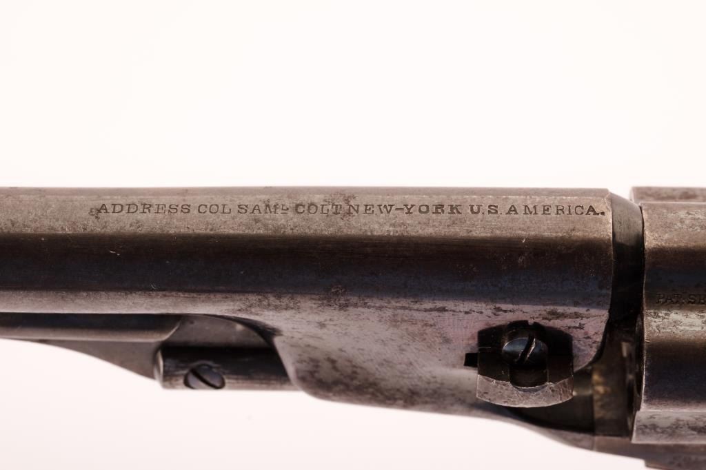 This pistol shows 75%-85% of its original blue and case colors naturally aging and toning. Minor areas of erosion and slight scratches. The markings are sharp and deluxe varnished grips are almost fine. The back strap shows an uncleaned and lovely dark patina with absolutely genuine inscription. The case is very good plus with minor aging and fading. The flask is also very good with 50% plus original lacquer and bright blue on spring. The “36 P” marked mold shows 75% plus blue with unused cavities. Eley Brothers cap tin included and marked “Belt and Pocket pistols. The exterior of the box is good to very good with minor scratches, dings and mars. Original Sam Colt inscribed arms are considered the zenith in percussion Colt collecting and this is a well-known example to the arms fraternity. (Antique) Est.: $17,500-$35,000