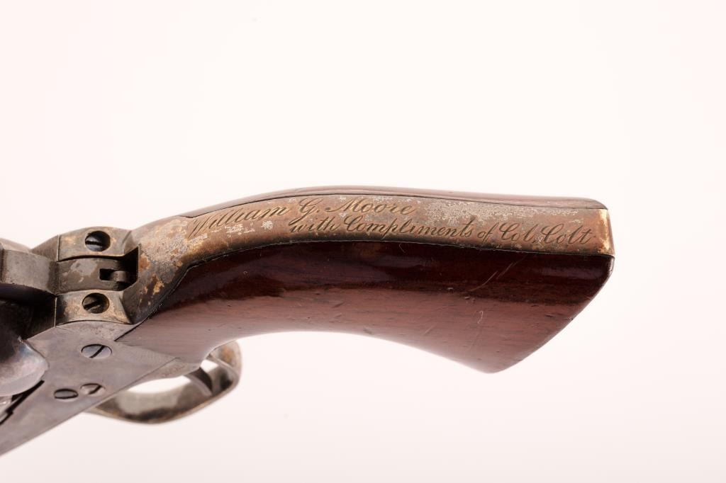 Colt 1862 Police inscribed “Wm. G. Moore, With Compliments of Col Colt”, S/N 7289. This Colt shows blue and case colors and is contained within it’s original to the period case with accessories. In the early 1860s Colt presented a number of inscribed pistols to the most influential generals and politicians in Washington. Wm G. Moore was secretary to Simon Cameron who was the Union’s secretary of war. Moore was a spectator at the 1st Battle of Bull Run where he picked up a rifle and bravely joined the fight. He received a commission in the National Rifles and Volunteers. In 1867 he was made Lt. Col in the U.S. Army and he served as private secretary to President Andrew Johnson and superintendent of Washington D.C. Police.