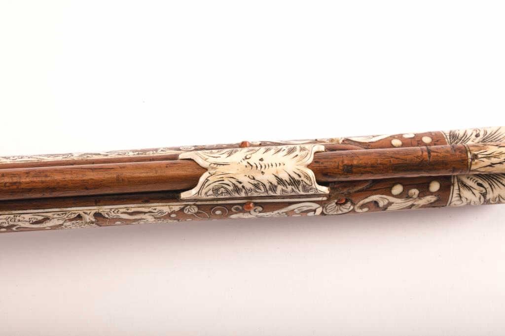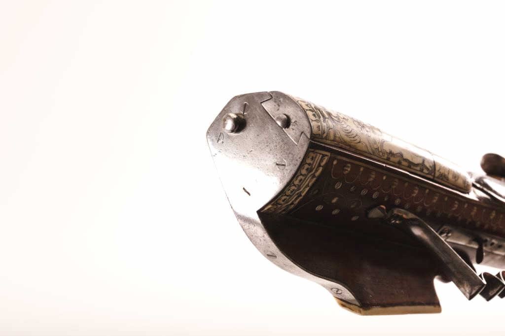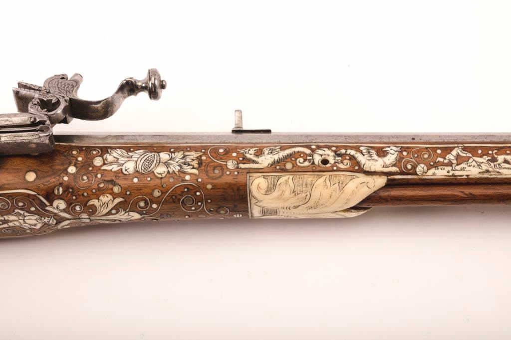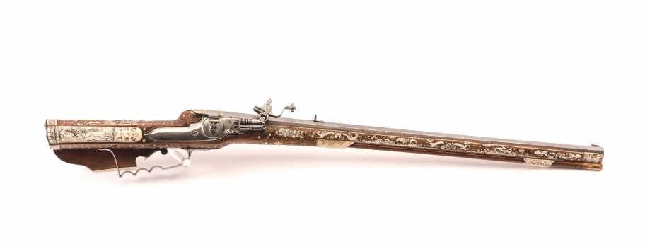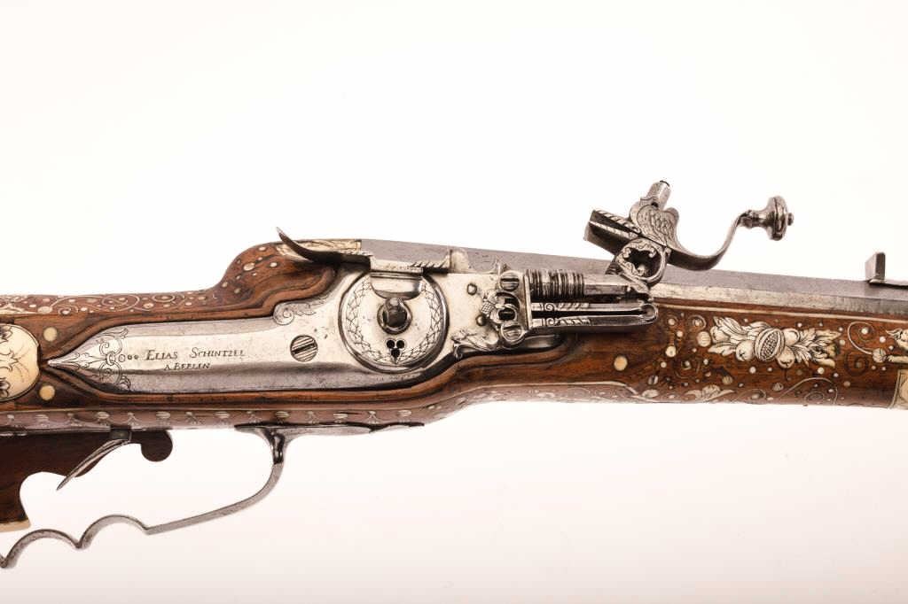 Fine original 17th century inlaid Wheelock rifle signed “Elias Schintzel A Berlin”. Measures 40 ½” overall with a 28 ½” barrel of .70 caliber smoothbore. Intricate bore inlay in game scenes with dot and scroll borders.Quality engraving and metal work. Very well-known and high grade German maker (see Shumway-Jaegar rifles). Near fine original condition with 98% plus original inlay intact. A terrific gun suitable forfinestcollection or museum. Interior lock parts intact with interior period spanner. (Antique) Est.: $17,500-$35,000