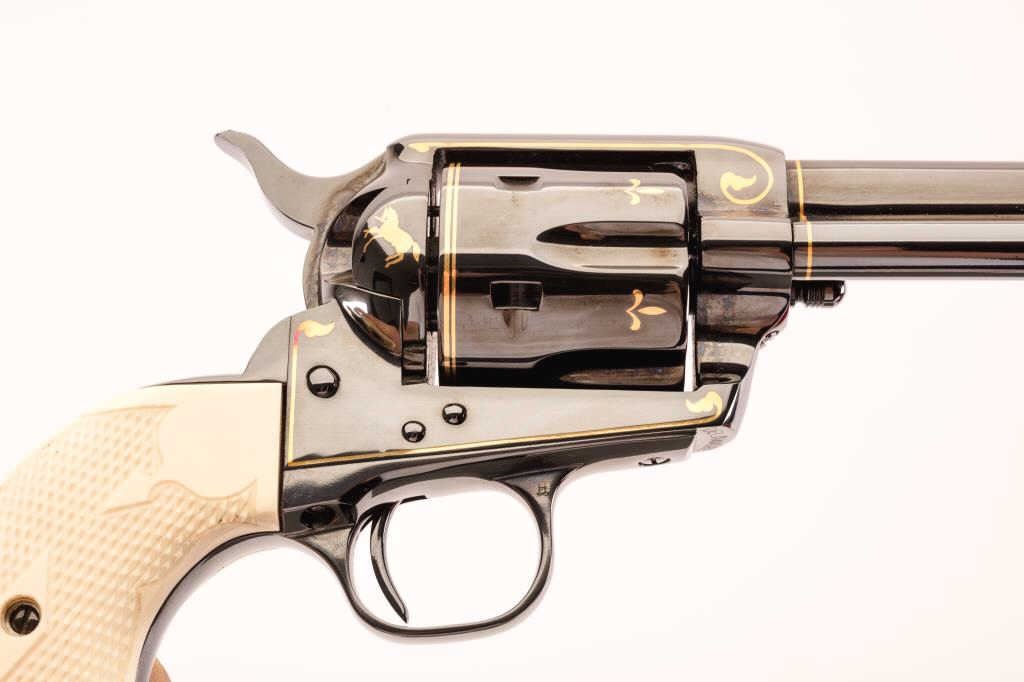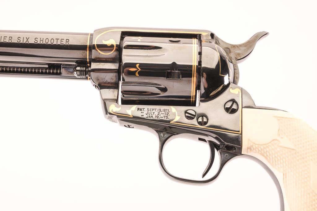Colt SAA Revolver in .44-40 caliber with a 7 ½” barrel, factory gold inlaid U.S.A. Edition (1 for each state), S/N DELAWARE. Also black powder frame and patent dates. Royal blue finish. Checkered ivory screw less grips infactory U.S.A. presentation case. Excellent to mint with no evidence of firing or use. (C&R/No PPT) Est.: $4000-$8000