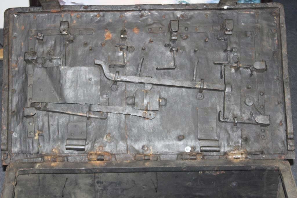 Spanish style treasure chest of forged steel circa 1650-1750. Measures approximately 21” tall x 31 ¼” wide. From the estate of Wm. Scollard noted Spanish Arms collector who had this chest in his Hacienda and obtained itin Portugal from museum curator Reiner Daneheart 1962. Santa Fe retail galleries $6,000-$12,000. Est.: $1500-$3000+++