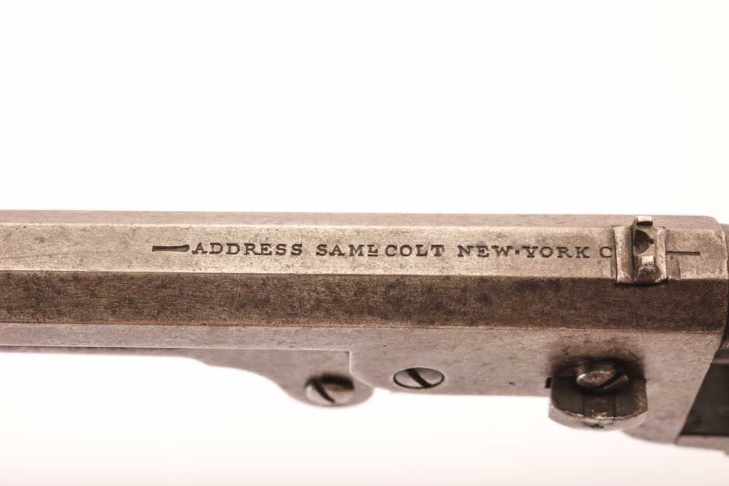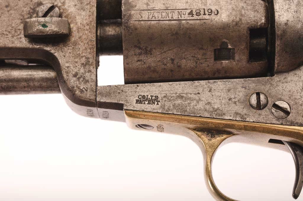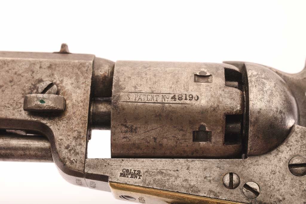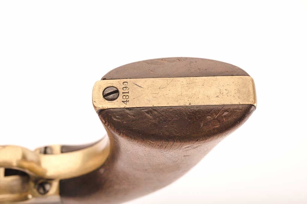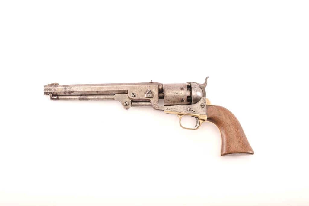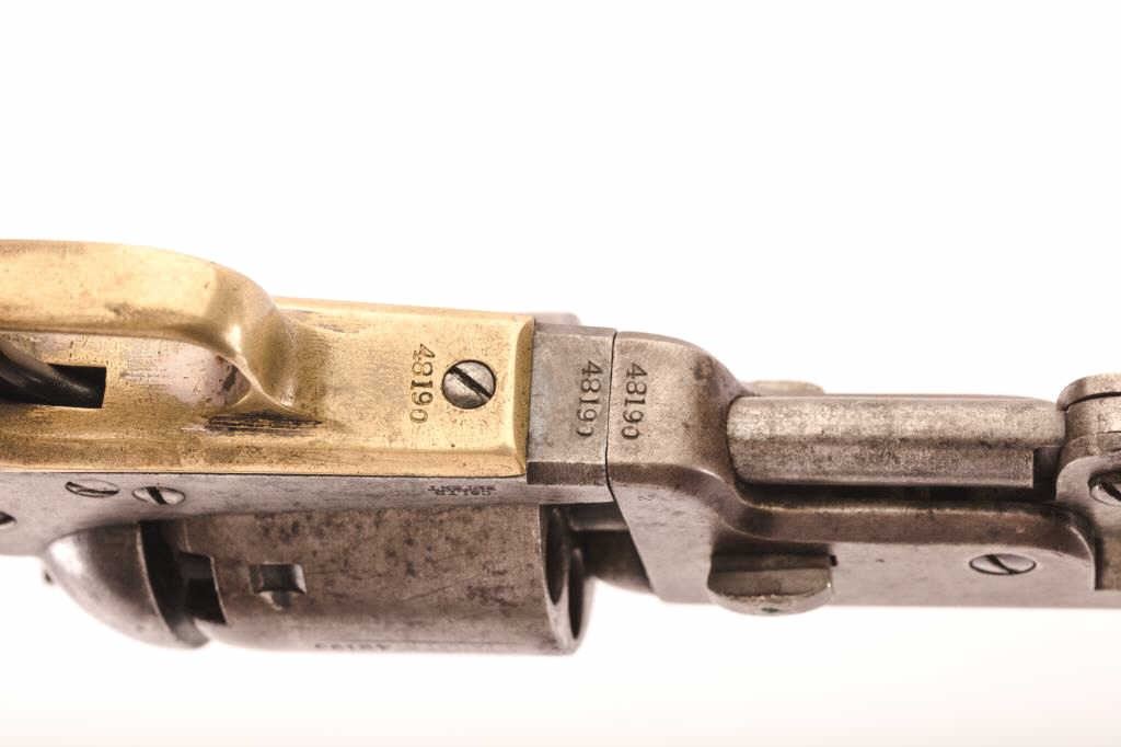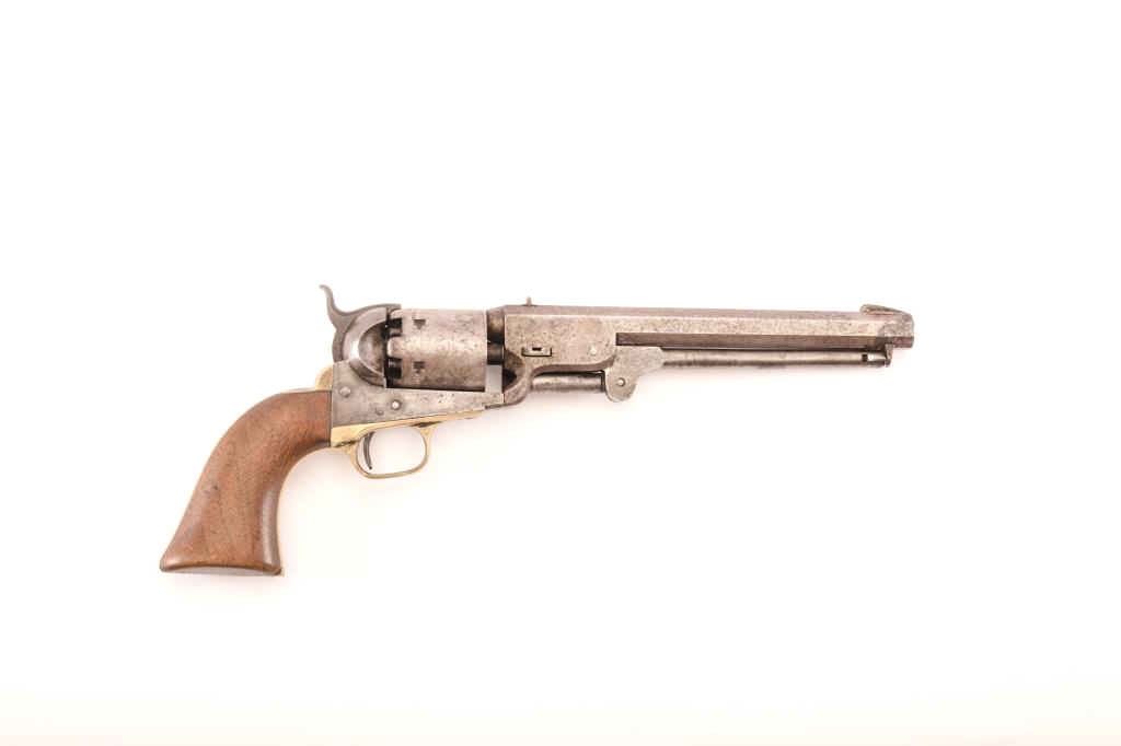 Colt Model 1851 Navy percussion revolver, .36 caliber, 7.5” octagon barrel, old replaced blade front sight and added stationary rear sight, grey patina with scattered areas of erosion, brass straps, small guard, woodgrips, S/N 48190; action cocks but does not rotate cylinder, some cylinder scene remaining, good markings and good grips. (Antique). Est.: $900-$1,800.
