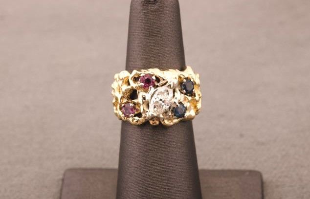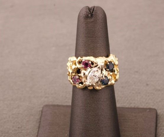 One marquee diamond weighing 0.70ct approx I color VS2 clarity set in a free form ring with rubies and sapphires Est:$1100-2200