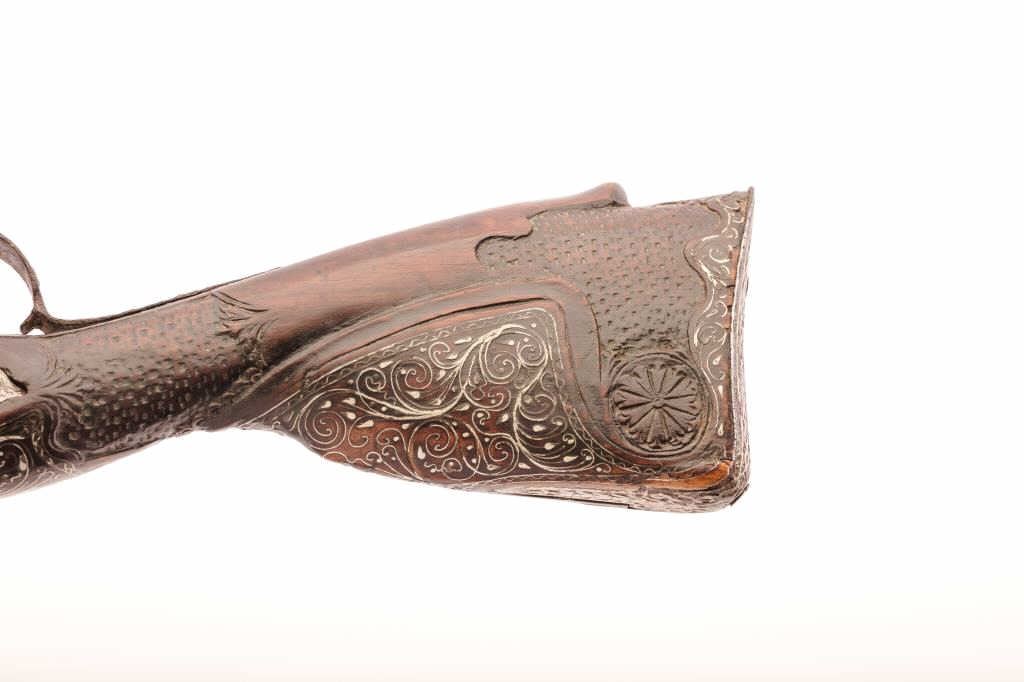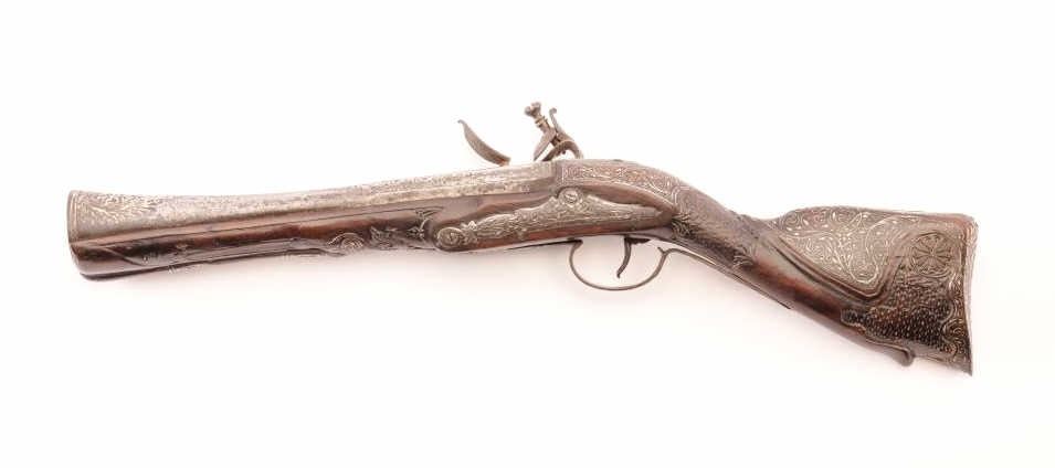 French made for Middle-Eastern trade blunder buss dag signed “Fatou, Paris” and measures 20 ½” overall with a 11 ¼” barrel nearly 1 ¾” across the flared muzzle to outside edges. Chiseled and silver overlaid steel barrel,lock and mounts. Carved stock with wire inlay. Very well made lock with waterproof pan which is silver overlaid. Good to very good condition showing some aging, minor wood losses and light rust. Fatou was a royal gun maker known for elaborately decorated arms that rivaled Boutet and LePage in early Napoleonic era. (Antique) Est.: $1500-$3000