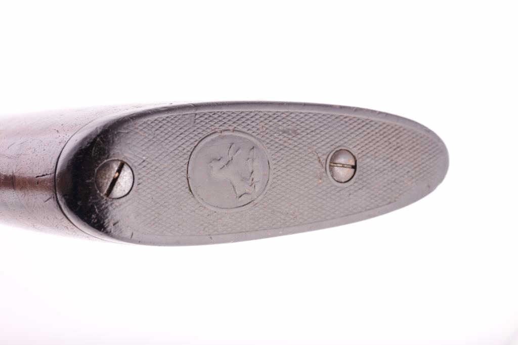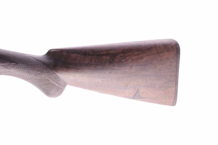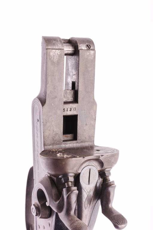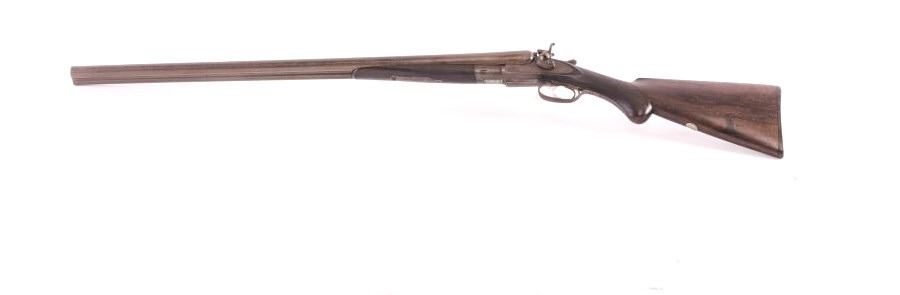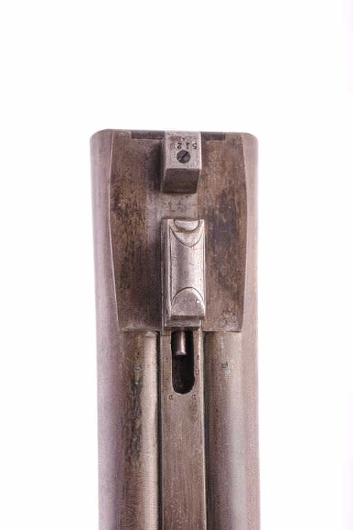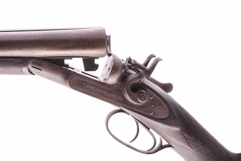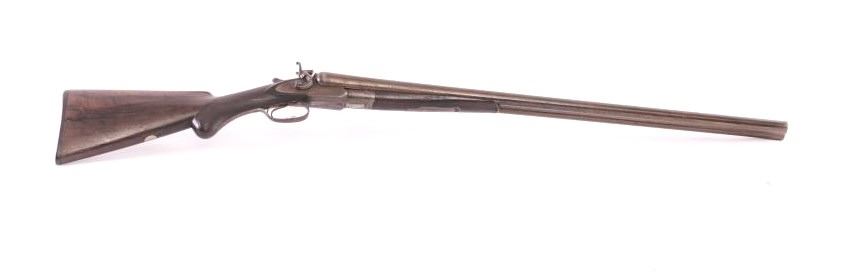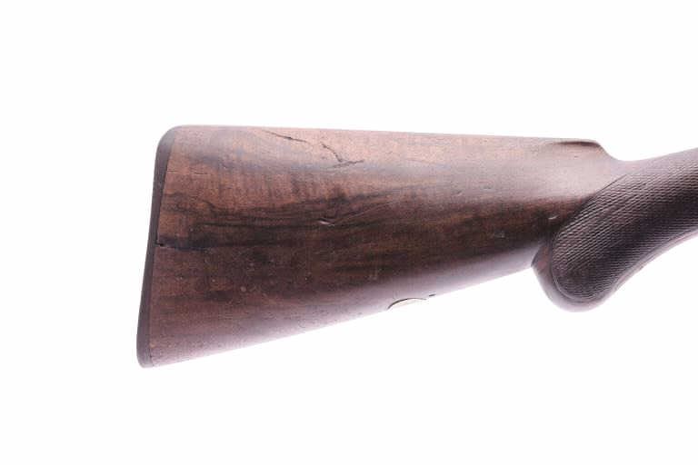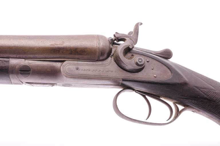 Colt SxS exposed hammers shotgun, 12 gauge, 30” damascus barrels, double triggers, checkered wood stocks, S/N 5120; overall good un-cleaned condition with dark patina to metal surfaces, crisp actions, good markings; overall good wood with correct Colt checkered hard rubber butt plate; bores are dirty and may clean to good. (Antique). Est.: $400-$800.