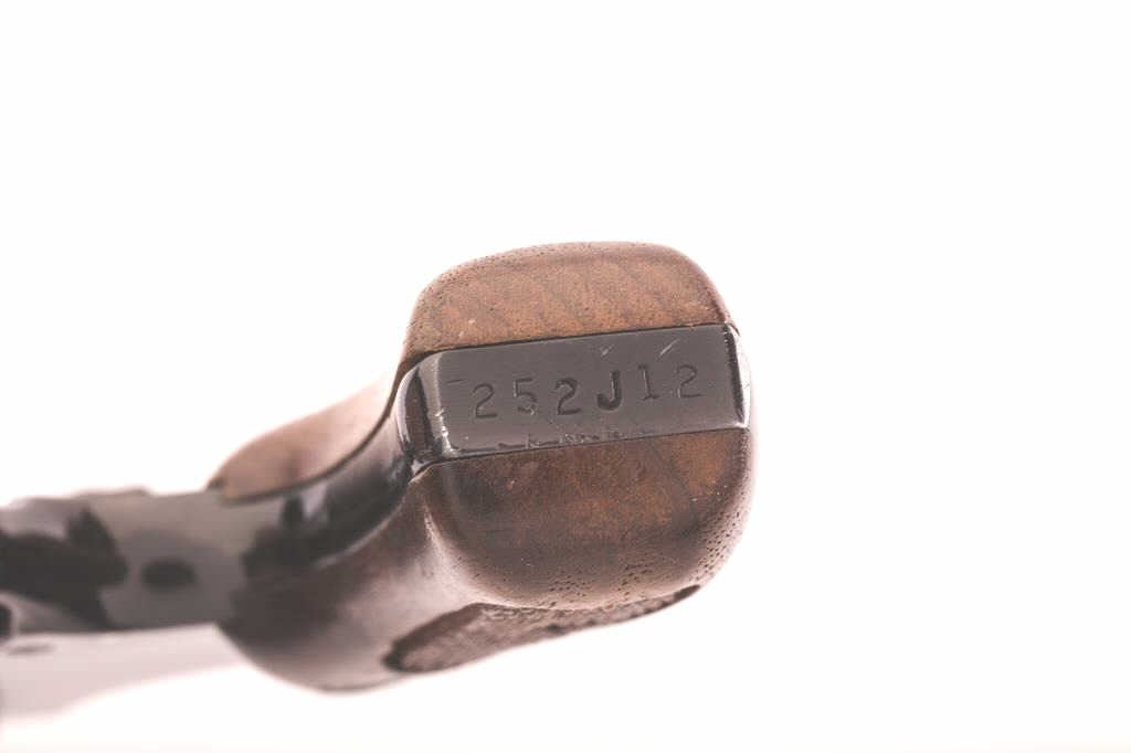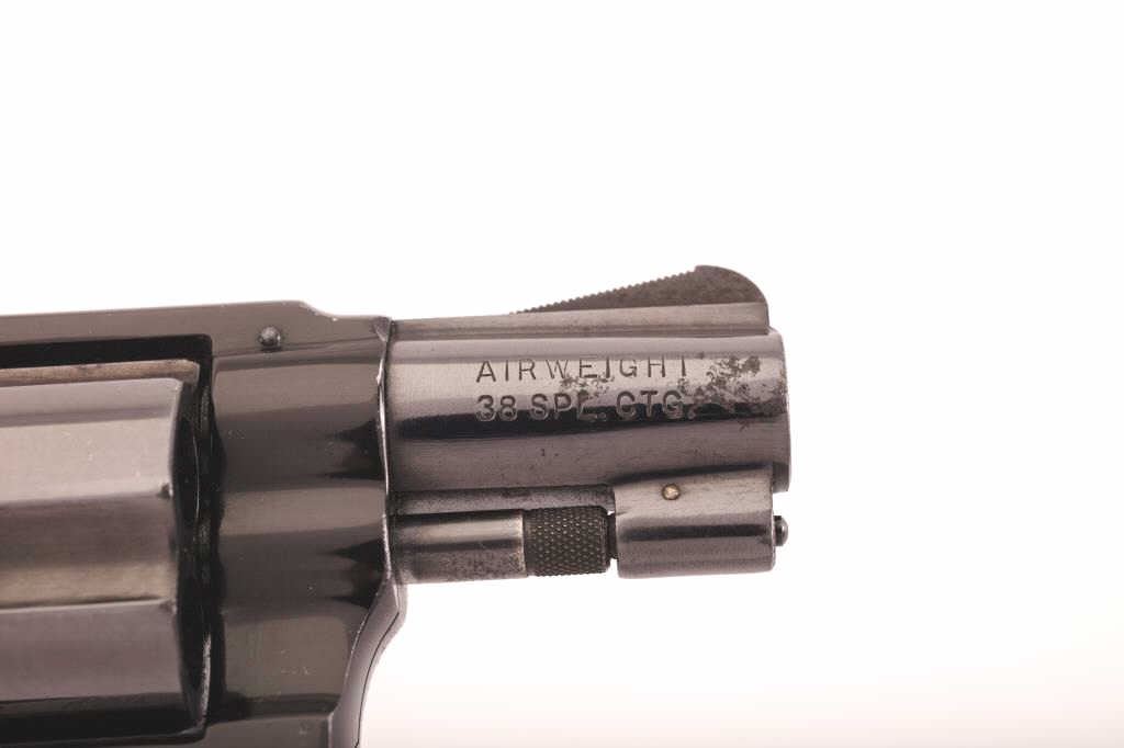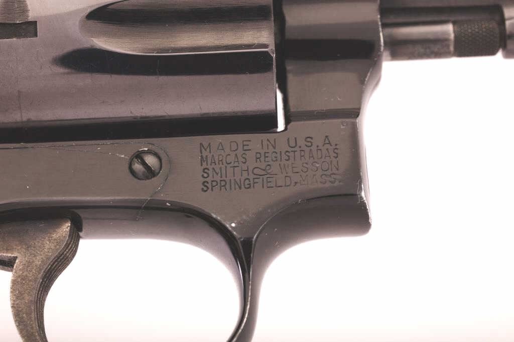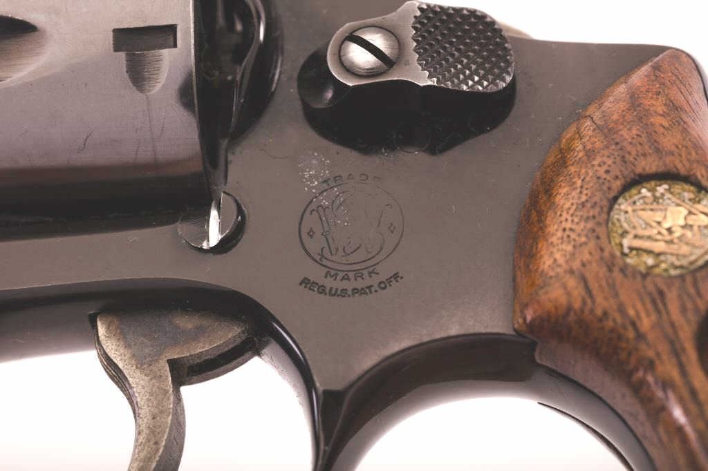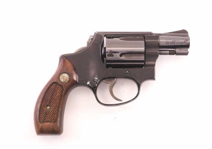 Smith & Wesson Model 37 lightweight revolver, .38 Special caliber, Serial #252J12. The pistol is in very good overall condition with a 2” barrel. The metal surfaces retain the majority of their blue finish with lightholster wear at the muzzle and a faint drag line on the cylinder. The bobbed hammer and trigger show muted case hardening. The checkered wood medallion grips are in good condition with small mars and compressionsfrom carry and use. The bore is good, the action is crisp and the markings are sharp. The lot includes a Bianchi suede leather open top clip holster. Est.: $200-$400. (Modern/PPT).
