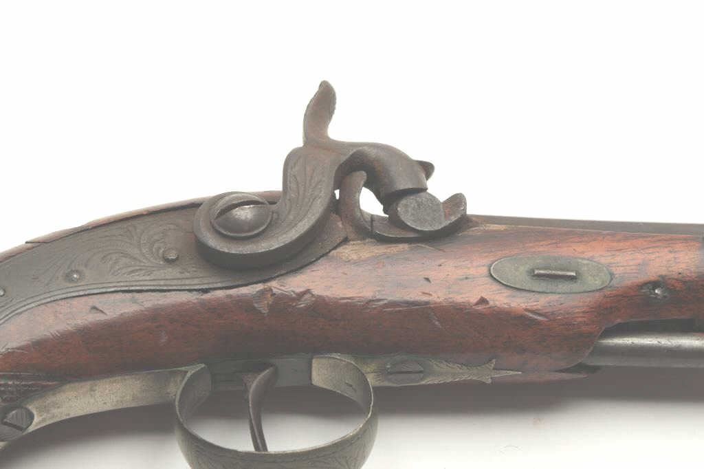 Percussion single shot back action lock pistol, .41 caliber, 4.5” “London”-marked octagon barrel with double bands at breech, engraved lockplate, hammer, tang and trigger guard, replaced ramrod, overall goodcondition with even dark patina, working action, good checkered wood stock displaying several old cracks on left side above trigger and minor scattered old dings and scratches. (Antique). Est.: $350-$700.