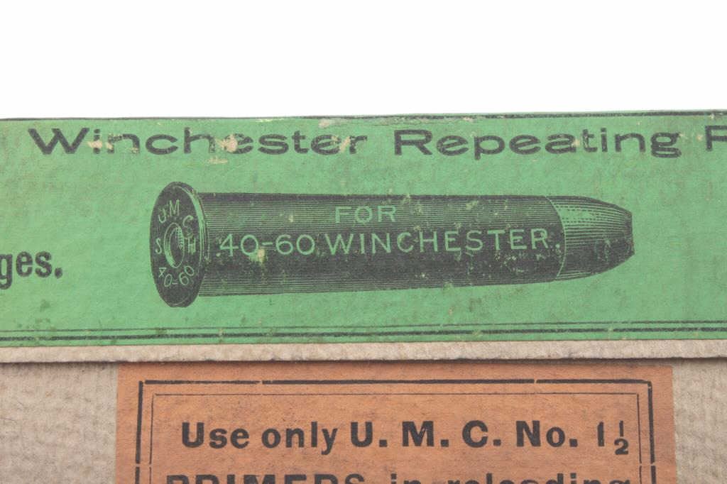 Desirable vintage U.M.C. green label full picture box of 20 .40-50-210 cartridges; overall very good condition. Est.: $150-$300.