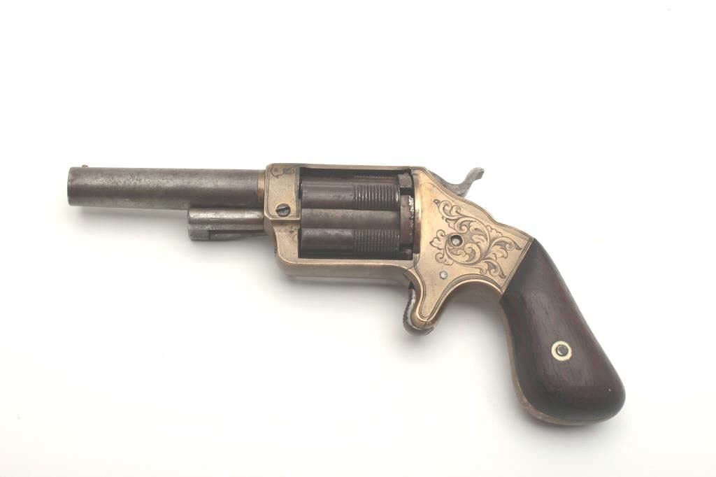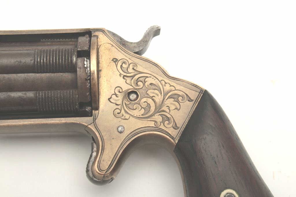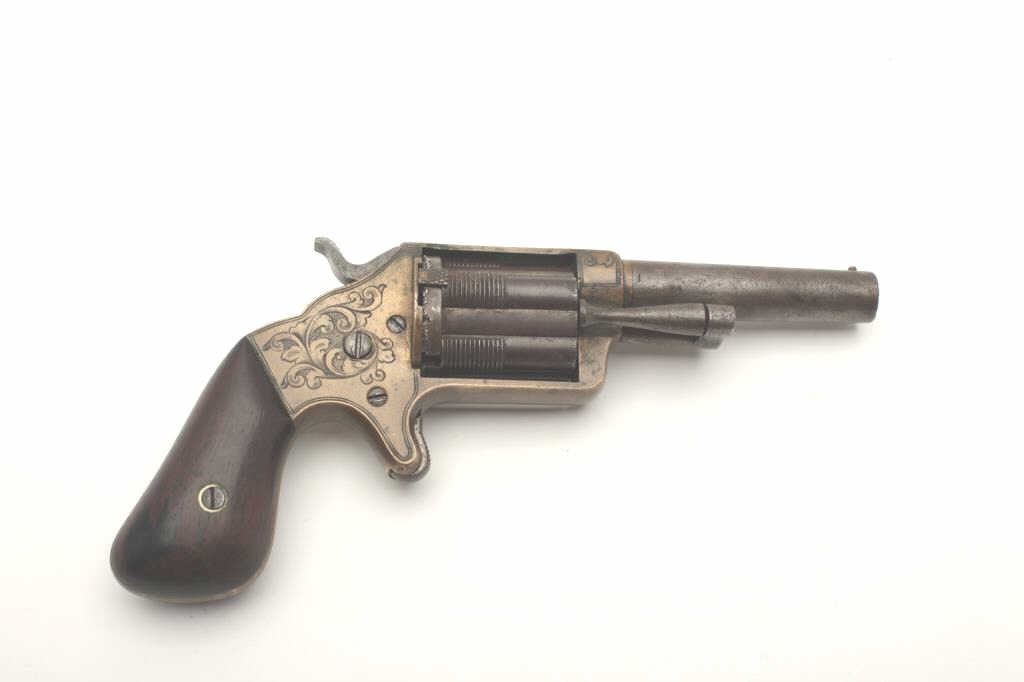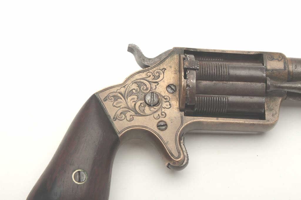 Brooklyn Arms Co. “Slocum Sliding Sleeve” spur trigger revolver, .31 caliber, 3” barrel, engraved brass frame, wood grips, S/N 7138; overall fair to good condition displaying a pleasing patina to brass frame,dark patina to barrel and cylinder, action not working, good wood grips. (Antique). Est.: $250-$500.