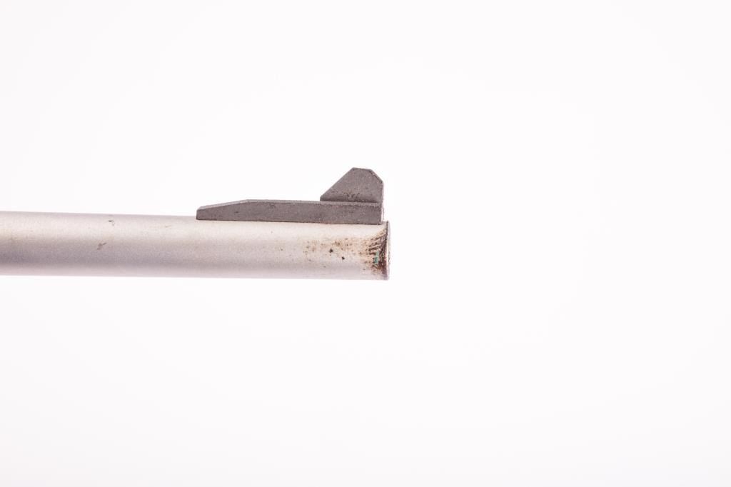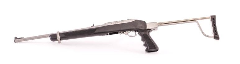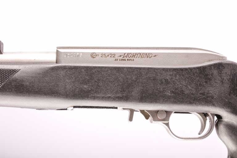 AMT Lightning Model 25/22 semi-automatic rifle, .22LR caliber, 18” barrel, fixed skeleton stock, stainless steel, checkered Zytel plastic stock, no magazine, J04876; overall good condition with a good bore,crisp action, good markings and good stock. Consignor states rifle was presented to him as a gift from Harry Sanford, President and Owner of AMT Firearms Inc. in the early 1980’s (Modern). Est.: $175-$350.