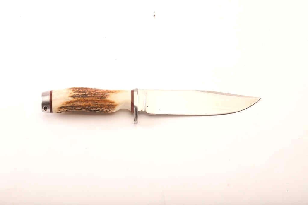 Linder 440C – Mark 2 German knife with stag grip, approximately 10” overall with a 6” blade; accompanied by a Buck Knife marked leather sheath; overall fine condition. Est.: $100-$200.