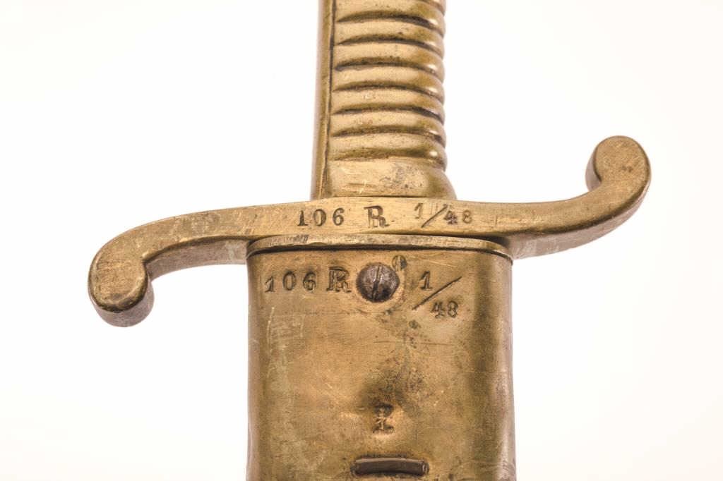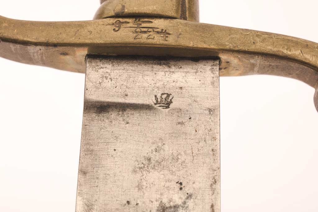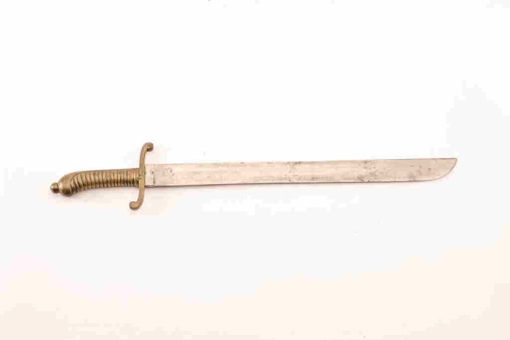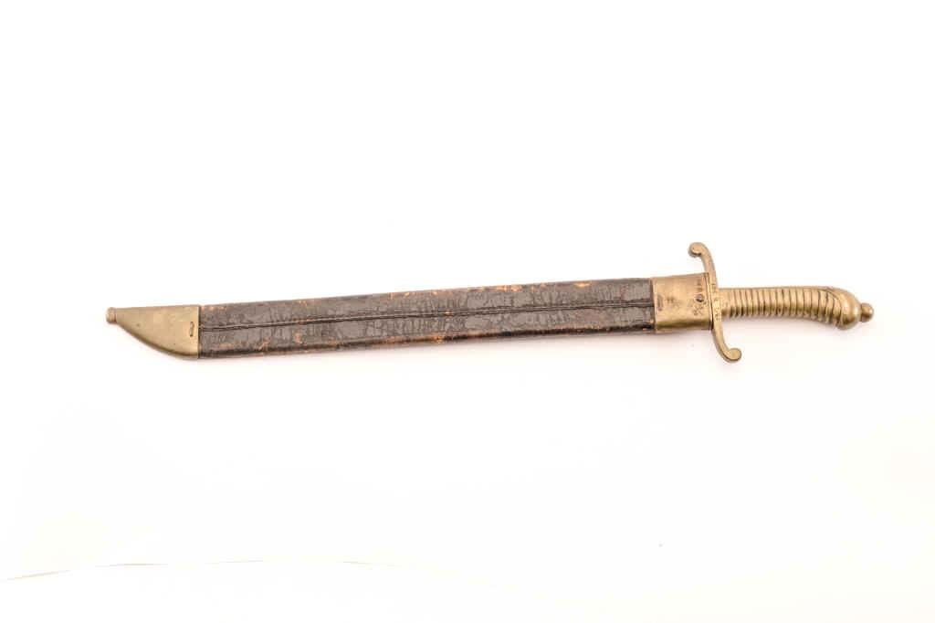 Crown proofed short sword with brass cross guard, grip and pommel, unmarked blade, approximately 26” overall in brass mounted leather sheath; leather shows scattered crazing and scuffing. Est.: $150-$300.
