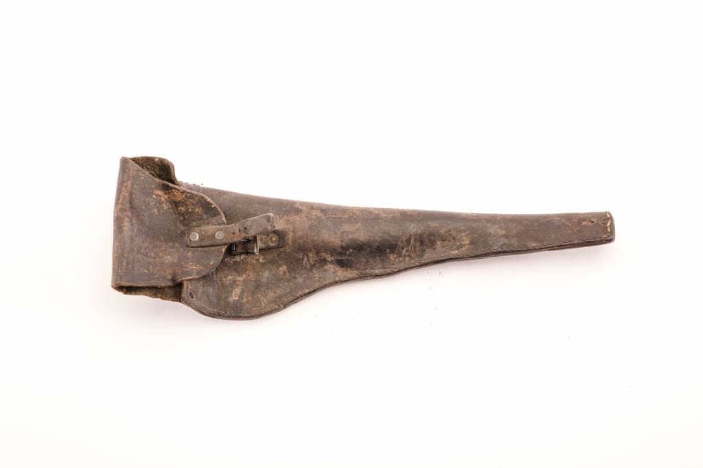 Vintage harness leather flap holster, likely for a long barreled handgun; un-marked with barrel “plug” retained; possibly as early as Civil or Indian Wars era. Est.: $100-$200.