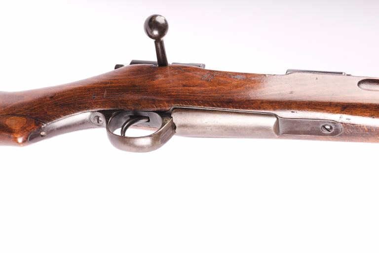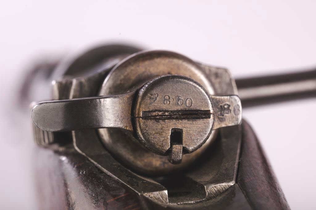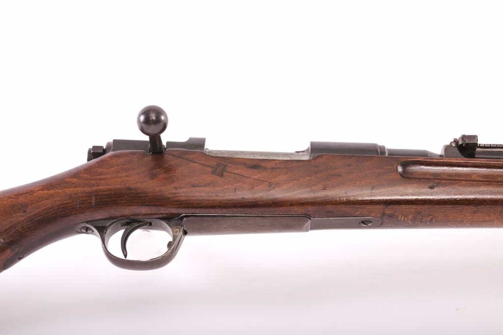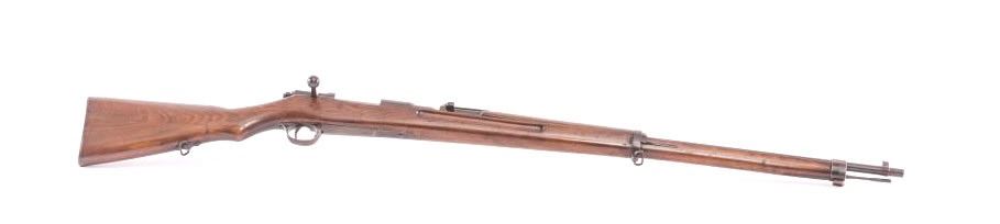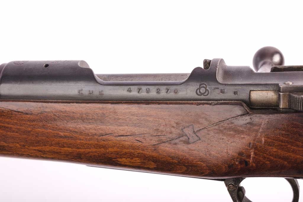 Japanese Arisaka Type 30 Hook Safety bolt action rifle, 6.5 caliber, 32” barrel with sharp mum and Japanese characters remaining, blued military finish, wood stock, S/N 479270; overall good condition with majorityof military finish remaining on metal surfaces, crisp action, sharp markings and overall good wood stock with Japanese characters cartouche on right side of butt stock. A desirable and scarce Arisaka Model. (C&R). Est.: $300-$600.