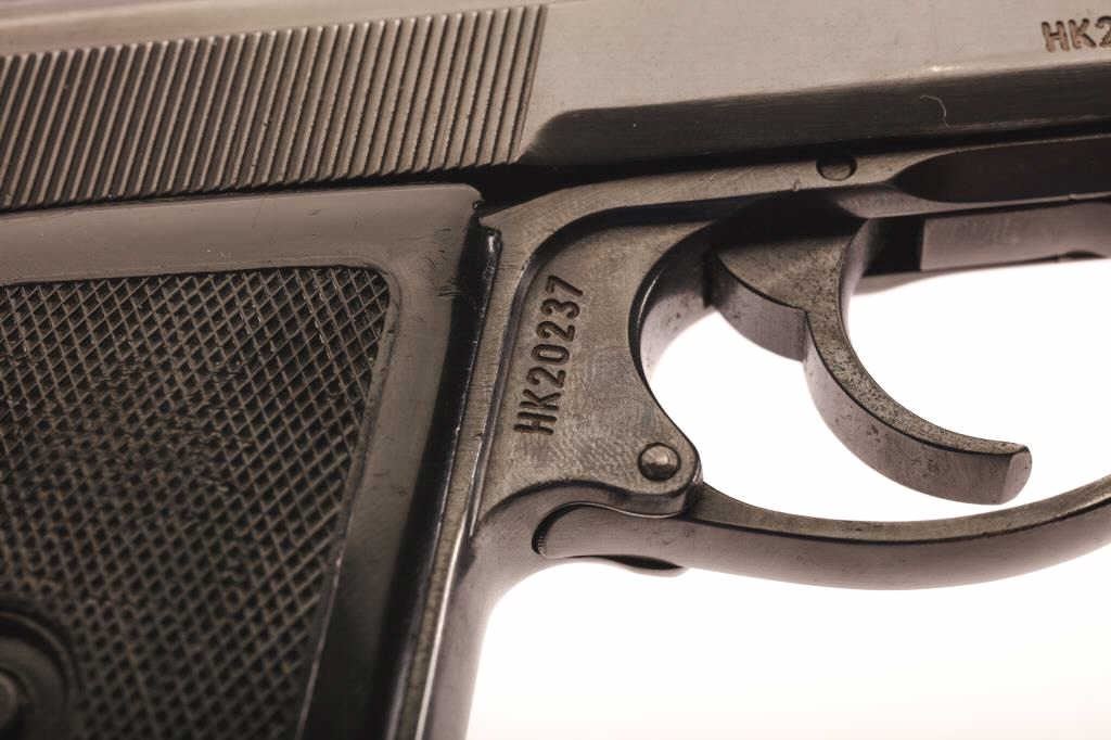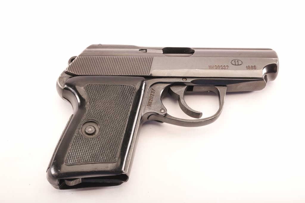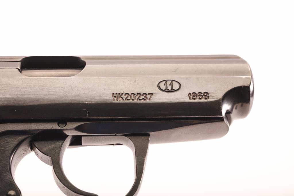 Makarov Model P-64 DA semi-automatic pistol, 1968-dated, 9mm caliber, 3.25” barrel, black finish, no magazine, checkered black plastic grips, S/N HK20237; overall very good condition with majority of original finish to metal surfaces, good bore, crisp action, sharp markings and very good grips. (C&R/PPT). Est.: $250-$500.
