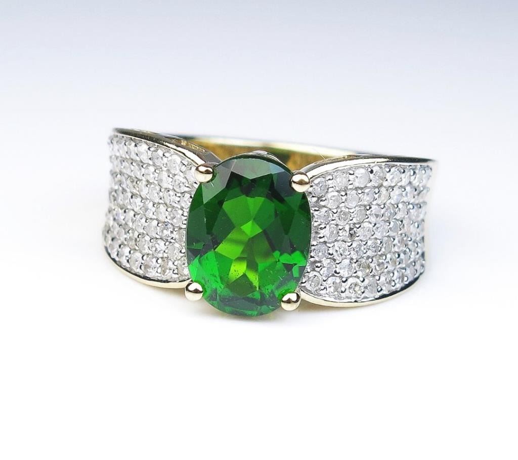 Striking Tourmaline and Diamond Ring featuring an approx. 2.00 carat intense green oval cut Tourmaline brilliantly accented with over 108 round cut pave set Diamonds weighing approx. 0.80 carats with H-I colorsand VS/SI clarity set in 10 karat yellow gold setting. Retail $2,000-$3,000 Estimates $1,200-$1,800