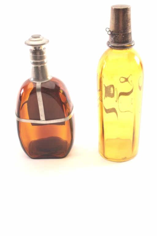 Lot of two antique back bar bottles in amber and canary glass, both bottles are marked, “Scotch”. The canary glass bottle is approximately 11” in height and has a silver plated shot glass on top. The amber bottleis also marked Scotch and has a pewter plate and stopper. The obverse is marked, “QUEENS ART PEWTER HANDMADE DANISH MADE USA”. Both pieces are in very good condition. Est.: $250-$500.