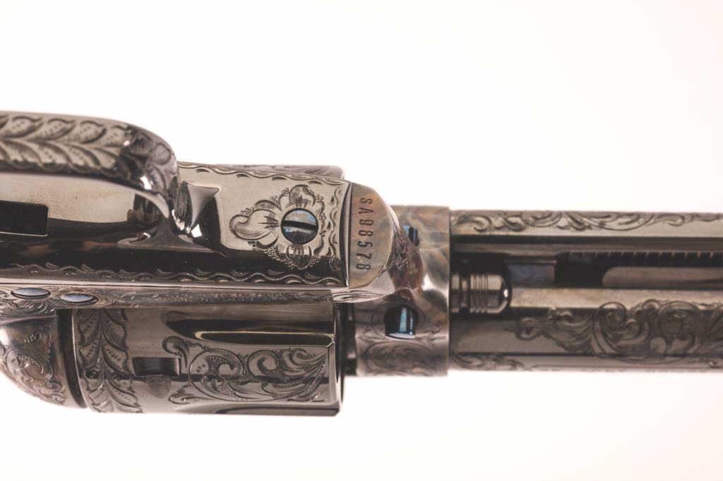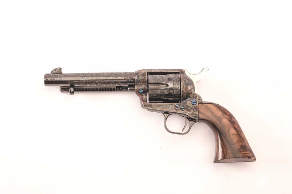 Colt SAA revolver in .45 L.C caliber with a 5 ½” barrel, factory “B” engraved by John Adams, walnut 1 piece grip added with original walnut included, S/N SA98578. 1 gun in shipment with letter in box with matchingend label. Excellent to mint. French style fitted case included. (Modern/No PPT) Est.: $2000-$4000