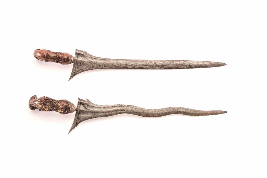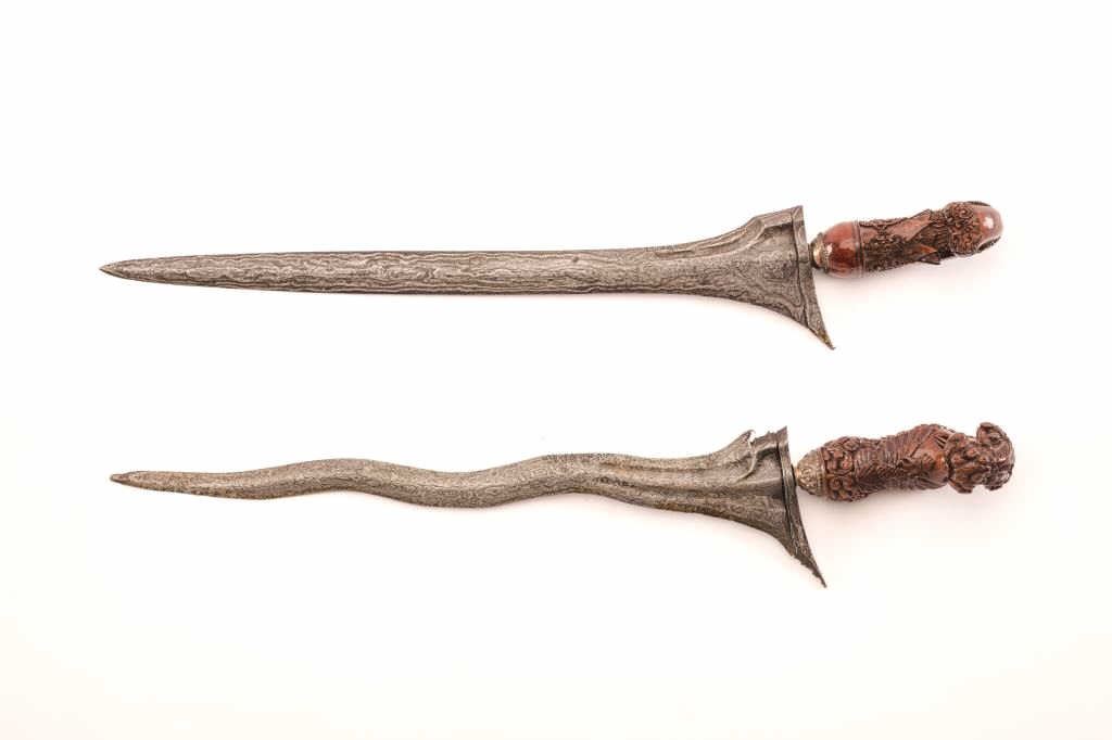 Lot of two exceptional Malaysian kris knives pre-1900 with fancy carved wood grips and meteorite steel blades. 1 fancy scabbard minus throat. The Dr. Leon A. Dale estate whose grandfather started collection inFrance Pre-1900. Est.: $300-$600