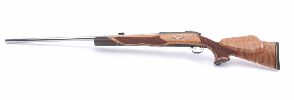 Custom Remington Model 40-X bolt action target rifle, 6mm Remington caliber, Serial #36268B. The rifle is in very good overall condition with a 28” stainless steel bull barrel. The barrel retains the majority ofits stainless steel finish with the front sight removed and the tap holes unfilled. A scope base has been added as well. The receiver retains a significant amount of blue finish and has been drilled and tapped witha scope base added. The custom checkered and inlayed Curly Maple stock is very well done with magnificent figure throughout the stock. The exotic wood fore end cap and pistol grip complement the palm swell at the pistolgrip and rollover cheek piece. The butt stock ends with a solid rubber recoil pad providing a 13” LOP. The checkering and inlay is first rate as well. The bore is fair, while the action is in need of someadjustment and needs repair. Est.: $1,000-$2,000. (Modern).