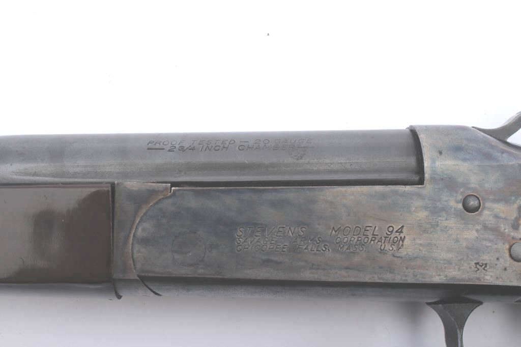 Stevens Model 94 single shot shotgun, 20 gauge, 28” barrel, blued and case hardened finish, brown plastic stocks, no visible S/N; overall very good to fine condition displaying the majority of its original blued and case colors to metal surfaces, good bore, crisp action, sharp markings and very good stocks. (Modern). Est.: $90-$180.