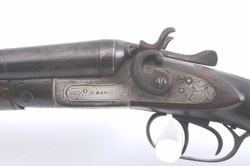 SxS exposed hammers shotgun by T. Barker, “Machine Made”-marked, 12 gauge, 30” barrels, dark patina, checkered wood stocks, no visible S/N; overall fair to good condition with working actions, bores may clean,overall good wood showing normal wear and some scattered mars and scratches from carry and storage. (Antique). Est.: $75-$150.