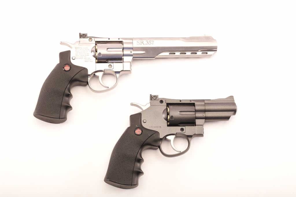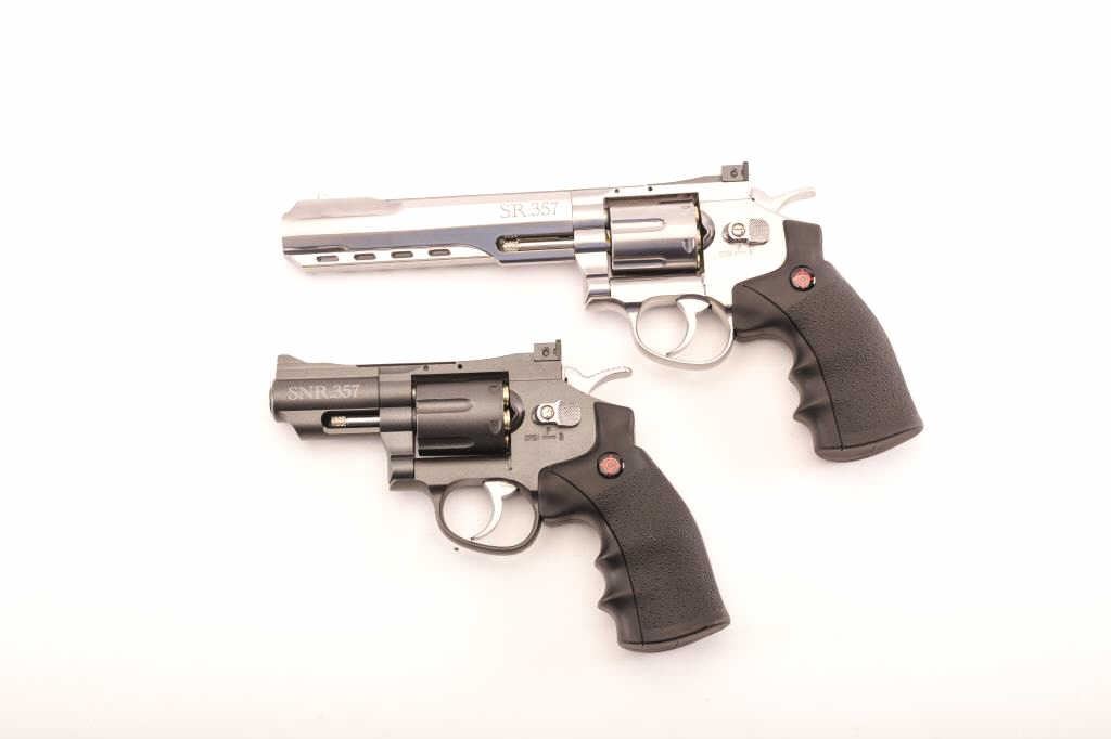 Two SNR Double Action .357 Mag style CO2 power BB guns with faux cartridges. Very good plus. Very realistic! Est.: $100-$200
