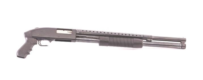Mossberg 500A pump shotgun, 12 gauge, Serial #J497752. The shotgun is in good overall condition with a 20” compensated barrel with a brass bead front sight. The barrel and full-length magazine retain the majority oftheir blue finish while the receiver is black. The barrel shroud shows light surface rust and is marked for 2 ¾” and 3” shells. The synthetic fore end and pistol grip are in good condition showing light wear and use.The bore is good, the action is crisp and the markings are sharp. Est.: $175-$350. (Modern).