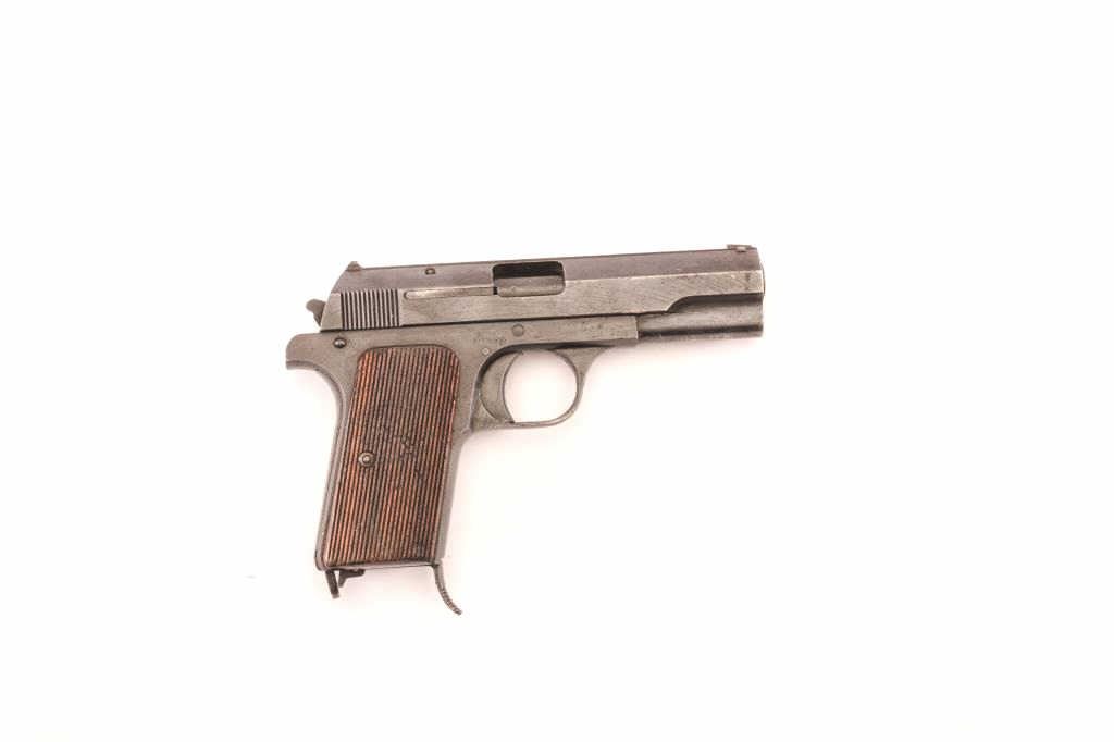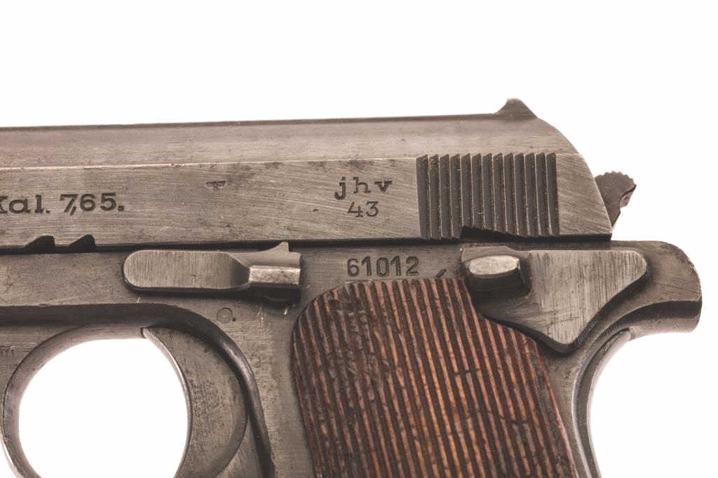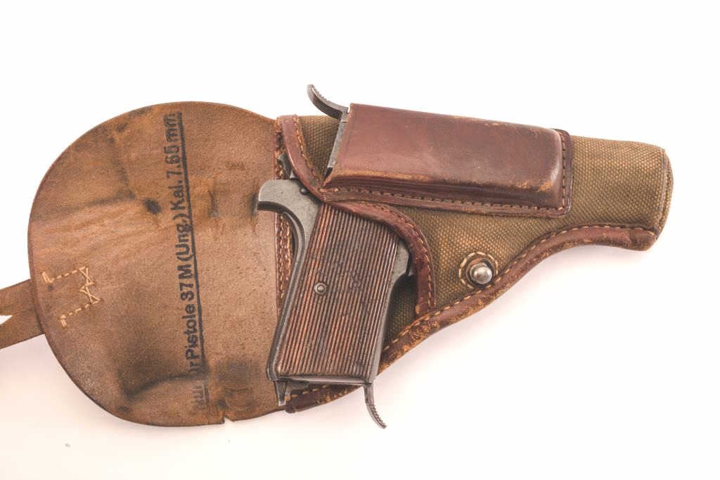 Hungarian P.37 .32 caliber semi-auto pistol, S/N 61012 with Nazi proof, JHV manufactured code and made 1943. With holster and 2 mags. Very good plus condition with 90%-95% original blue. Minor wear and small areas ofpinprick pitting. Excellent bore and little use. (C&R/PPT) Est.: $350-$700