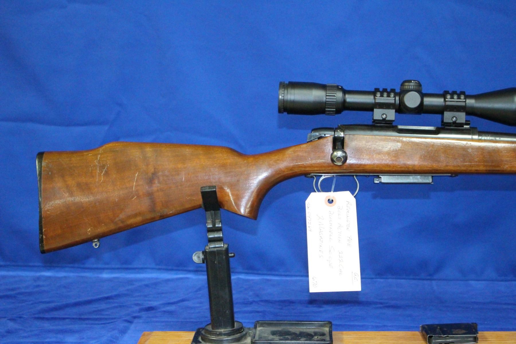 222 cal.; Bolt Action; 24" Barrel; Bore is good & clean; with 3500 Elite Bushnell Scope; 2 Magazines; S/N 047269