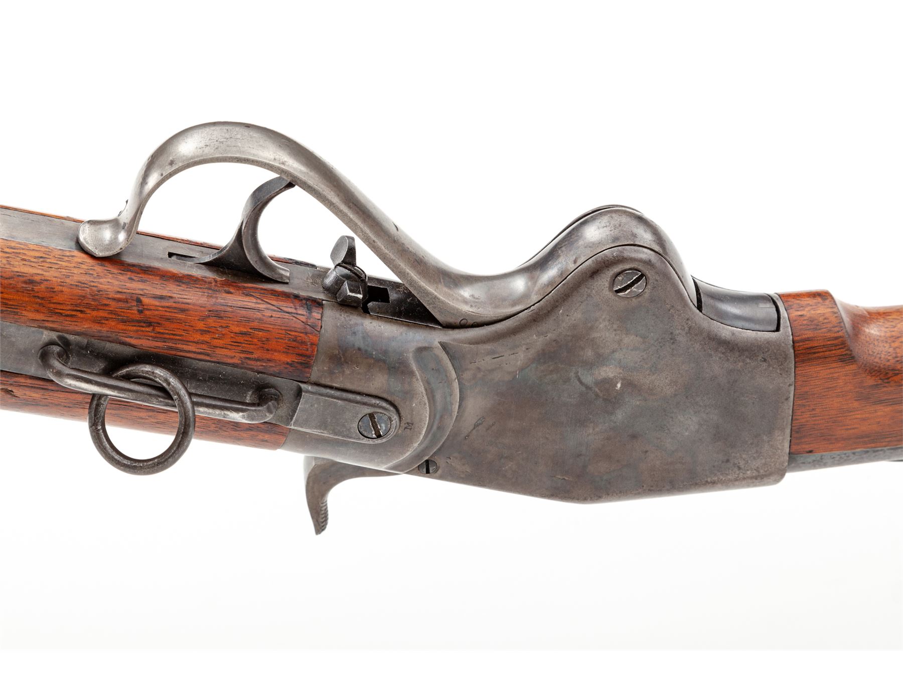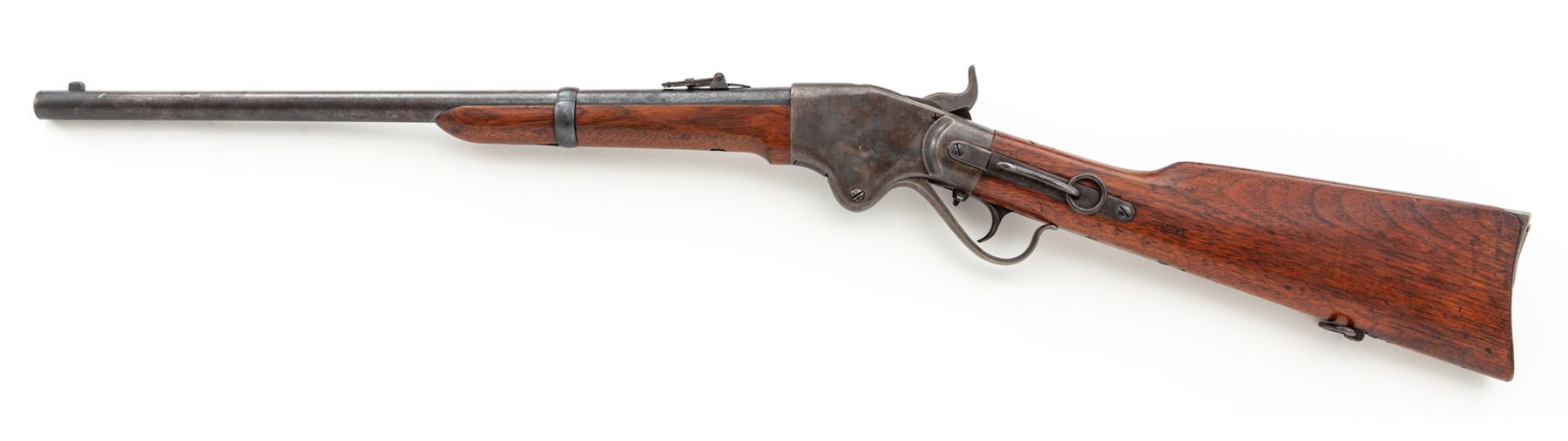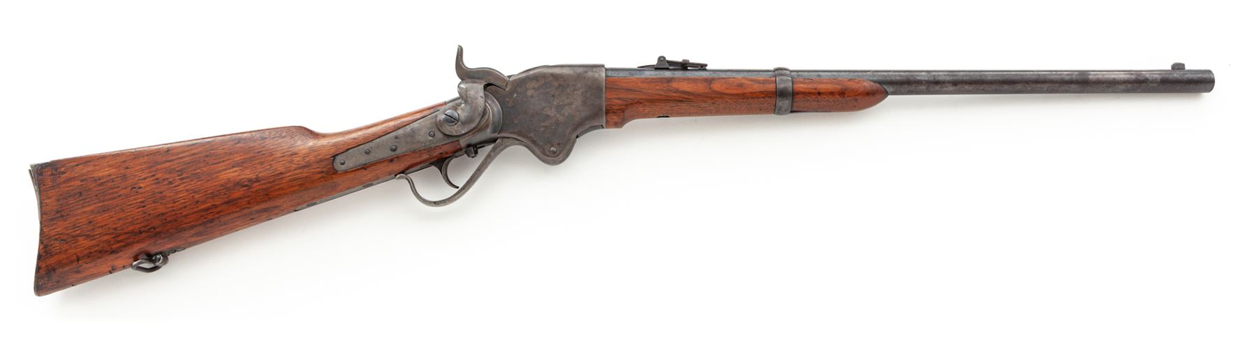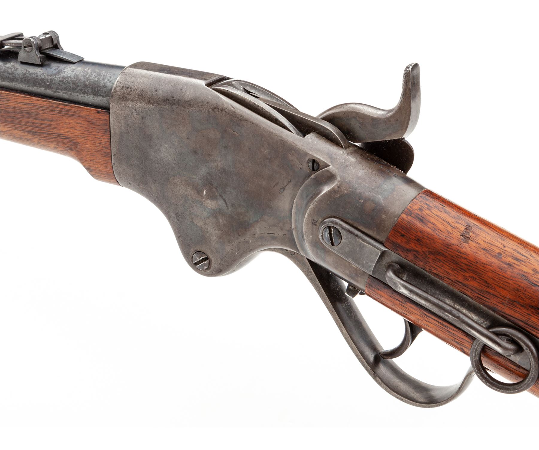 Indian Wars Altered Spencer 7-Shot Repeating Lever Action Cartridge Carbine, #47532, .50 RF (.56-50/.56-52) cal., 22'' blued round barrel having integral block-blade front sight and single-leaf adjustable rear sight; top of case hardened steel receiver marked ''Spencer Repeating/Rifle Co., Boston, Mass./Pat'd. March 6, 1860'' (markings very faint) in three lines; case hardened steel furniture including single barrel band, left-side sling bar and ring, sling swivel under buttstock, and steel buttplate having a sliding door opening to the magazine tube for cartridge loading; oil-finished walnut forend and buttstock having a clear ''ESA'' cartouche of Master Armorer Erskine S. Allin on left side. Originally mfg'd 1863-65. Some 11,000 of these arms were altered and refinished at Springfield Armory c. 1867-1874: the alterations included sleeving the barrel for the smaller caliber three-groove rifled bore, and the addition of a Stabler Cutoff ahead of the trigger (allows for use as a single-shot). Condition is very good as likely refinished at the time of alteration (accounting for the weak receiver markings): barrel retains approx. 50% blue mixing with occasional discoloration; receiver shows nicely mottled case hardening colors, with softer colors on the sideplate, hammer, operating lever and buttplate. Stocks are sound with few marks, fit well and show nice coloration. Action functions smoothly; internals appear as-new; bore is bright with defined rifling. Est.: $1,750-$2,750. (Antique)