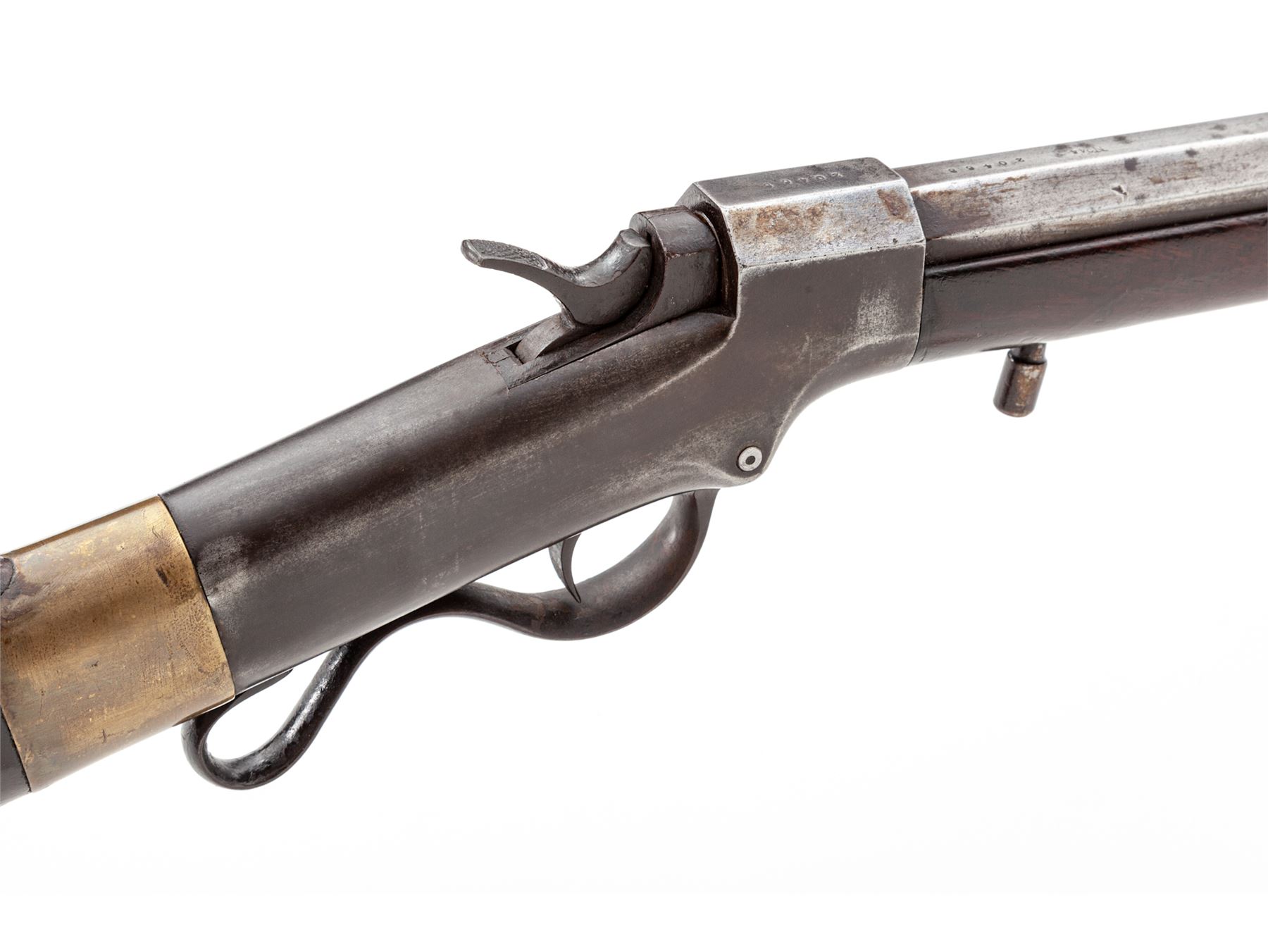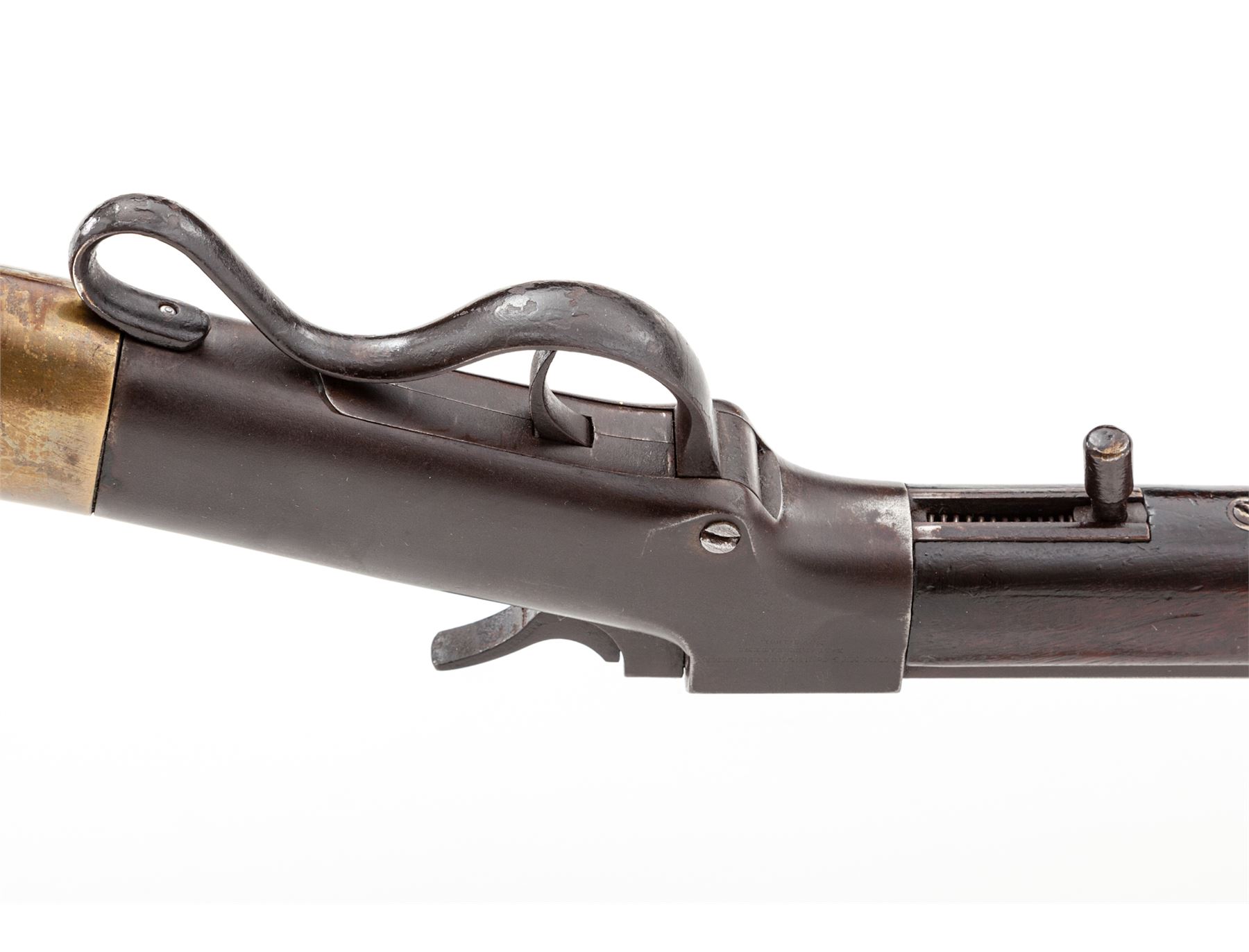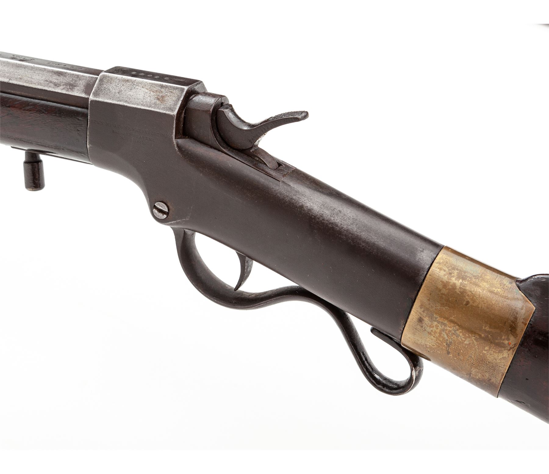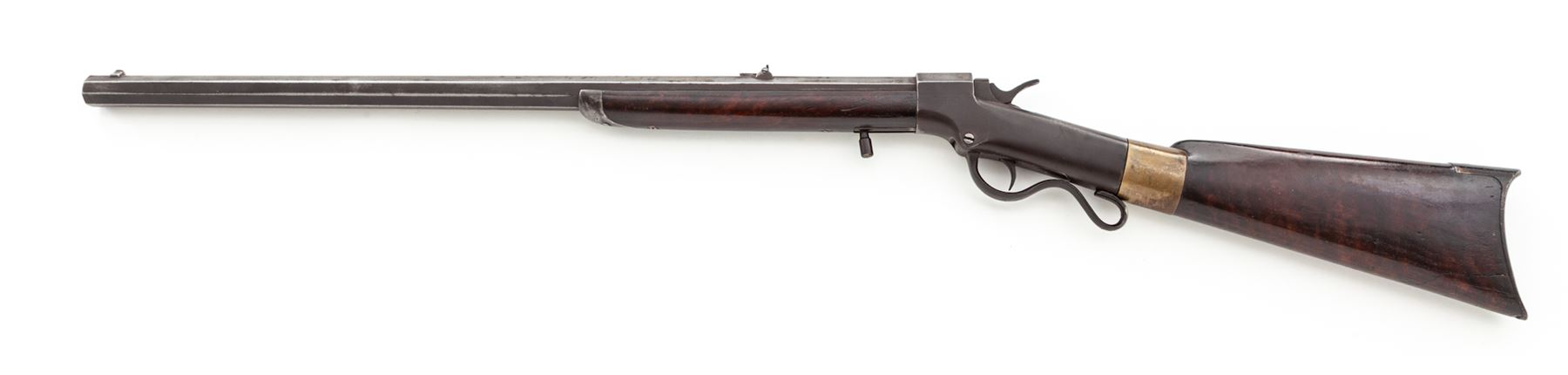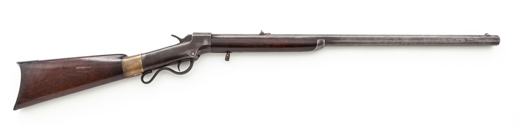 Brown Mfg. Co.-Ballard's Patent External Extractor Breechloading Percussion Rifle, #20468, .44 cal., 26'' octagonal barrel having dovetailed front blade and leaf rear sights marked ''No. 44'' and serial number ahead of breech; steel receiver marked on left side ''Brown Mfg. Co. Newburyport, Mass./Ballard's Patent/Nov. 5, 1861'' in three lines, steel operating lever, hammer and trigger; two-piece varnished walnut halfstock with iron nosecap and crescent buttplate. This rifle, while equipped with a percussion nipple, employs the external cartridge extractor and appears to be compatible with the novel reversible firing pin (for both rimfire and centerfire cartridges) invented by John Marlin; thus it may be that it was assembled utilizing original Brown Mfg. Co. parts after that firm's acquisition by Marlin. Condition is very good showing no original finish and a dark aged patina to metal (barrel cleaned of spotty discoloration). A 1-5/8'' wide brass reinforcement was added at stock wrist, professionally done; stocks are sound showing minimal dings and perhaps a later coat of varnish. Action works as designed; bore is shiny, clean and with deep rifling. An intriguing rifle, reflecting the dramatic late 1860s-early 1870s era of change from percussion to metallic cartridge firearms ignition. Est.: $750-$1,250. (Antique)