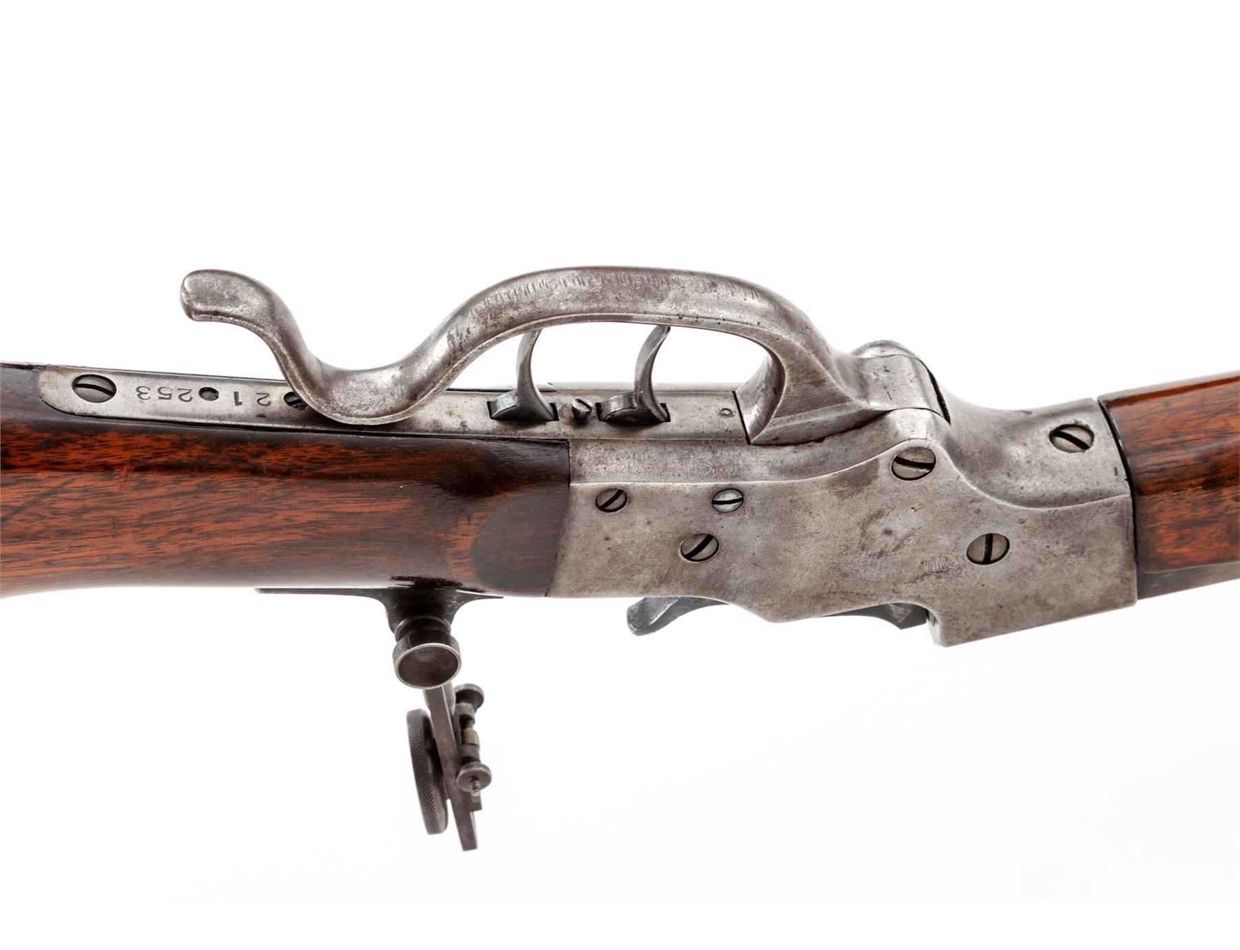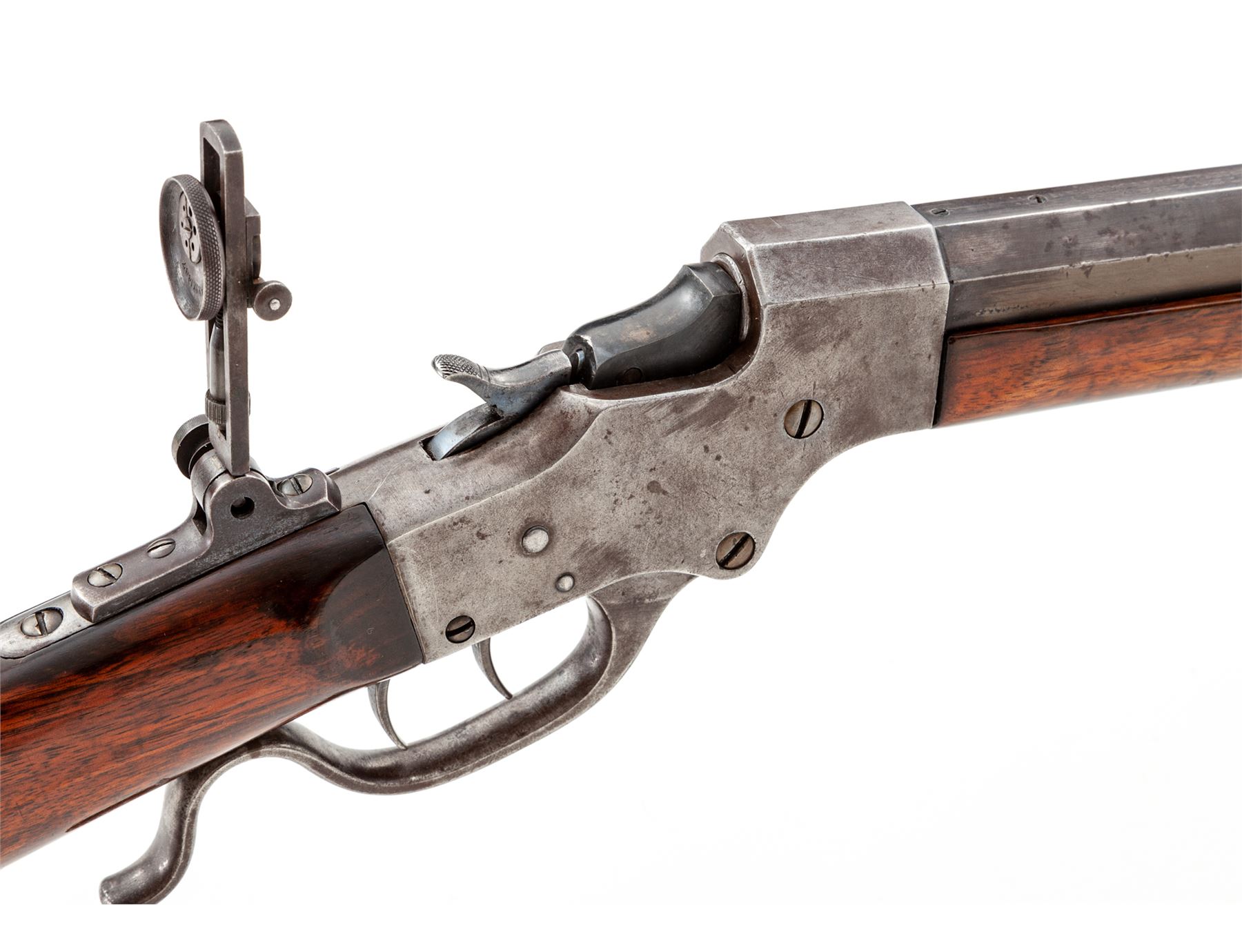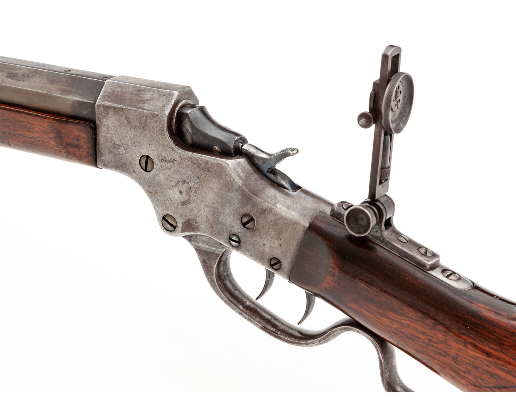 Stevens Ideal ''Range Model'' No. 45 Schuetzen Style Sporting Rifle, #21253, .28-30-120 Stevens CF cal., 26'' part octagonal-part round No. 2 medium-weight barrel marked ahead of breech ''J. Stevens A&T Co.,/Chicopee Falls, Mass. U.S.A. Pat. Sept. 6, 1864'' in two lines and ''28-30'' on left angled flat, mounted with Beach combination front and open rear sights; steel receiver with adjustable Vernier tang sight; double set triggers; serpentine operating lever; Swiss buttplate; varnished walnut forend (having a semi-Schnabel nose) and straight buttstock. Mfg'd 1896-1916, originally with blued and case hardened finishes. Condition is fine+, the barrel retaining approx. 70% blue on round portion and 25% on octagonal portion, and a smooth, lightly-aged gunmetal gray color to receiver, lever and buttplate; barrel has small tapped holes (two ahead of rear sight and two behind) with flush screws, likely for scope mounts (scopes were an original Stevens option). Stocks are very fine showing only minor use, nice grain and color, and perhaps a later coat of varnish. Action is smooth, double set triggers function as designed; bore is clean, shiny and with sharp rifling. A very nice rifle, in a very rare and desirable centerfire caliber. Est.: $1,000-$1,500. (C&R)