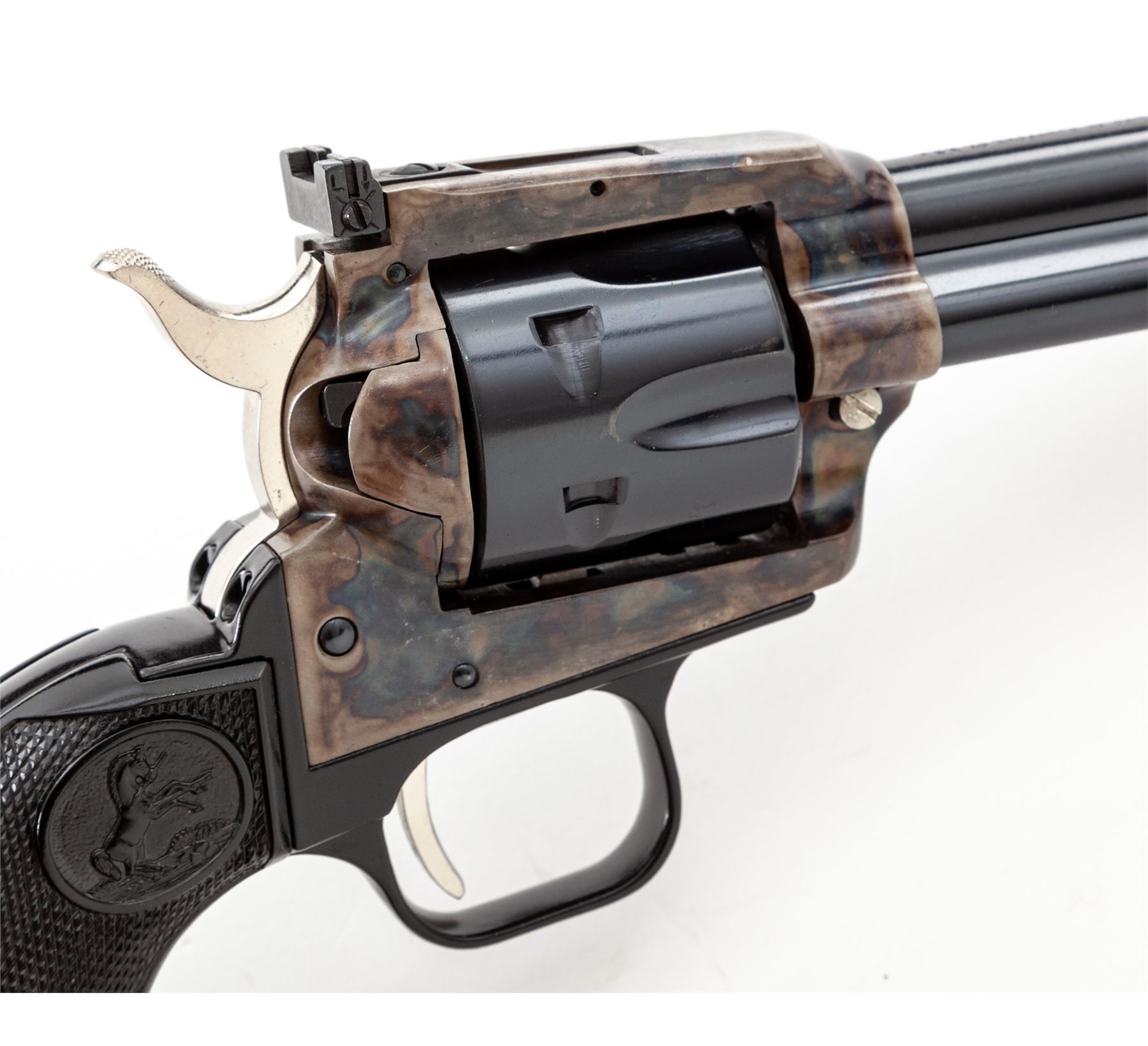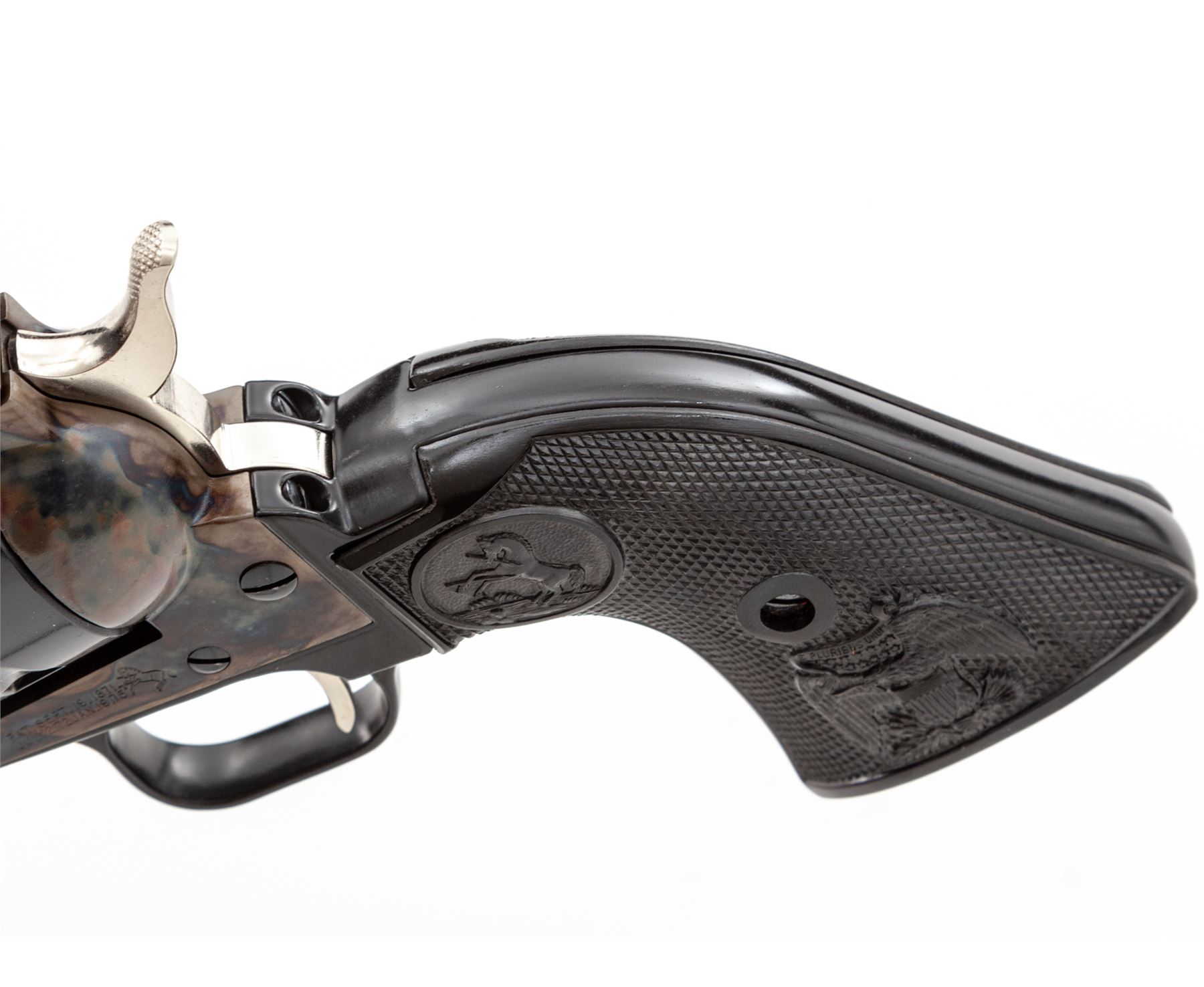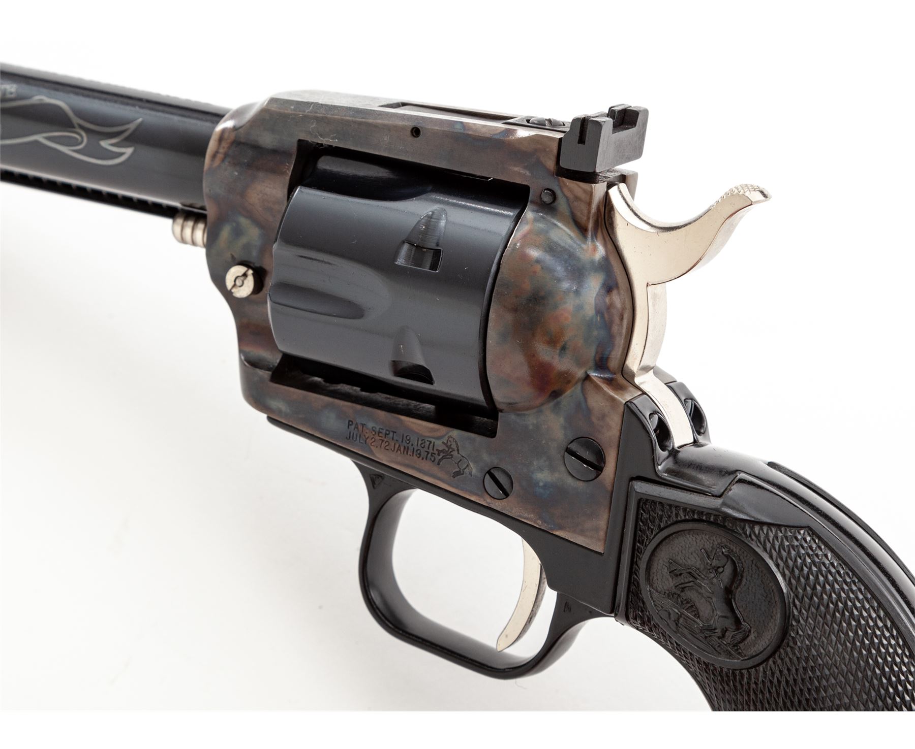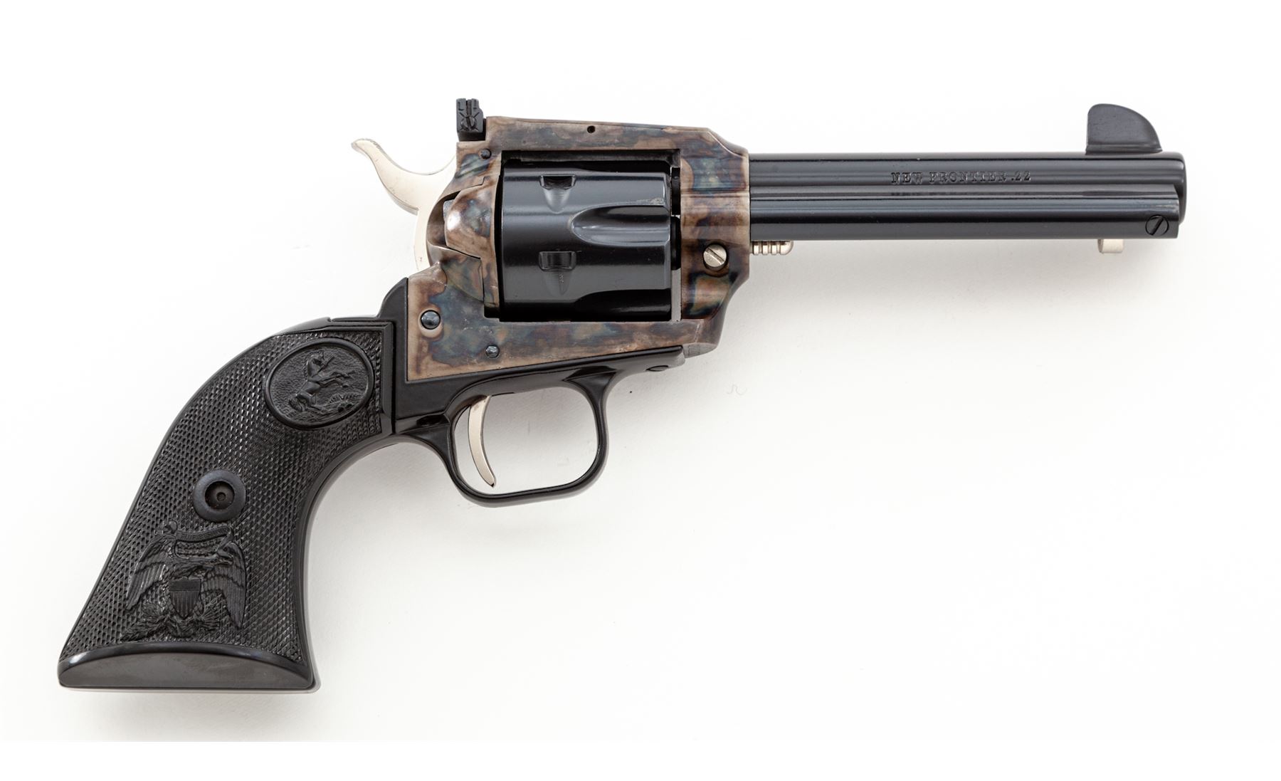 Cased Colt John Wayne Commemorative ''The Duke'' New Frontier Single Action Revolver, #G211122, .22 LR cal., 4-3/8'' barrel marked on left side ''John Wayne'' and ''The Duke'' in silver; case hardened frame, bright hammer and trigger, factory checkered black plastic eagle grips with Colt logo, fixed front sight and adjustable rear sight. In original Colt wood display case with an approx 3.5''x2.25'' John Wayne plaque. Overall the condition is excellent, appearing as new. Case colors are deep and rich. Cylinder with only a faint index line between two of the cylinder stop notches, appears unfired. Grips are also as new. Factory lettering is clear and crisp. Portions of the lid and exterior finish of the wood display case are a little textured and gummy with a few spots of noticeable thinning and finish loss, appears as if it was possibly caused by improper cleaning; otherwise it is in nice shape; interior is excellent. Approx. 5,000 were mfg'd in 1984. Est.: $700-$1,000. (C&R/PPT)