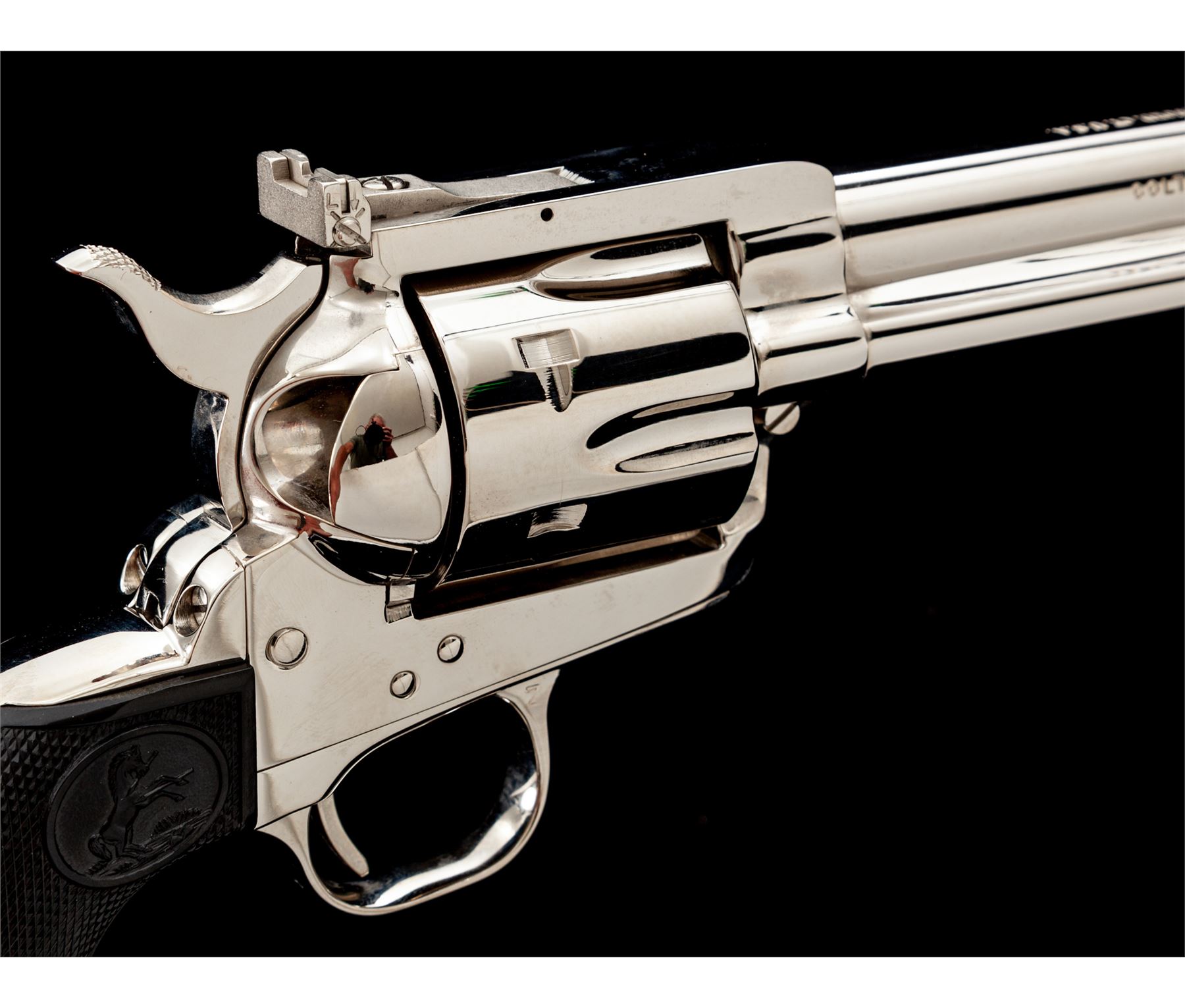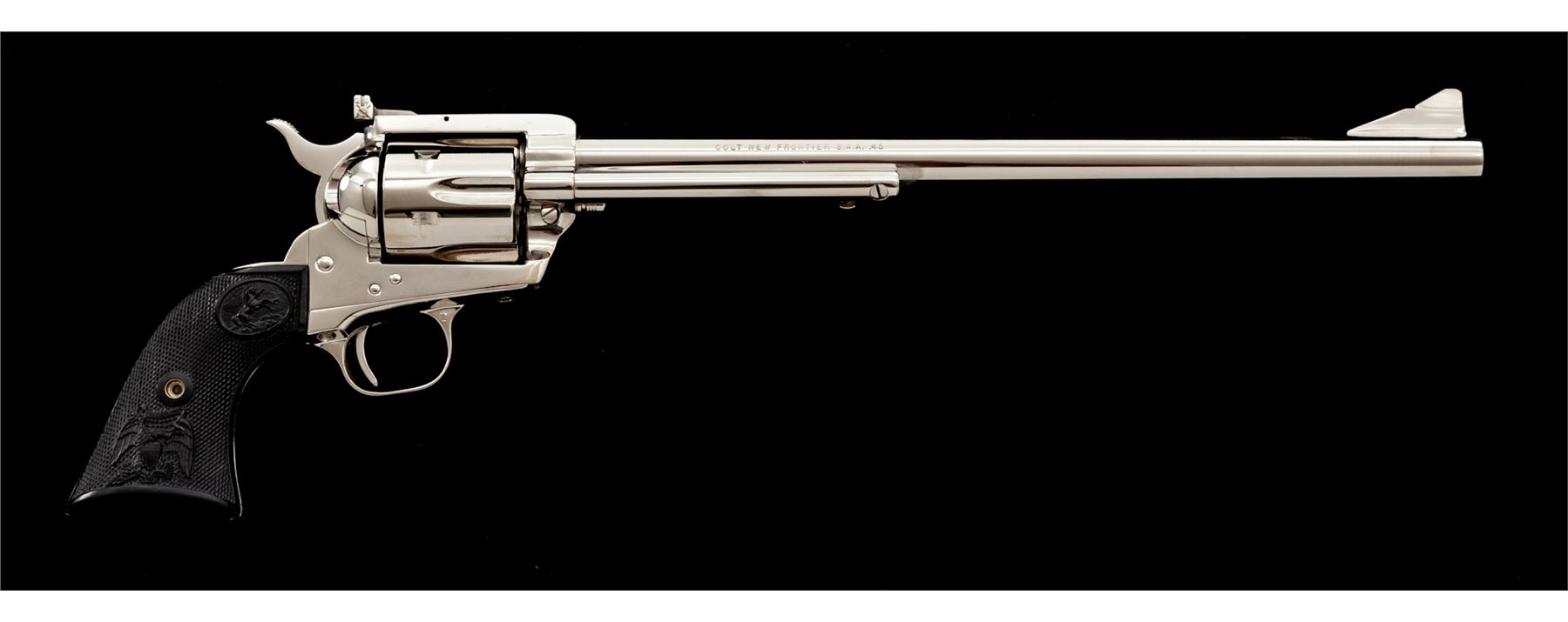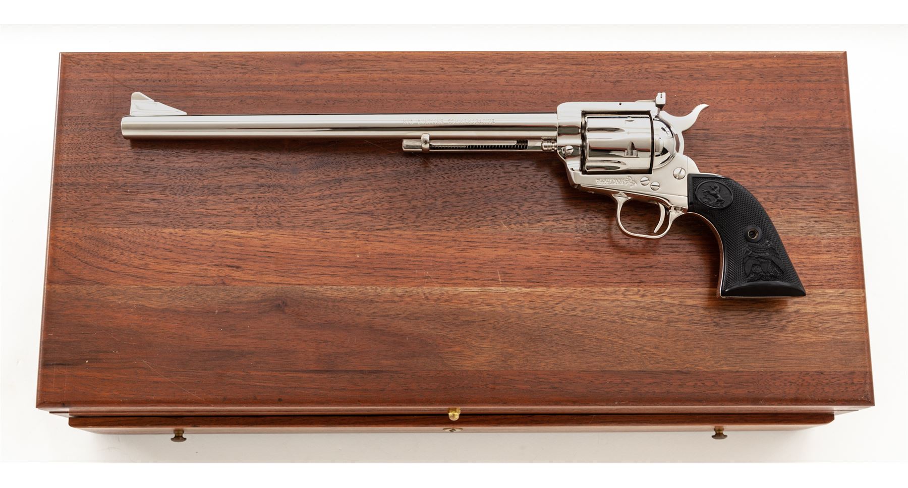 Cased Colt Ned Buntline Commemorative Single Action Revolver, #NB1133, .45 LC cal., 12'' barrel, bright nickel finish, factory checkered black plastic eagle grips with ''Rampant Colt'', tall blade front sight, square notched fully adjustable rear sight. Left side of barrel is marked ''NED BUNTLINE COMMEMORATIVE''. In wood display case with glass insert, fitted burgundy colored interior, and Ned Buntline plaque. Condition overall is excellent, appearing unfired. Metal with a few very minor handling marks; cylinder with only a slight index line. Factory lettering is crisp and clear. Grips appear as new. Wood display case with scattered light scratches and storage wear and the exterior rates very good overall; interior is excellent. 1 of 3,000 Ned Buntline Commemoratives mfg'd in 1979. Est.: $1,000-$1,500. (C&R/PPT)