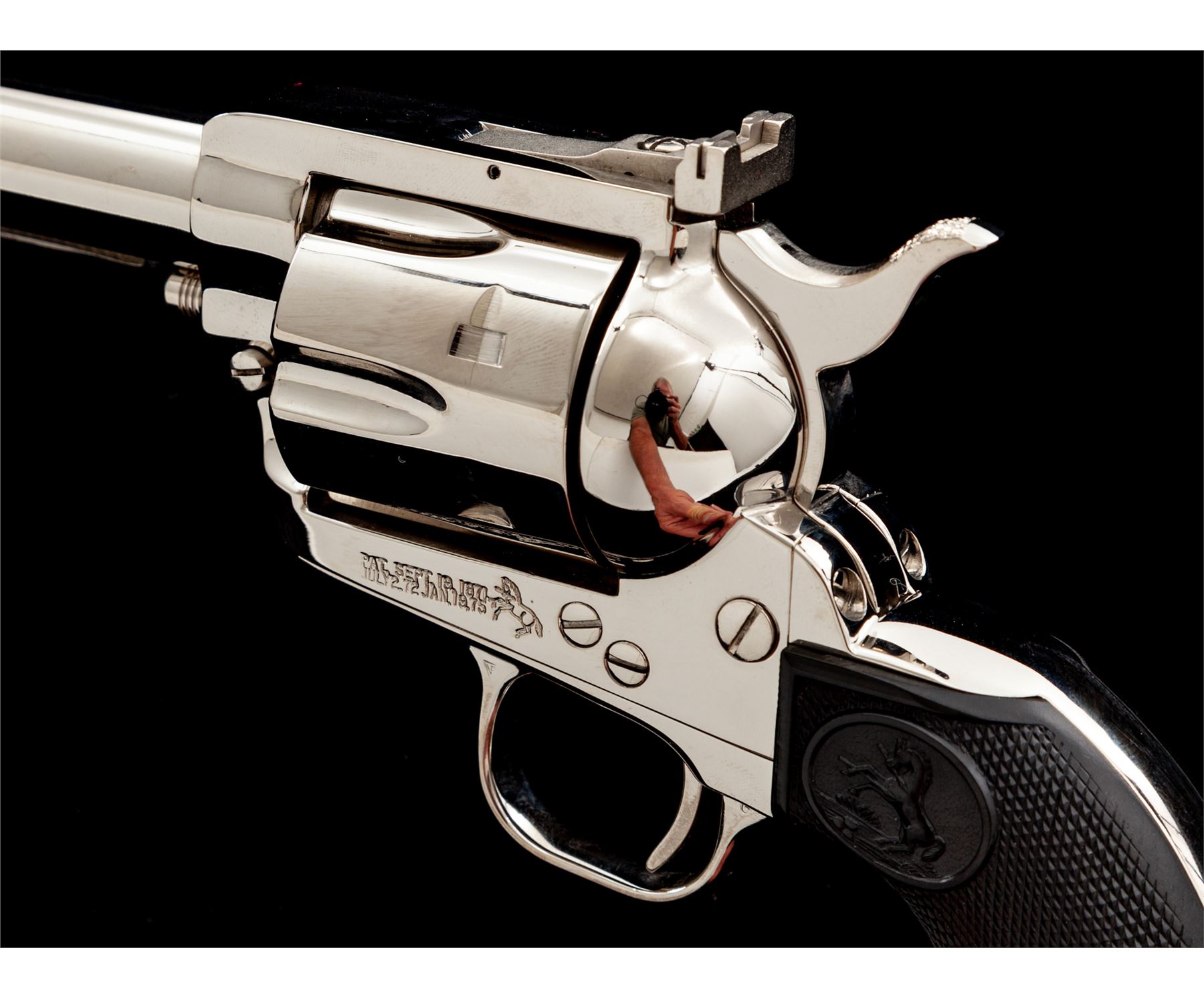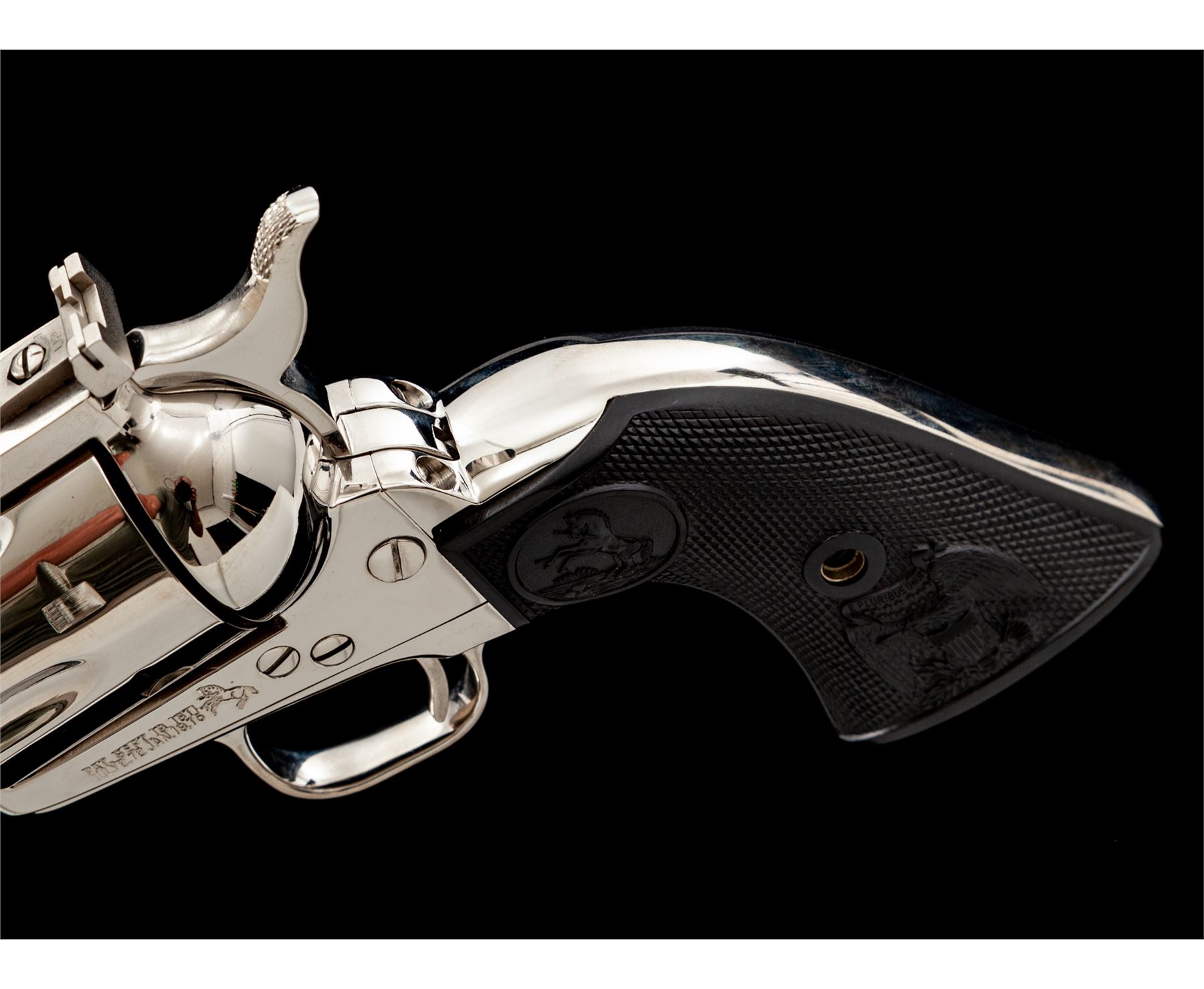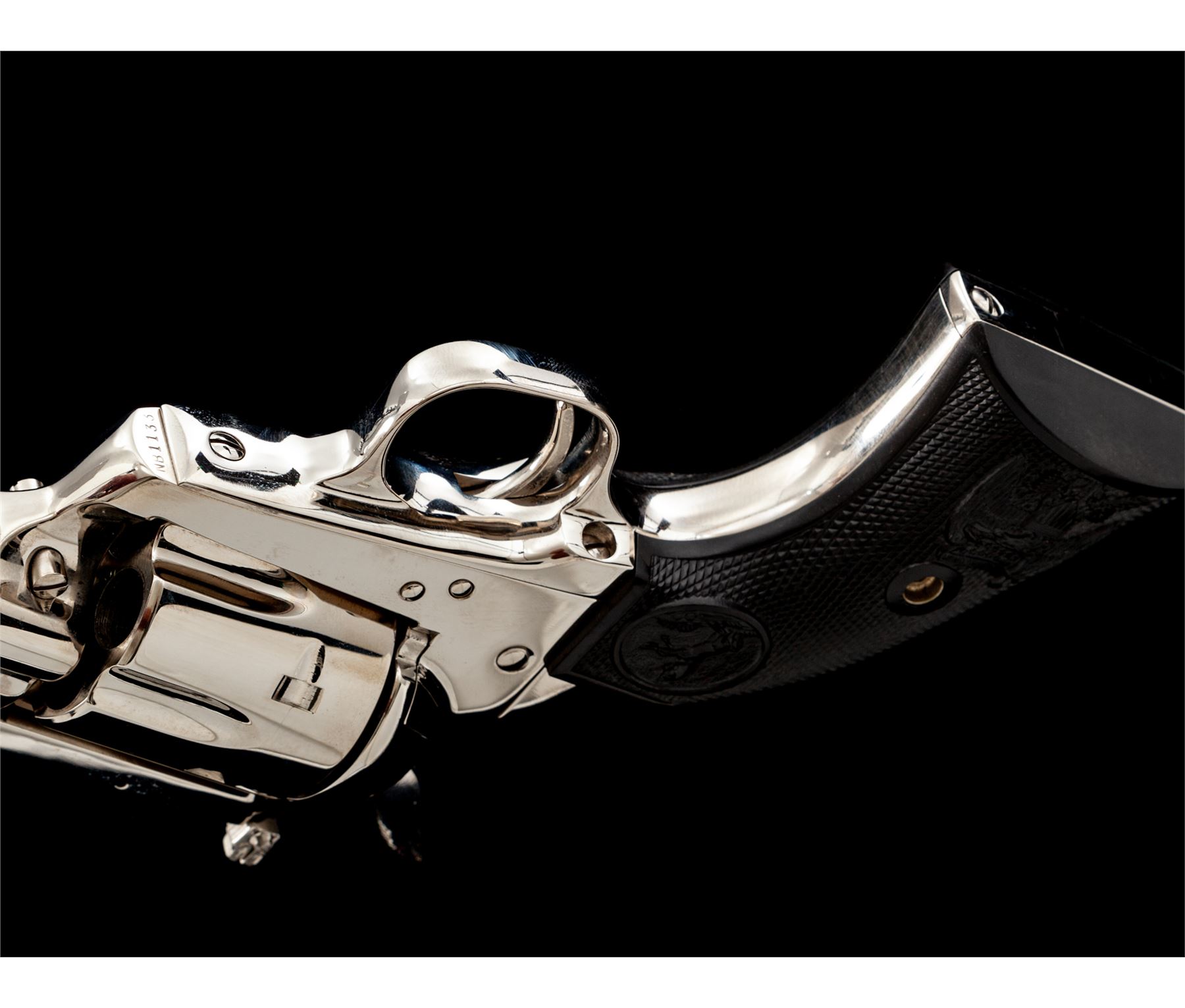 Cased Colt Ned Buntline Commemorative Single Action Revolver, #NB1133, .45 LC cal., 12'' barrel, bright nickel finish, factory checkered black plastic eagle grips with ''Rampant Colt'', tall blade front sight, square notched fully adjustable rear sight. Left side of barrel is marked ''NED BUNTLINE COMMEMORATIVE''. In wood display case with glass insert, fitted burgundy colored interior, and Ned Buntline plaque. Condition overall is excellent, appearing unfired. Metal with a few very minor handling marks; cylinder with only a slight index line. Factory lettering is crisp and clear. Grips appear as new. Wood display case with scattered light scratches and storage wear and the exterior rates very good overall; interior is excellent. 1 of 3,000 Ned Buntline Commemoratives mfg'd in 1979. Est.: $1,000-$1,500. (C&R/PPT)