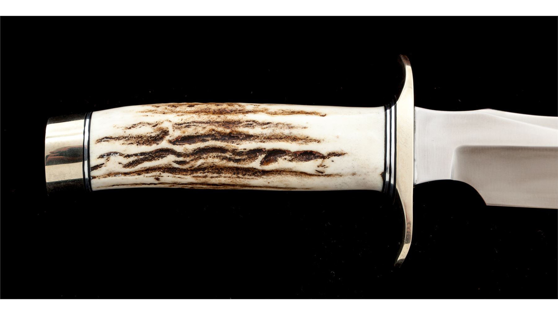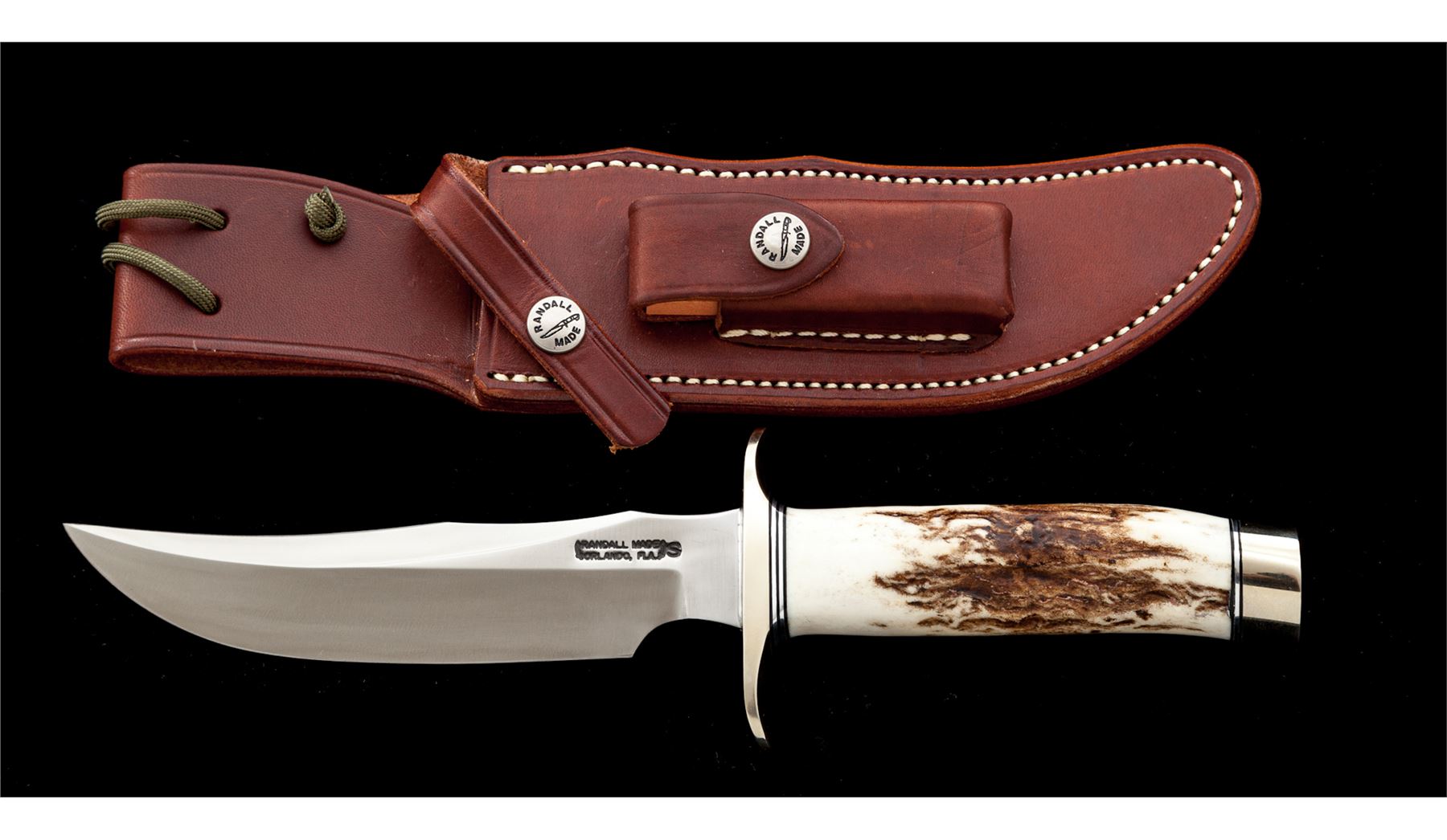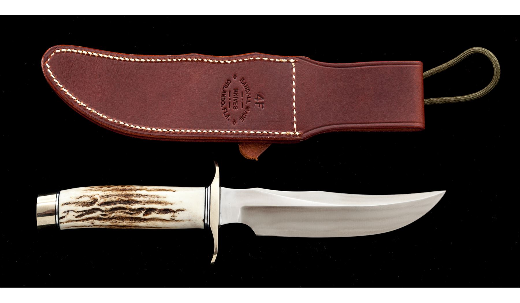 Randall Model 4-6 ''Fighter'' Fixed Blade Knife, with sheath, 6'' blade with standard Randall stainless logo; 10-7/8'' overall length. Stag handle with nickel silver double hilt and duralumin pommel cap with black and silver spacers. In brown leather ''4F'' Randall sheath stamped on backside with Randall logo and ''4F'', with ''Randall Made'' snaps and unmarked salmon-colored sharpening stone. In excellent overall condition, never carried or sharpened. Hilt and pommel cap with a few minor handling marks. Sheath is excellent. Est.: $450-$600.