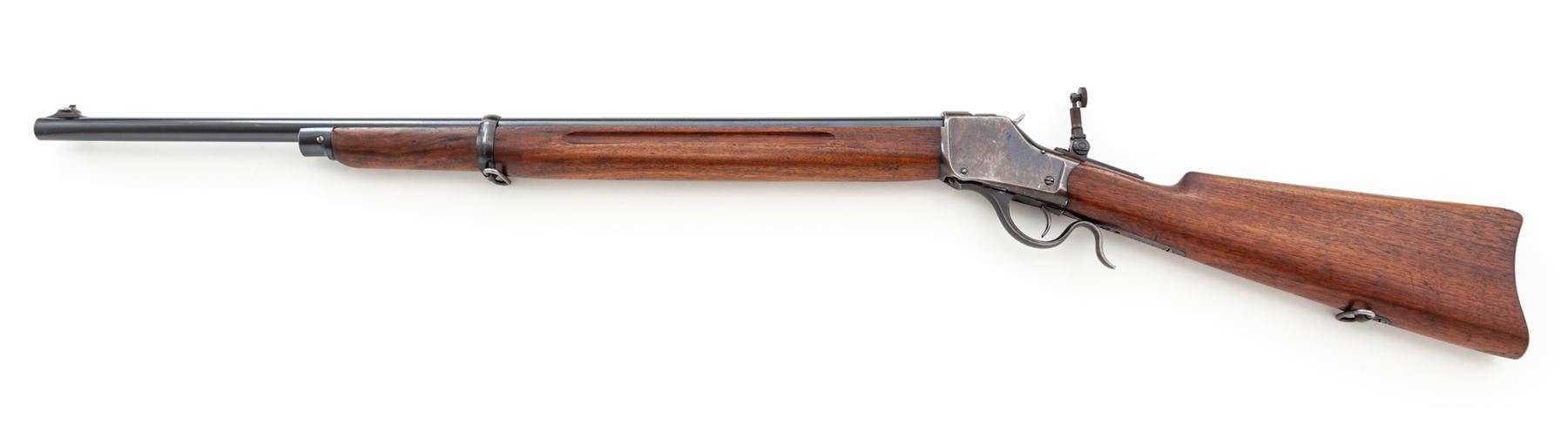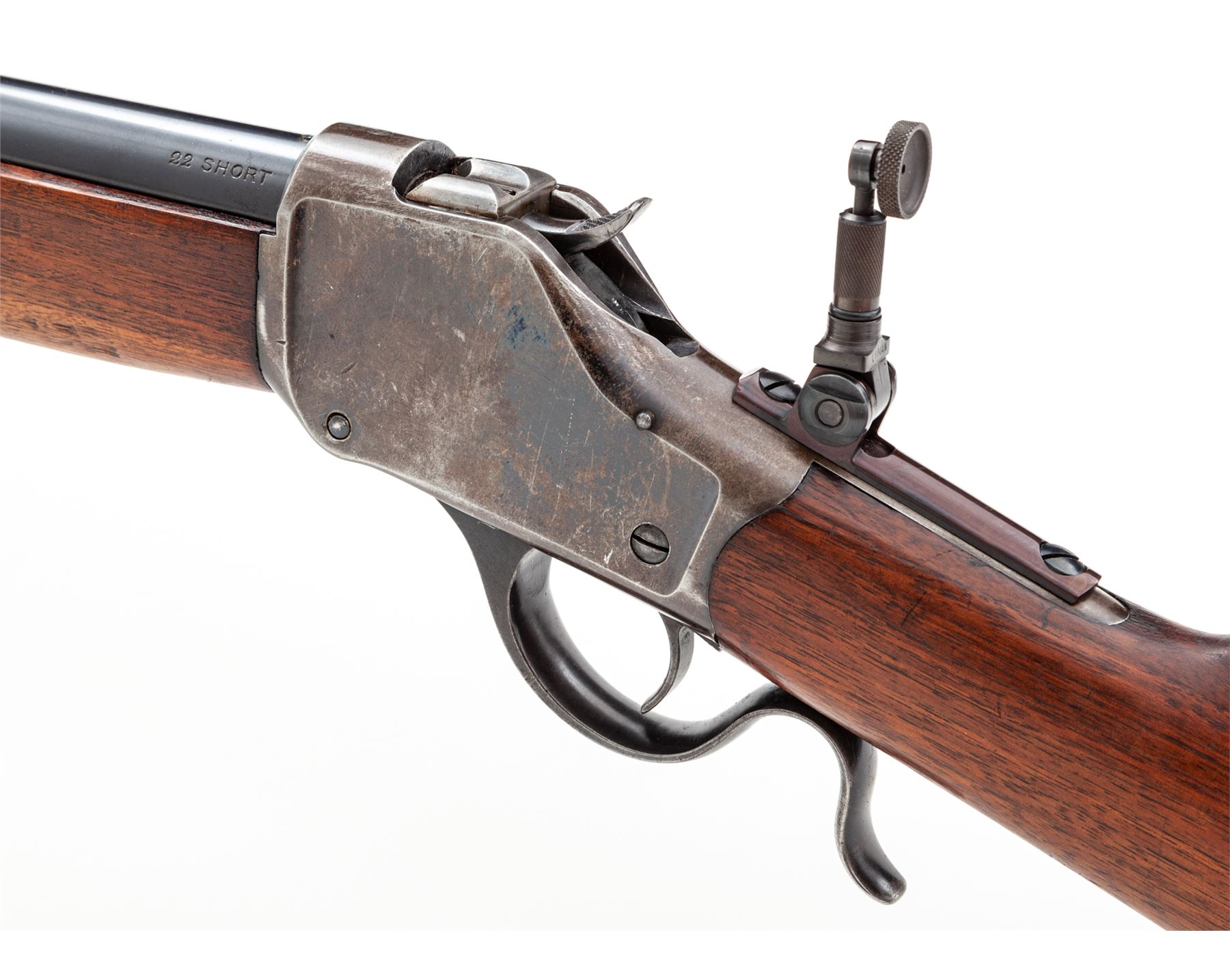 Winchester Winder Musket Single Shot Rifle, #121682, .22 Short cal., 28'' barrel, blue finish, finger-grooved 3/4-length walnut stock and handguard, with sling swivels and slightly more modern tang sight. Mfg'd prior to 1920. Condition is very good. Barrel retains approx. 95% blue; frame with 30% flaking blue remaining. Stock and forend are fine with mild impressions and light wear. Good action, fine bore. Est.: $600-$800. (C&R)