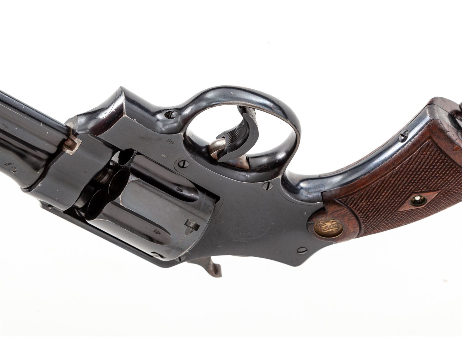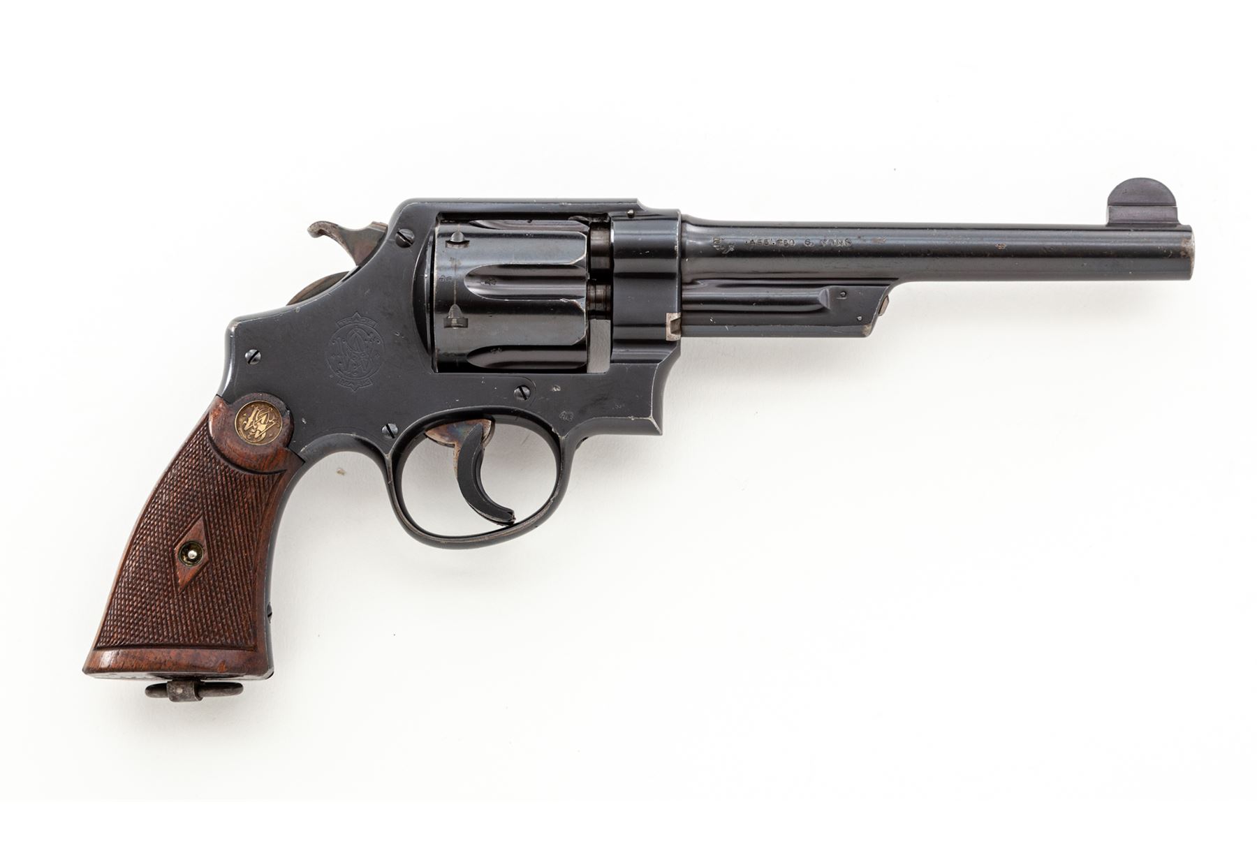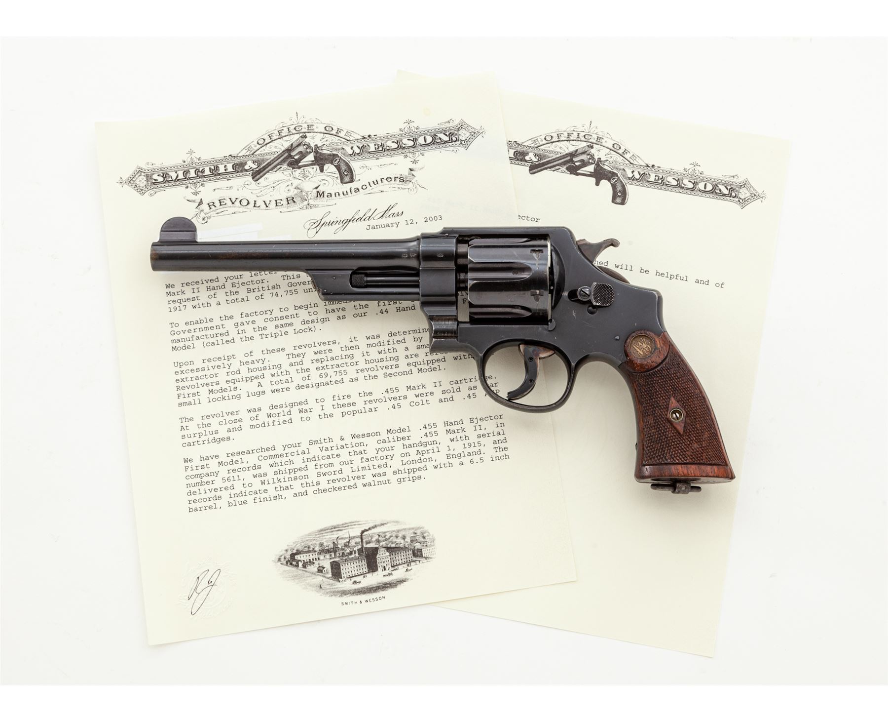 Smith & Wesson 1st Model Hand Ejector Double Action Revolver (Triplelock), #5611, .455 cal., 6.5'' barrel, blue finish, unmarked factory diamond checkered walnut grips with brass S&W medallions and lanyard loop in butt, fixed sights, with matching numbered cylinder and barrel. Shipped April 1, 1915, to Wilkinson Sword, Ltd., London, England, with factory letter signed by S&W Historian Roy G. Jinks. Factory letter verifies blue finish, 6.5'' barrel, and checkered walnut grips. Condition is fine to near excellent retaining approx. 90% thinning factory blue, with ''(crown)/V'' proofmarks, as well as London proofmarks, to frame, barrel and cylinder. Mid-1950's Release from British Service markings to right side of barrel. Trigger with added trigger shoe. Grips with some wear. Good action, bright bore. Est.: $1,800-$2,400. (C&R/PPT)