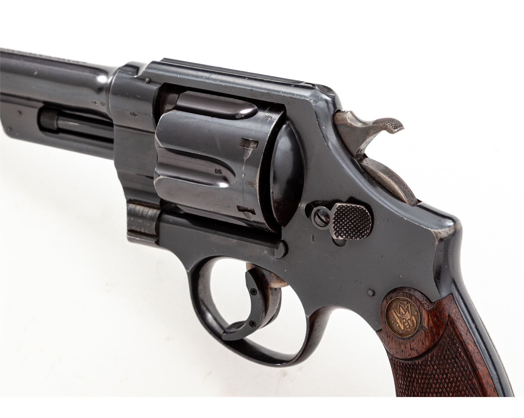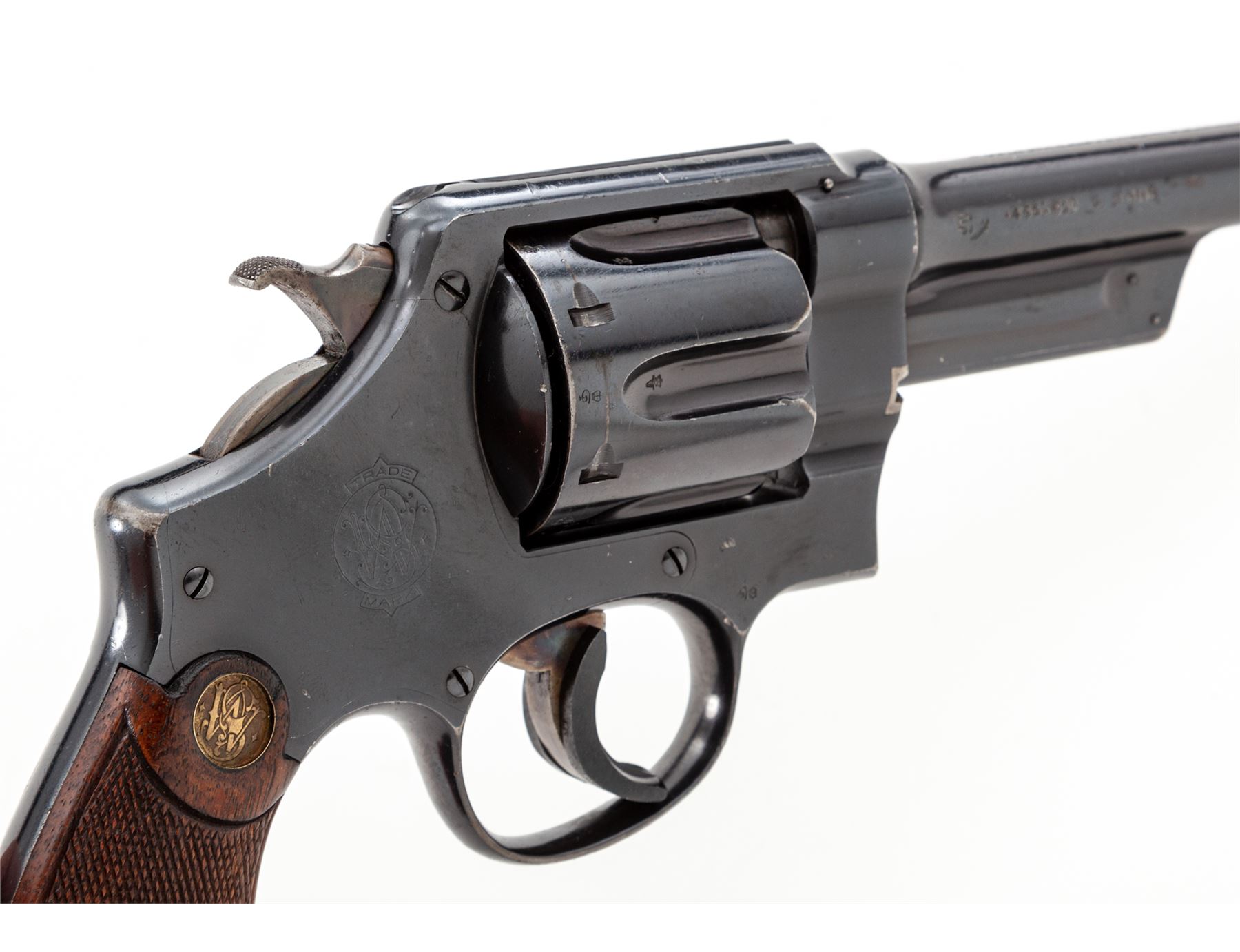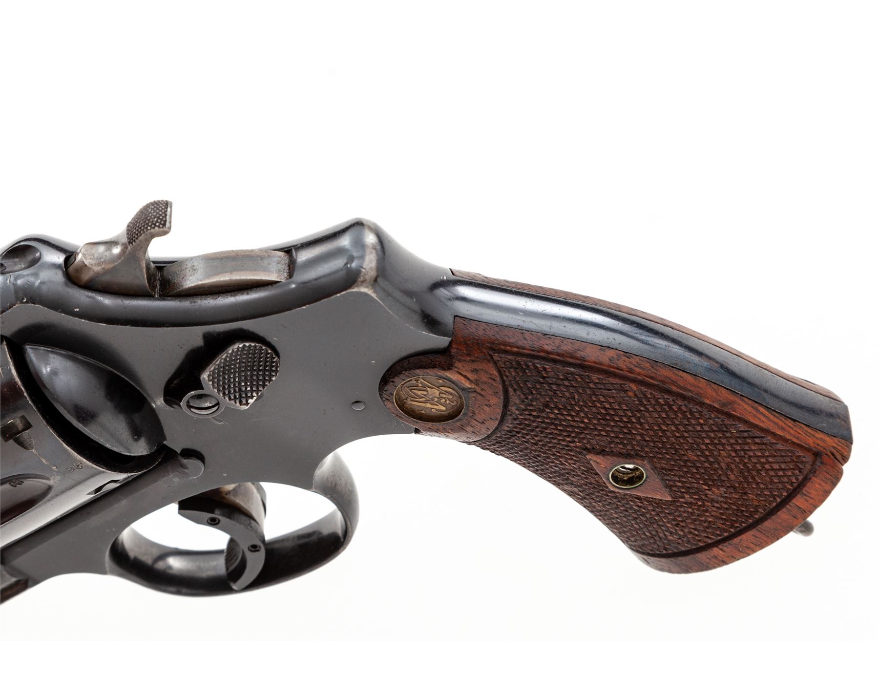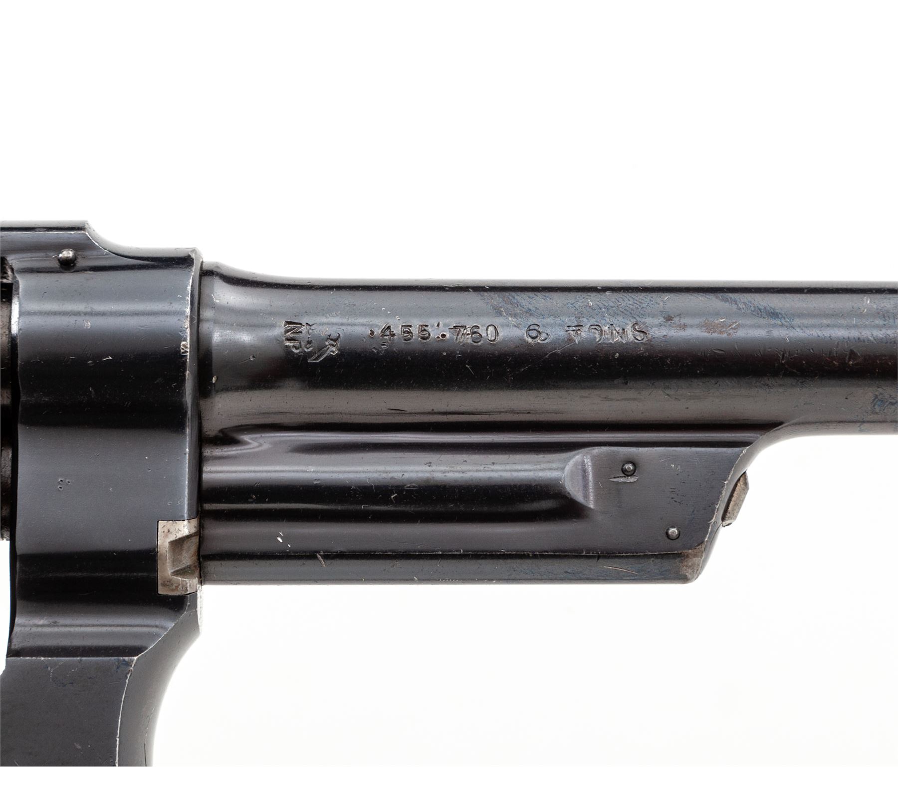 Smith & Wesson 1st Model Hand Ejector Double Action Revolver (Triplelock), #5611, .455 cal., 6.5'' barrel, blue finish, unmarked factory diamond checkered walnut grips with brass S&W medallions and lanyard loop in butt, fixed sights, with matching numbered cylinder and barrel. Shipped April 1, 1915, to Wilkinson Sword, Ltd., London, England, with factory letter signed by S&W Historian Roy G. Jinks. Factory letter verifies blue finish, 6.5'' barrel, and checkered walnut grips. Condition is fine to near excellent retaining approx. 90% thinning factory blue, with ''(crown)/V'' proofmarks, as well as London proofmarks, to frame, barrel and cylinder. Mid-1950's Release from British Service markings to right side of barrel. Trigger with added trigger shoe. Grips with some wear. Good action, bright bore. Est.: $1,800-$2,400. (C&R/PPT)