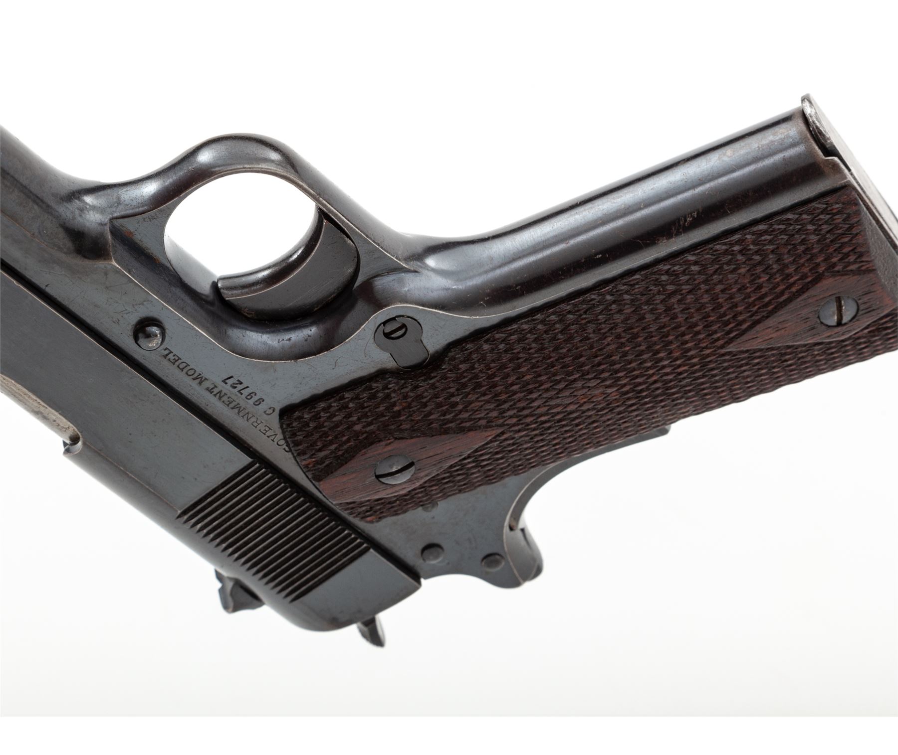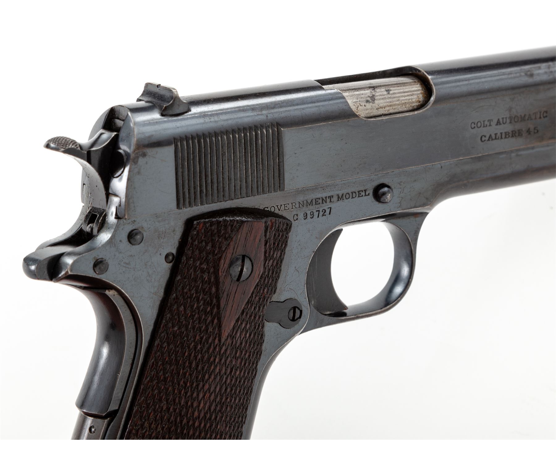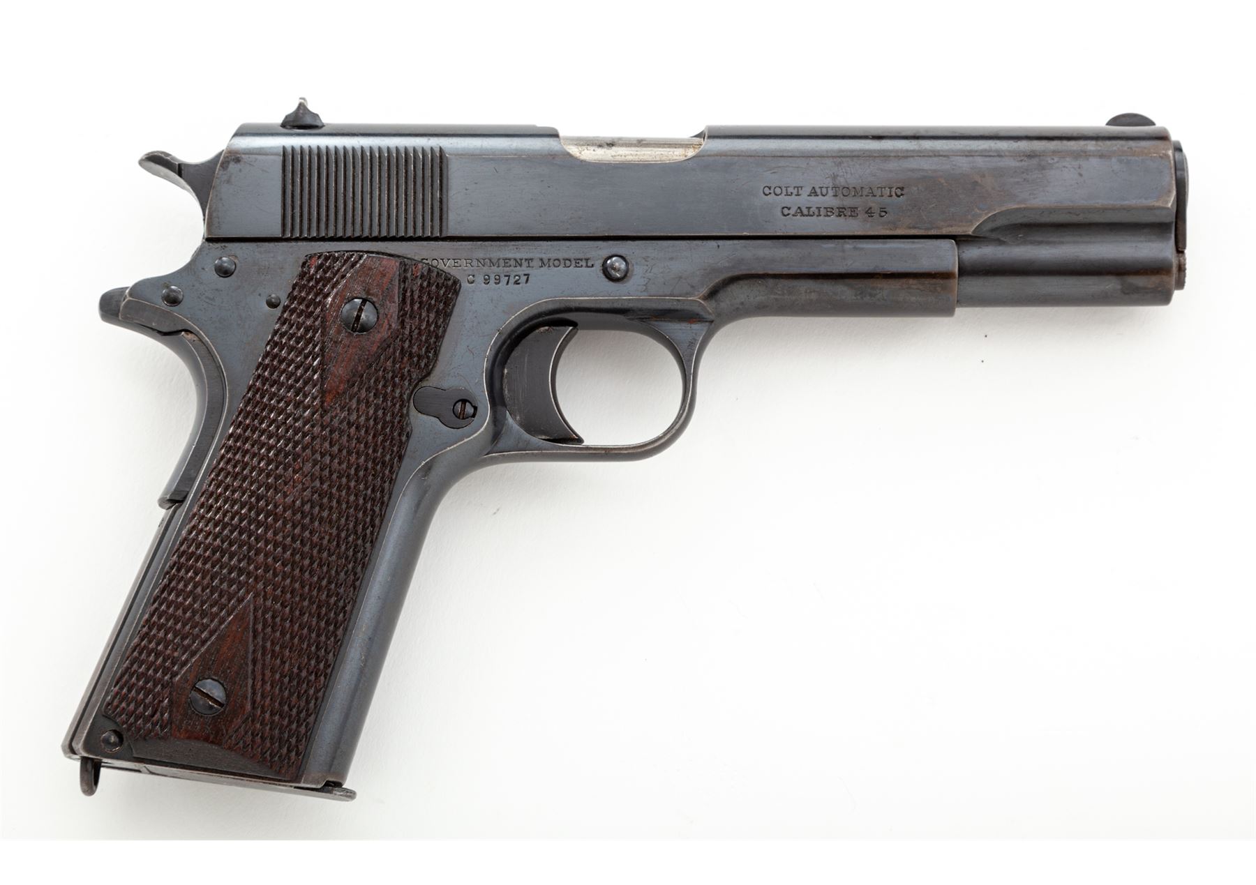 Colt Government Model Semi-Automatic Pistol, #C99727, .45 ACP cal., 5'' barrel, blue finish, factory checkered walnut grips, with one correct two-tone loopless magazine. Mfg'd 1918. Condition is very good retaining approx. 85%-90% lightly thinning blue, with some staining to slide. Strong front strap with approx. 75% blue remaining on mainspring housing. Grips with light flattening. Good action, bright bore. Est.: $2,000-$3,000. (C&R/PPT)