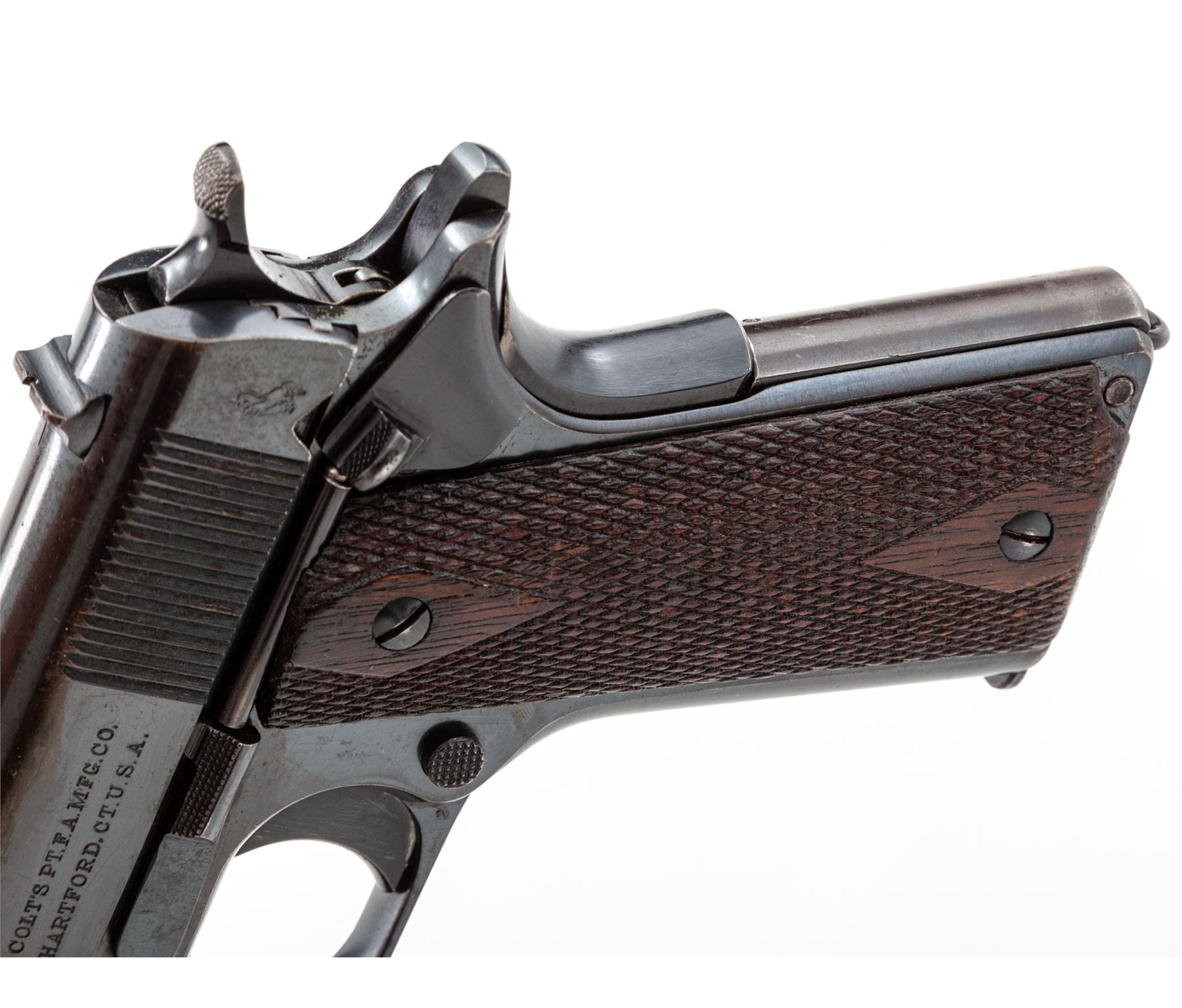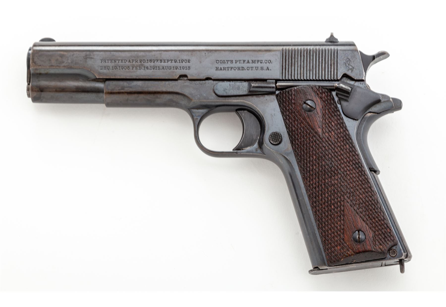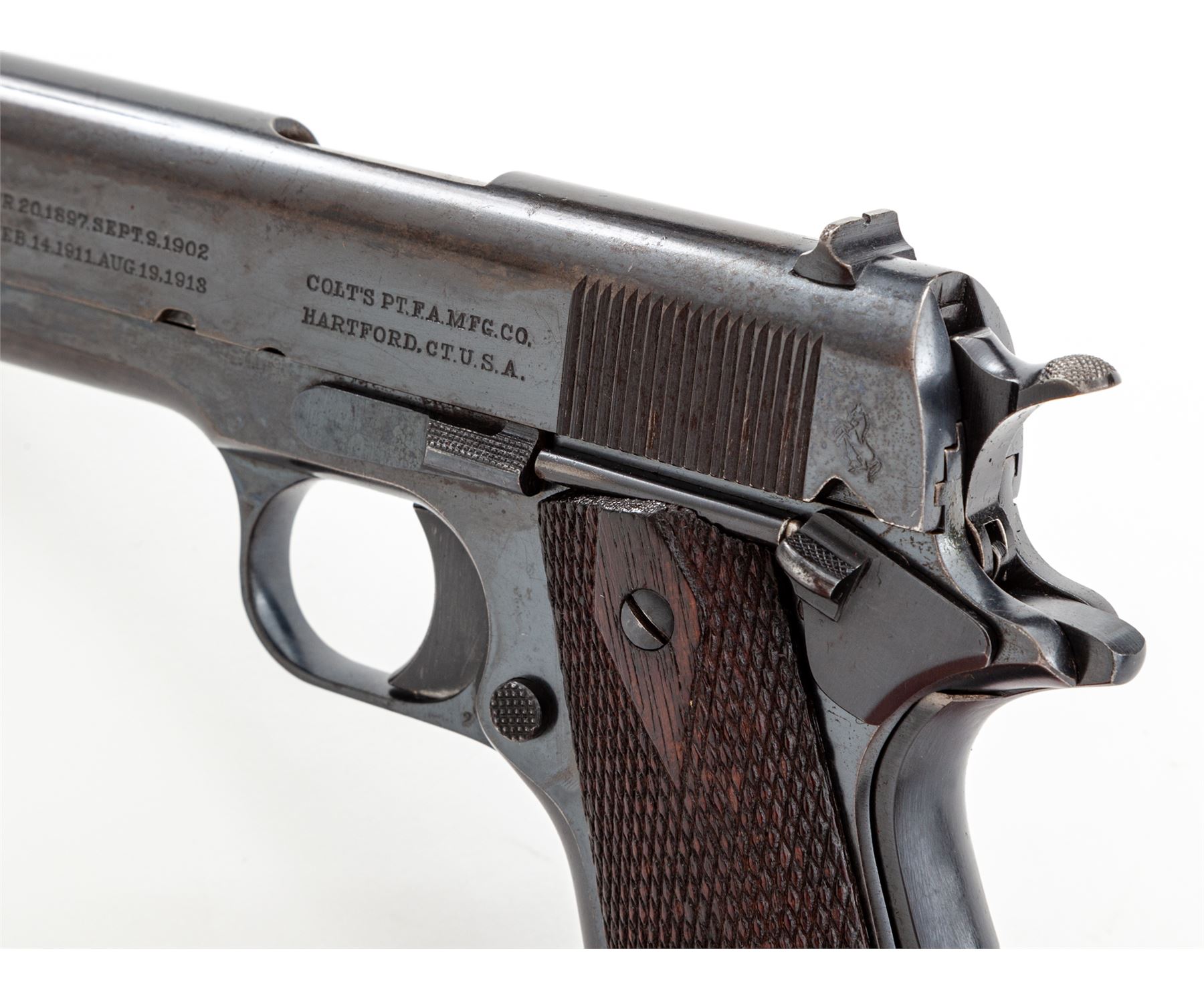 Colt Government Model Semi-Automatic Pistol, #C99727, .45 ACP cal., 5'' barrel, blue finish, factory checkered walnut grips, with one correct two-tone loopless magazine. Mfg'd 1918. Condition is very good retaining approx. 85%-90% lightly thinning blue, with some staining to slide. Strong front strap with approx. 75% blue remaining on mainspring housing. Grips with light flattening. Good action, bright bore. Est.: $2,000-$3,000. (C&R/PPT)