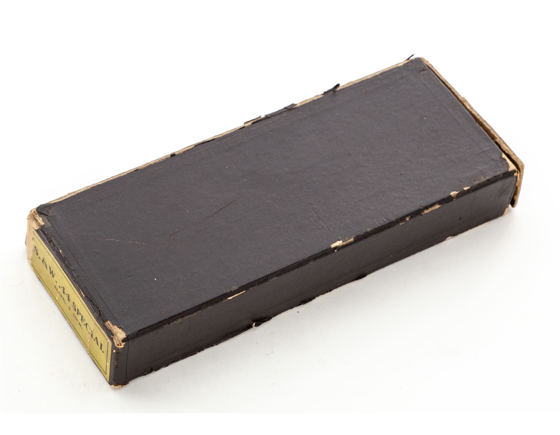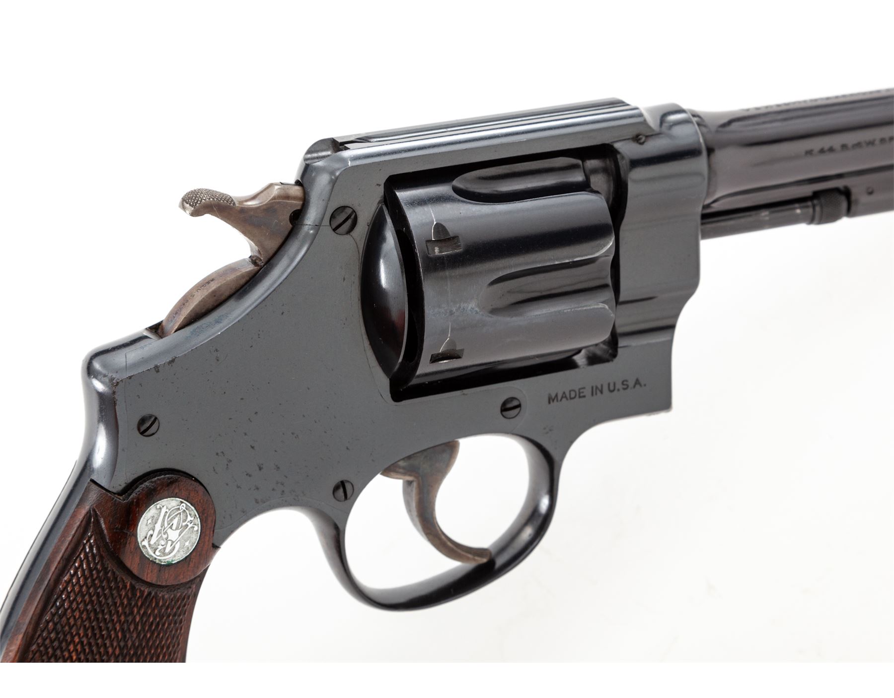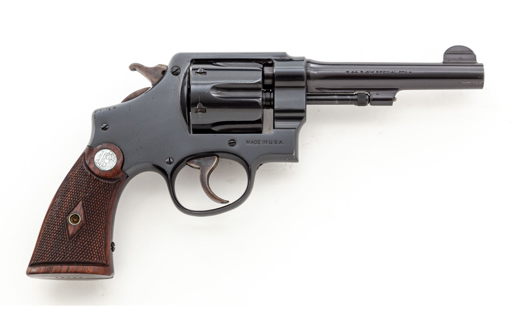 Smith & Wesson 2nd Model Hand Ejector Double Action Revolver, #45444, .44 Spec. cal., 5'' barrel, blue finish, matching numbered factory diamond checkered walnut grips with bright S&W medallions, fixed sight, with matching numbered cylinder and barrel. Shipped July 1, 1935, to Bush Caldwell Co., Little Rock, AR, with factory letter signed by S&W Historian Roy G. Jinks. In non-matching period correct factory tip-up box with instructions and green end label. Condition is excellent retaining approx. 96% lightly thinning factory blue, with most of the losses at muzzle and very thin index line to cylinder. Very light thinning at topstrap, with one small area near sight groove of finish loss. Very strong front and back strap. Sideplate with minor speckling, as well as thinning in actioning areas. Grips are very crisp, as is action and bore. Box with some separation, edgewear, and tape repair; end label is 90% present. Est.: $1,500-$2,000. (C&R/PPT)