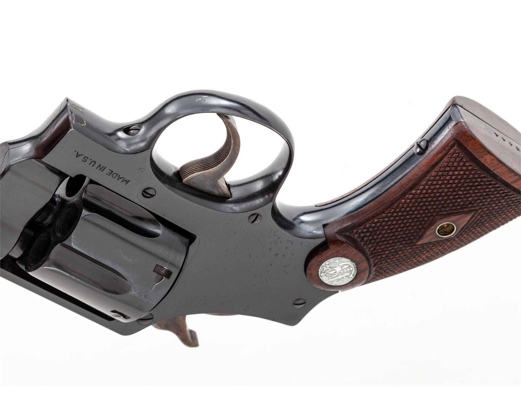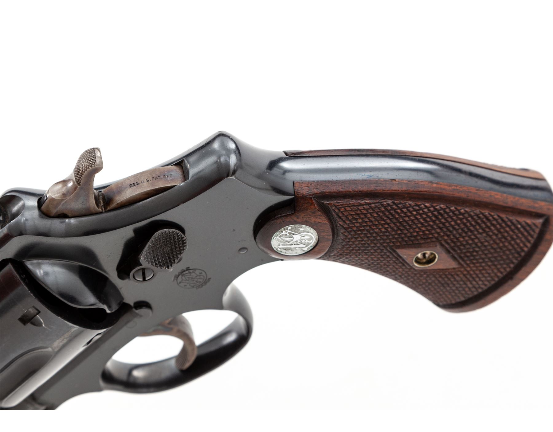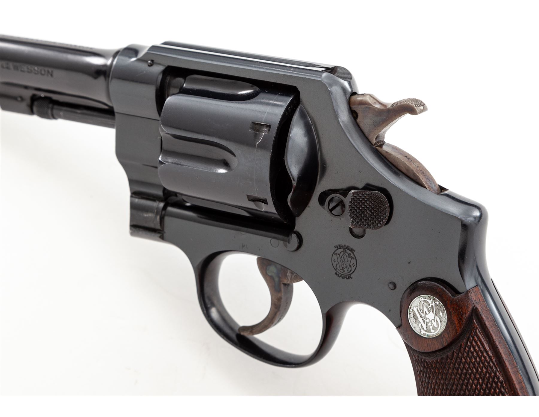 Smith & Wesson 2nd Model Hand Ejector Double Action Revolver, #45444, .44 Spec. cal., 5'' barrel, blue finish, matching numbered factory diamond checkered walnut grips with bright S&W medallions, fixed sight, with matching numbered cylinder and barrel. Shipped July 1, 1935, to Bush Caldwell Co., Little Rock, AR, with factory letter signed by S&W Historian Roy G. Jinks. In non-matching period correct factory tip-up box with instructions and green end label. Condition is excellent retaining approx. 96% lightly thinning factory blue, with most of the losses at muzzle and very thin index line to cylinder. Very light thinning at topstrap, with one small area near sight groove of finish loss. Very strong front and back strap. Sideplate with minor speckling, as well as thinning in actioning areas. Grips are very crisp, as is action and bore. Box with some separation, edgewear, and tape repair; end label is 90% present. Est.: $1,500-$2,000. (C&R/PPT)