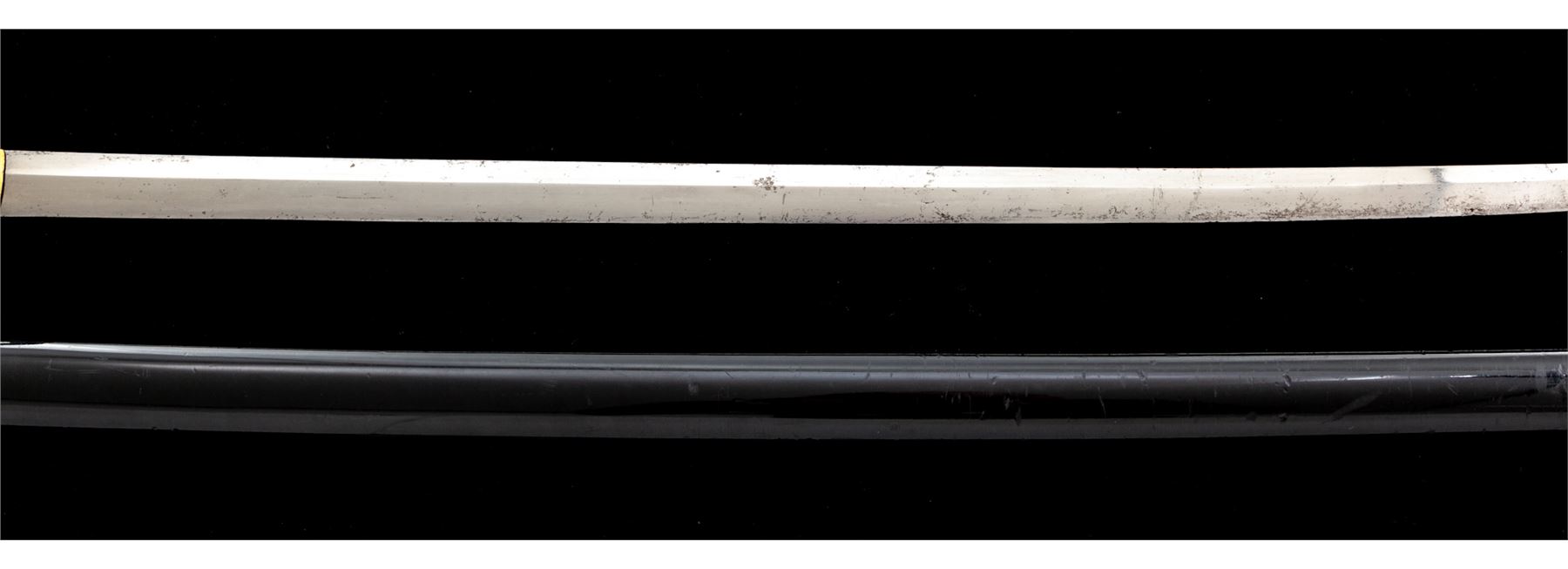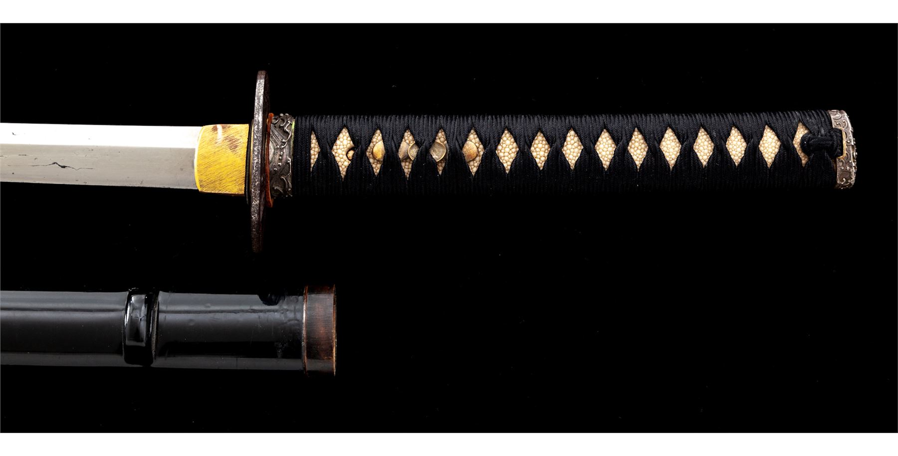 Antique Japanese Katana Sword. Traditionally mounted Japanese samurai long sword with a 27'' shinogi-zukuri style blade. Straight type temper line is a bit hard to see. Blade has some openings in the grain and few small edge nicks. Unsigned tang with two holes. Gold plated over copper habaki collar. Unsigned tsuba guard is iron and decorated with a scene of a god in the clouds. Handle fittings are a silver colored wave design, are a matched set, and unsigned. Handle is covered in rayskin and wrapped with a black silk cord. Menuki are three clam shells done in silvered brass. Saya scabbard is black lacquer showing numerous dents and scuffs, and retains almost all of the painted finish. Blade circa 1660 to 1700's. Est.: $800-$1,500.